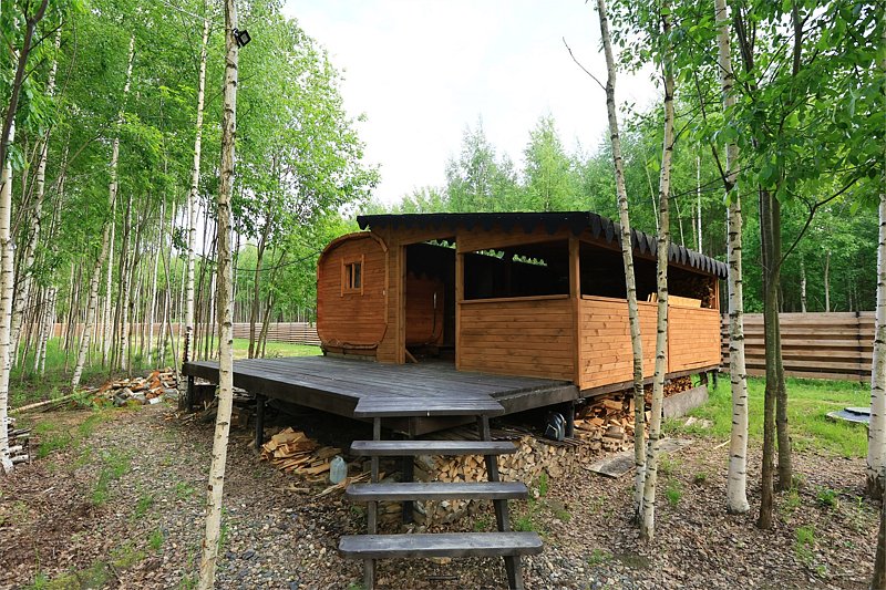 Читать полностьюЯпонская баня Фурако, расположенная рядом с домами А-фрейм, представляет собой небольшую купель, выполненную в форме бочки, которая способна вместить до четырех человек. Купель наполняется теплой водой с температурой 35–45°C, которая нагревается с помощью дровяной печи.