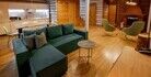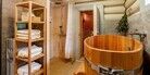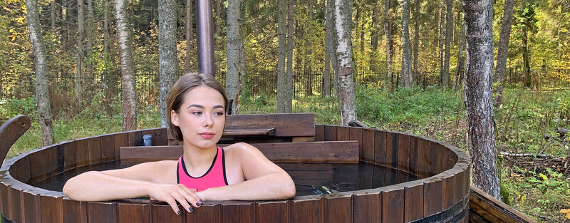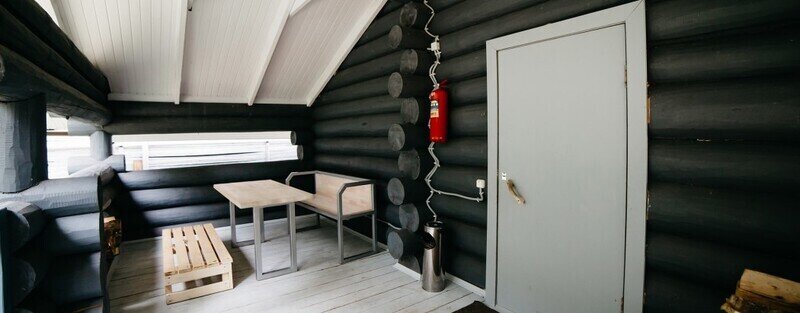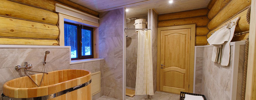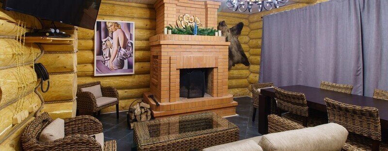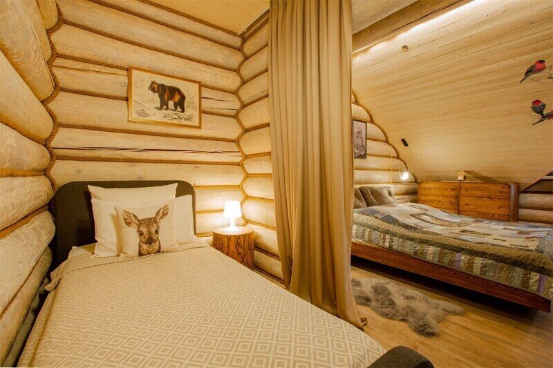На первом этаже расположена уютная гостиная, парная, купель, душевая кабина, санузел, открытая веранда; на втором этаже две комнаты: в одной комнате двуспальная кровать, во второй — полутороспальная.