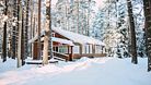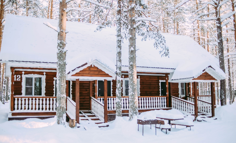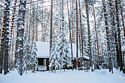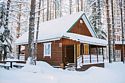 В сосновом бору на территории загородного комплекса живописно расположены деревянные домики.
