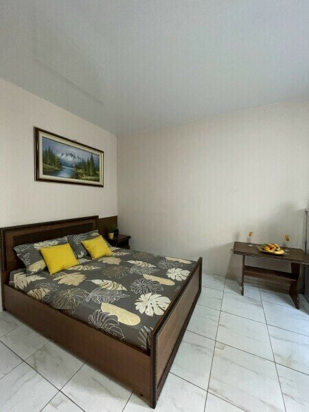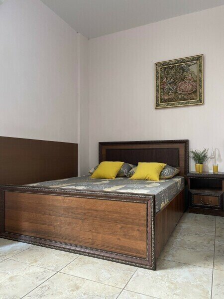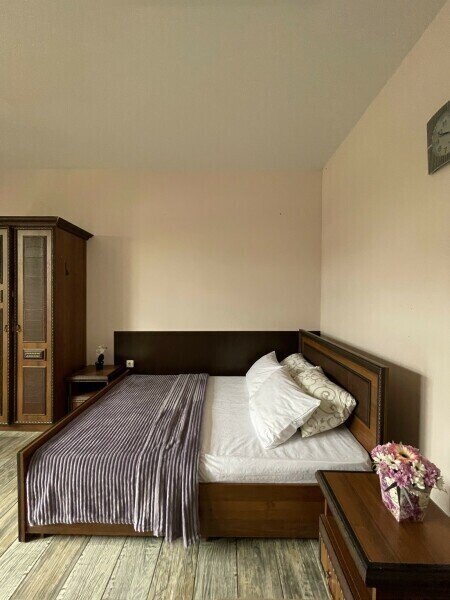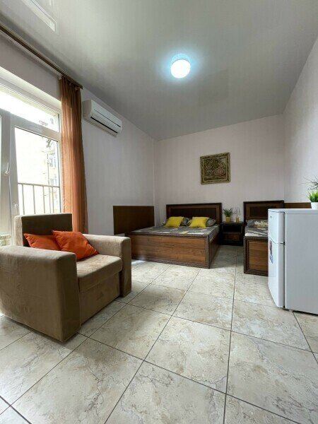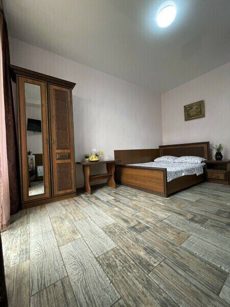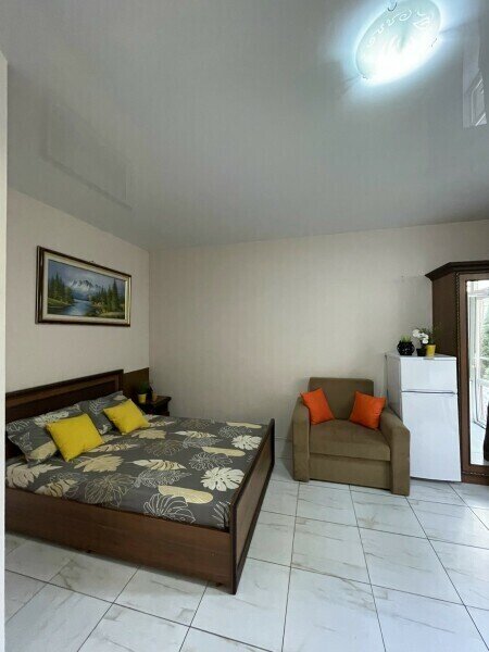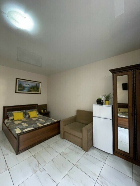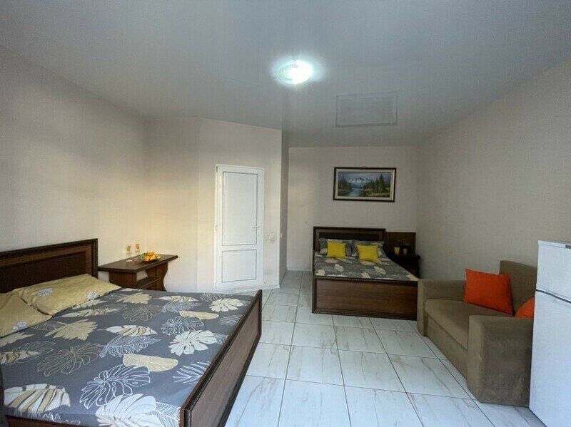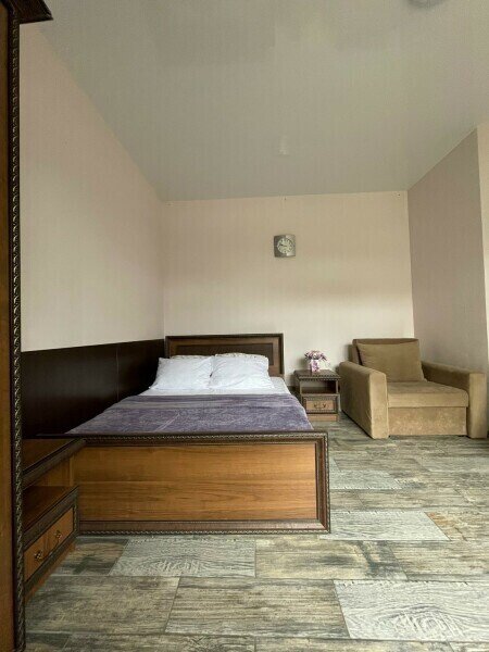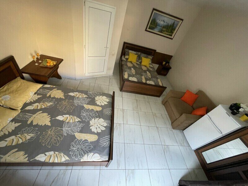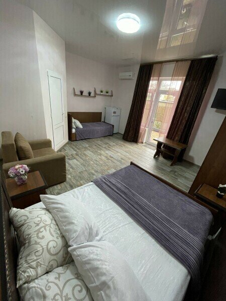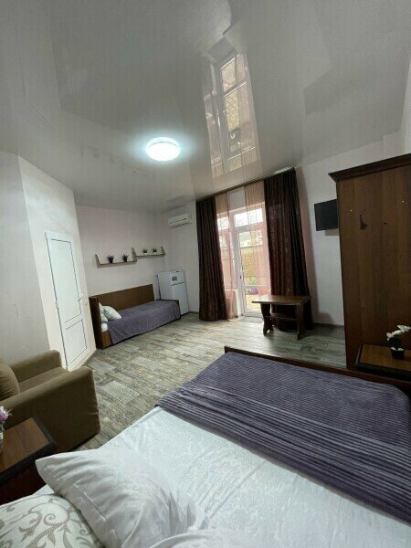 Просторный 4-х местный номер на 1 м этаже с отдельным входом. Спальные места представлены двуспальной кроватью, односпальной кроватью и дополнительным местом — кресло-кроватью.