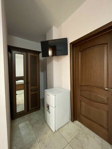 В номере телевизор, холодильник, кондиционер, шкаф, прикроватная тумбочка.