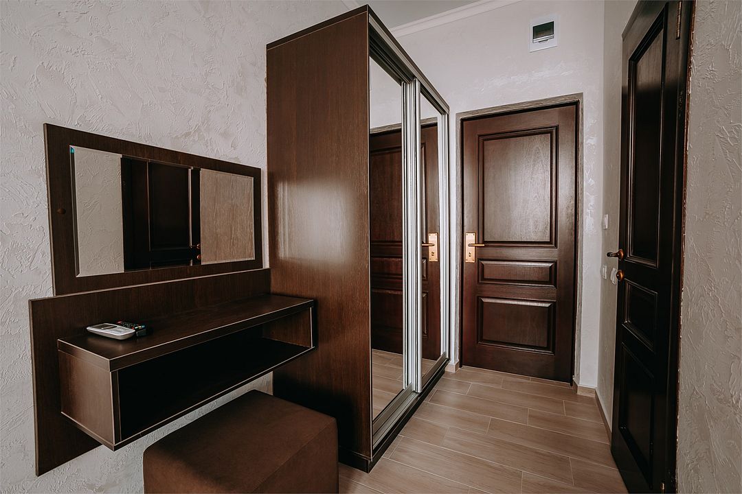 Wi-Fi, кондиционер, фен, электронные замки, душевая кабина, банные полотенца, гигиенические средства, балкон, две односпальные или большая двуспальная кровать, сейф, кулер на этаже, вид во двор, мини-холодильник, шкаф-купе, вид на бассейнВ гостиничном номере