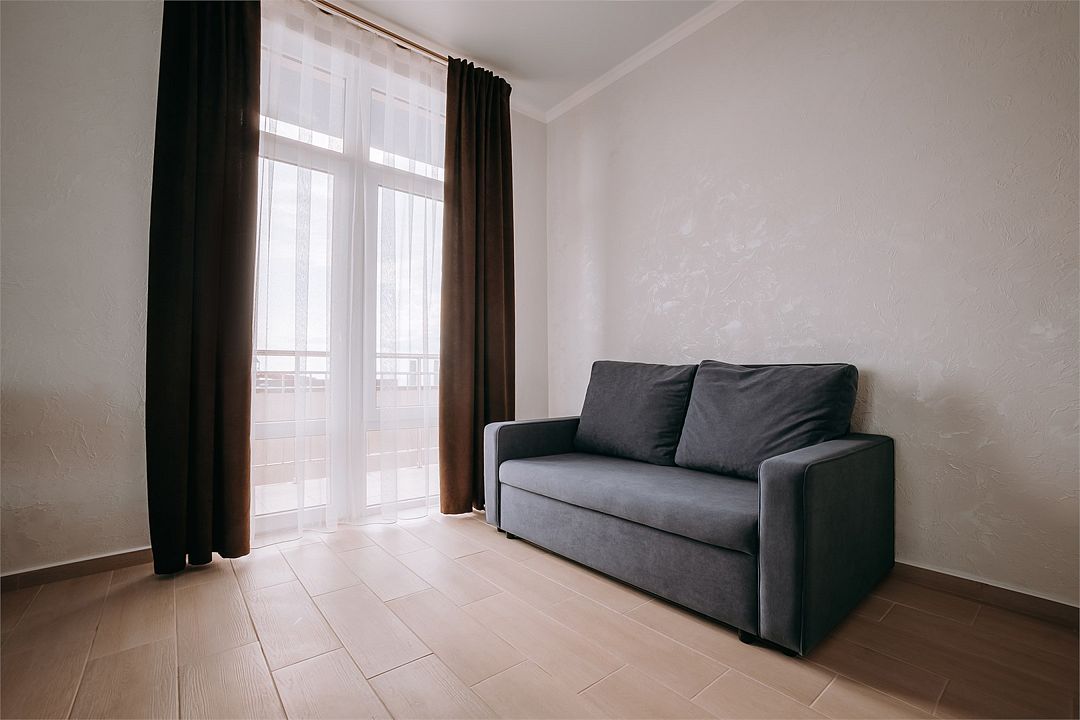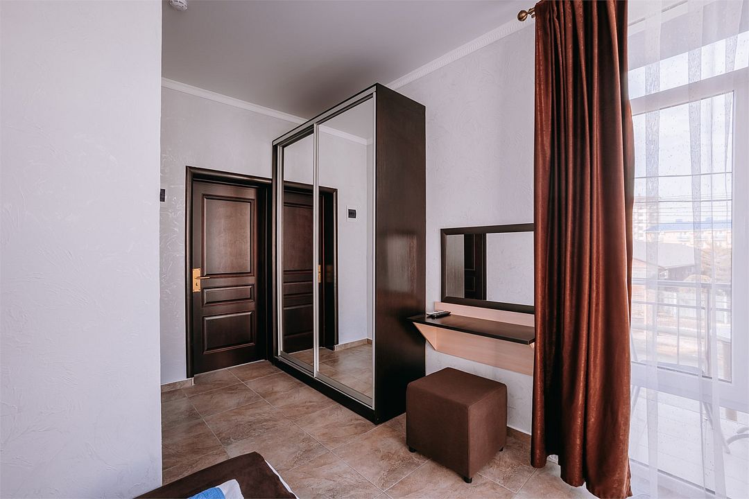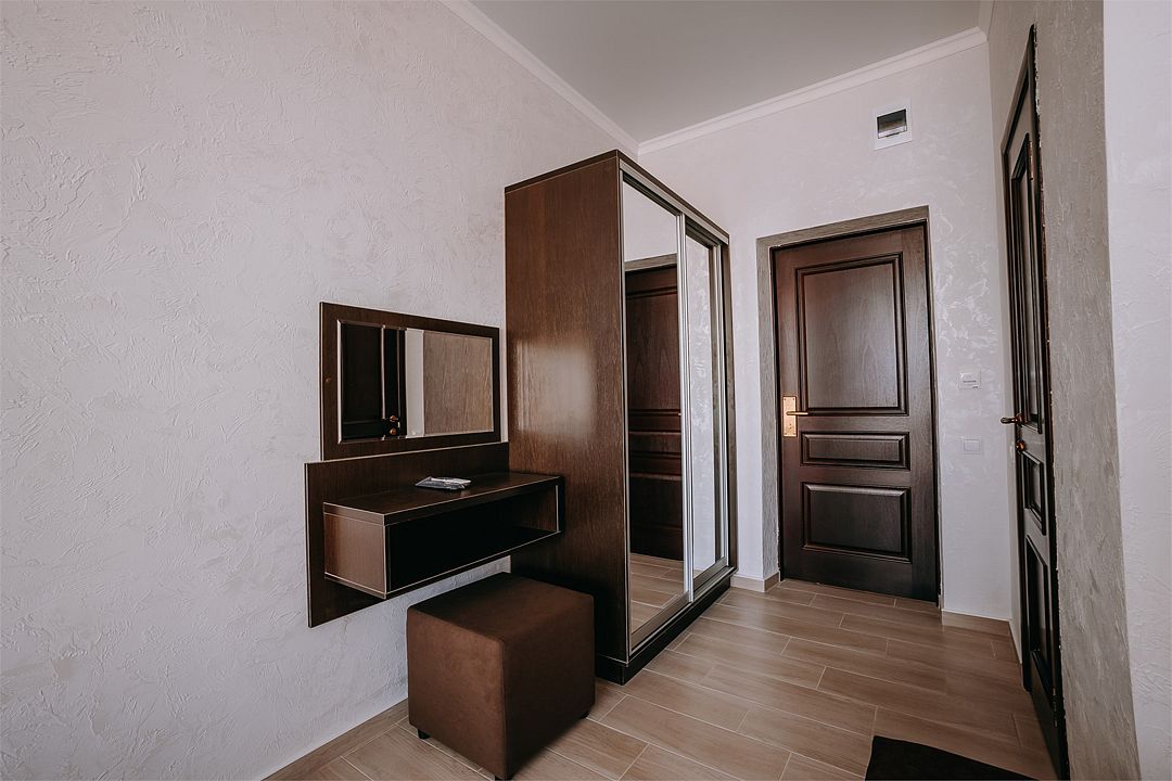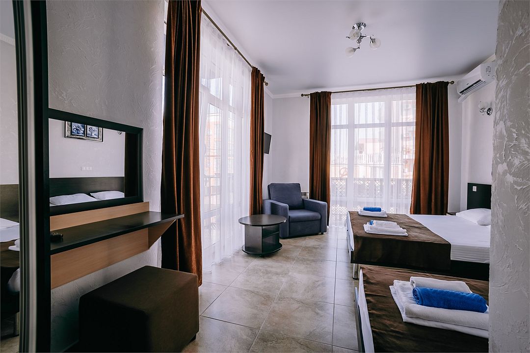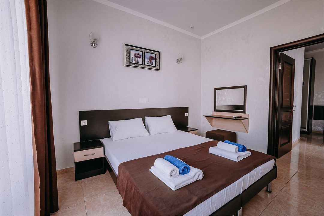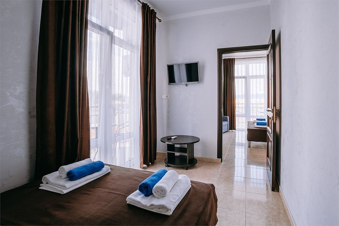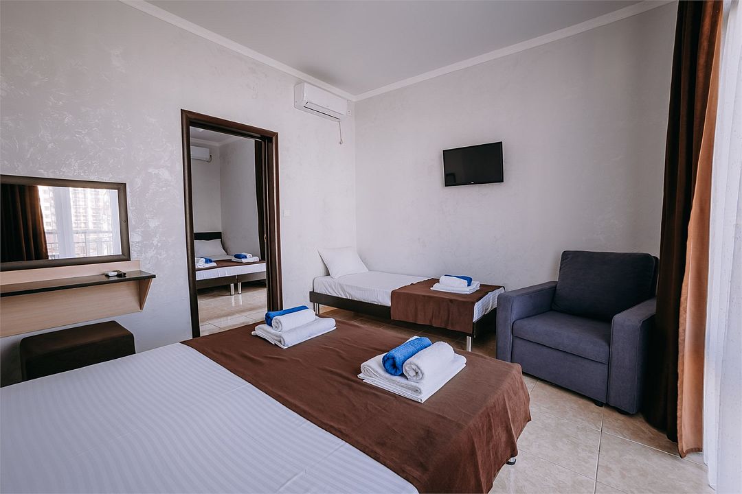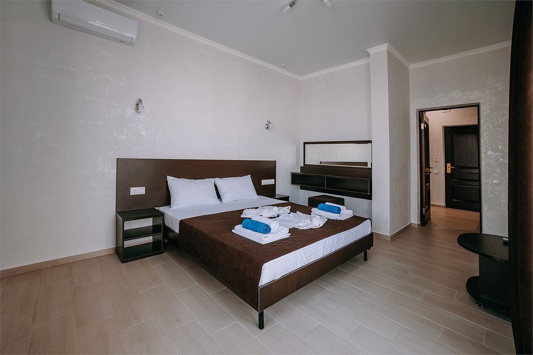 Улучшенный двухкомнатный люкс с двумя изолированными комнатами . Площадь данного номера 55 кв . С видом на море .Услуги и удобства