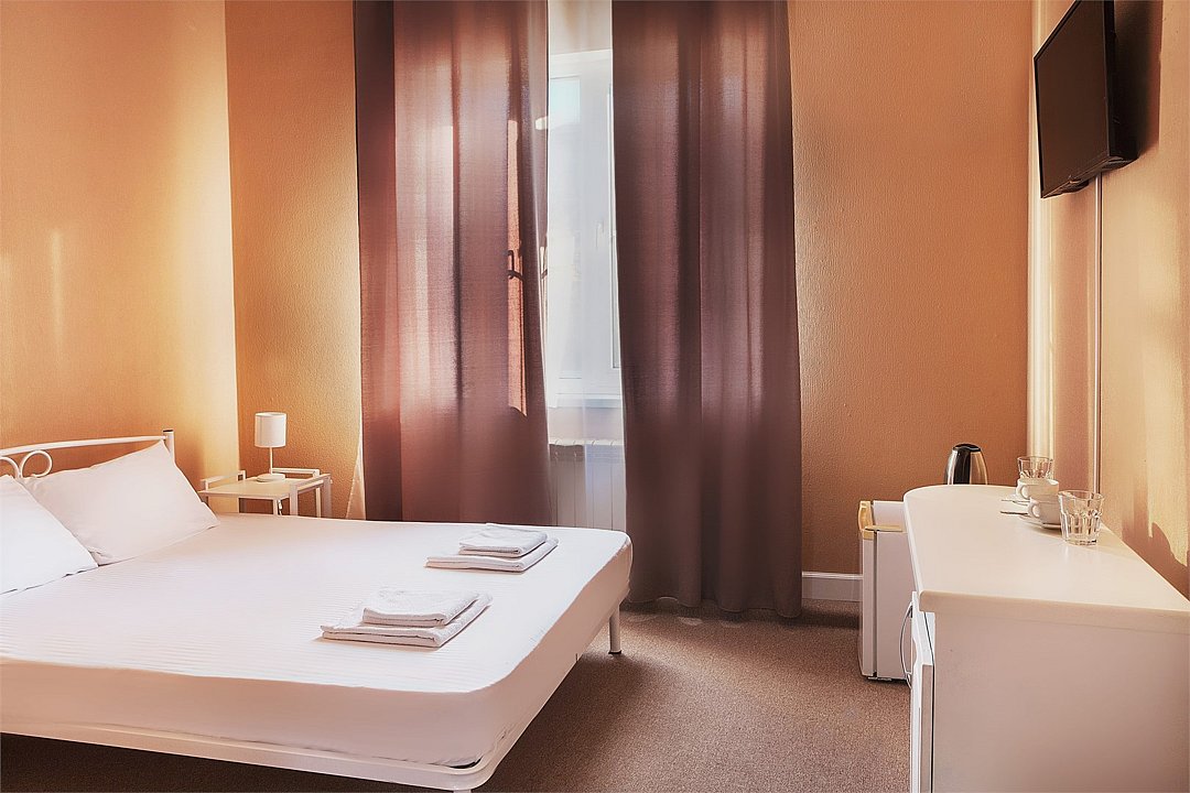 Двухместный номер с двуспальной кроватью и собственным санузлом.Услуги и удобства