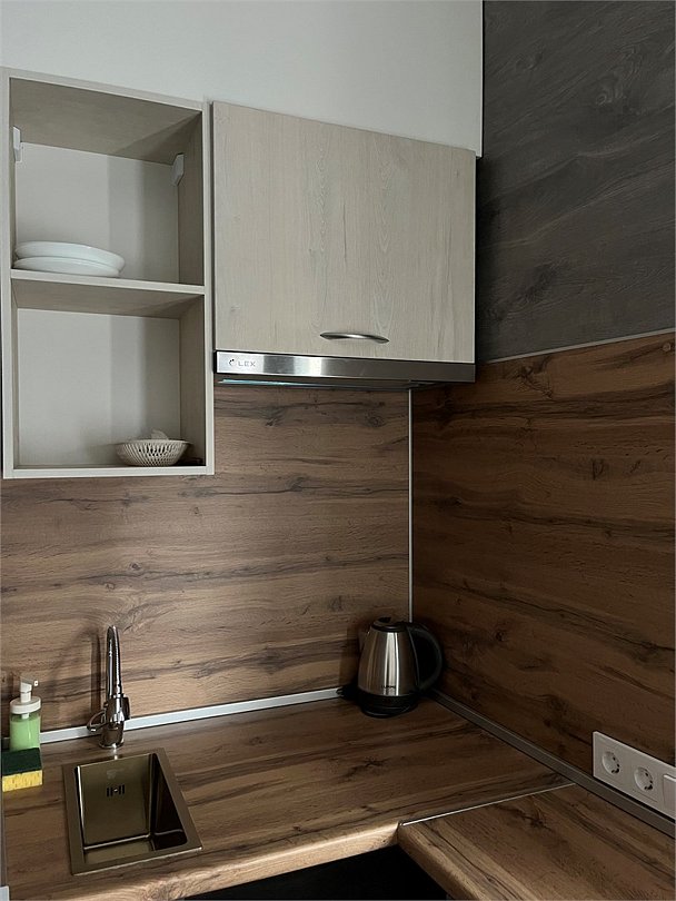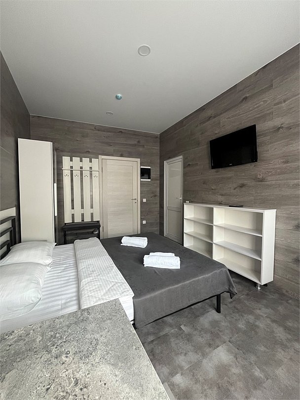 Комфортный и стильный двухместный номер с мини-кухней. Расположен в 30-ти метрах от основного корпуса. В стоимость проживания входит посещение горечей русской баней и открытого подогреваемого бассейна.Услуги и удобства