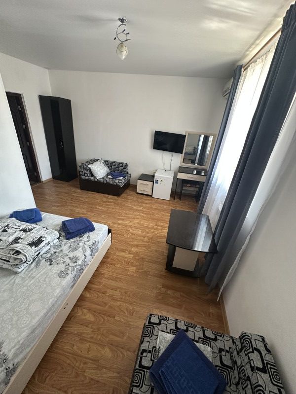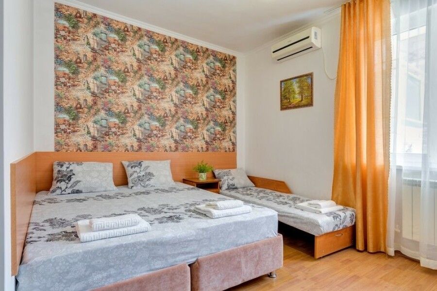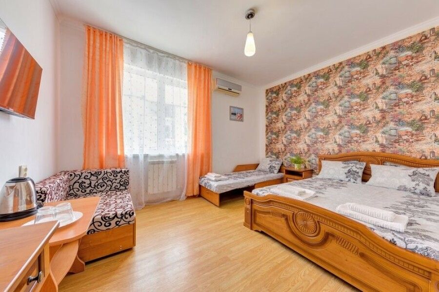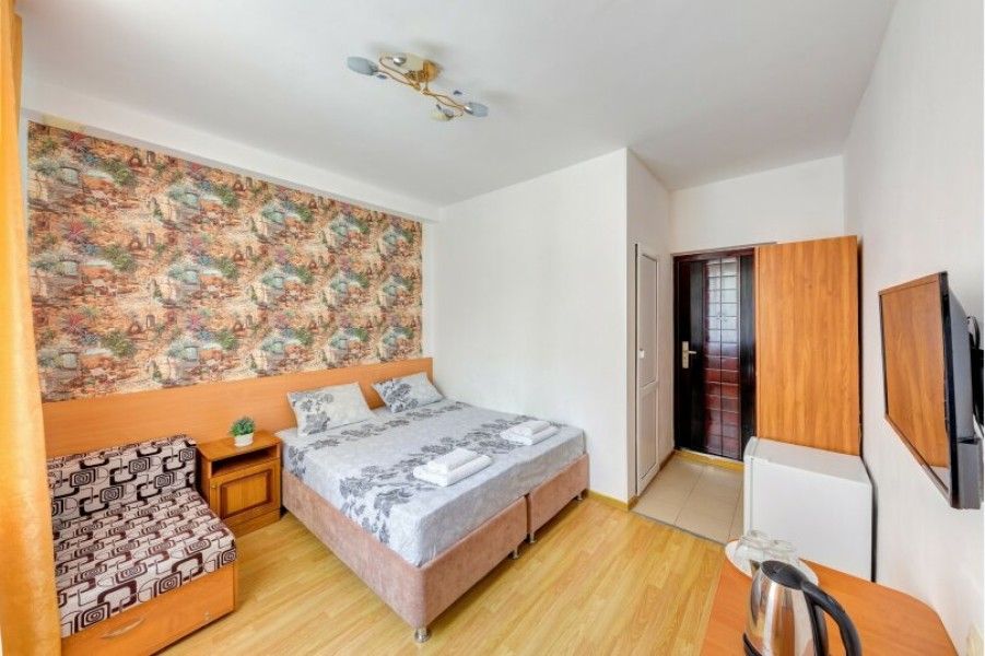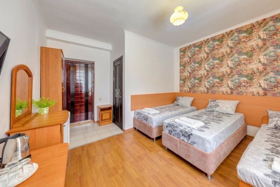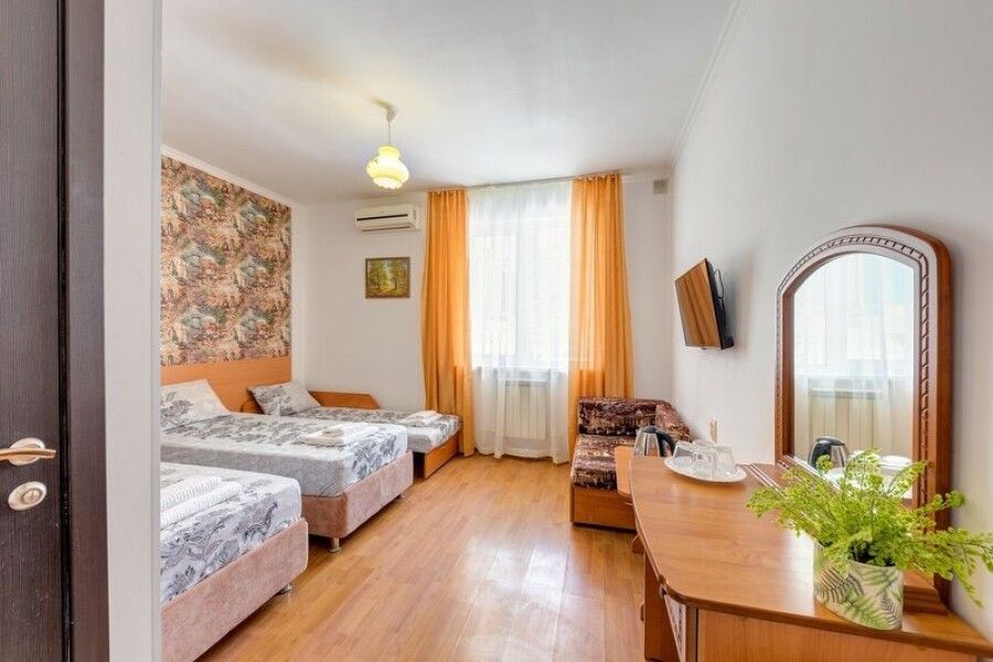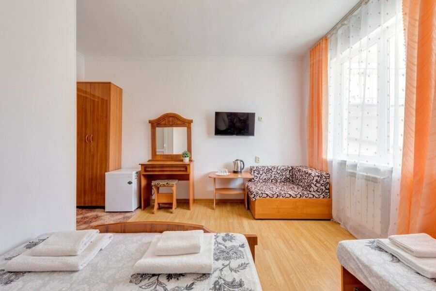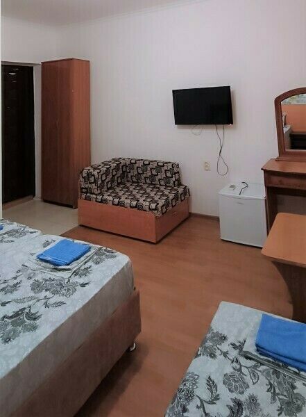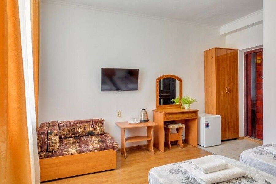 Вас ждут две удобные кровати и диван-тахта для крепкого сна. Для тех, кто любит проводить время в номере, установлен телевизор и косметический столик с зеркалом для подготовки к свиданиям с морем.
