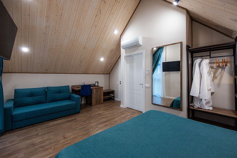 Уютный номер с диваном и балконом.
