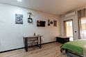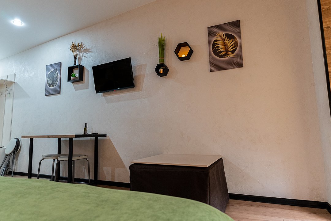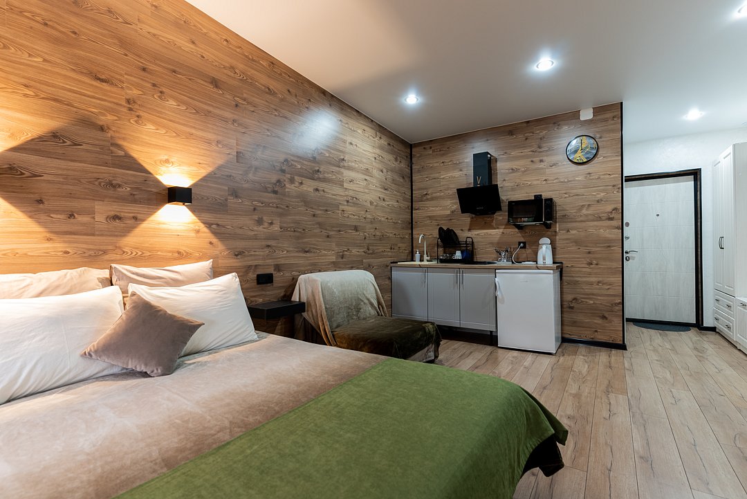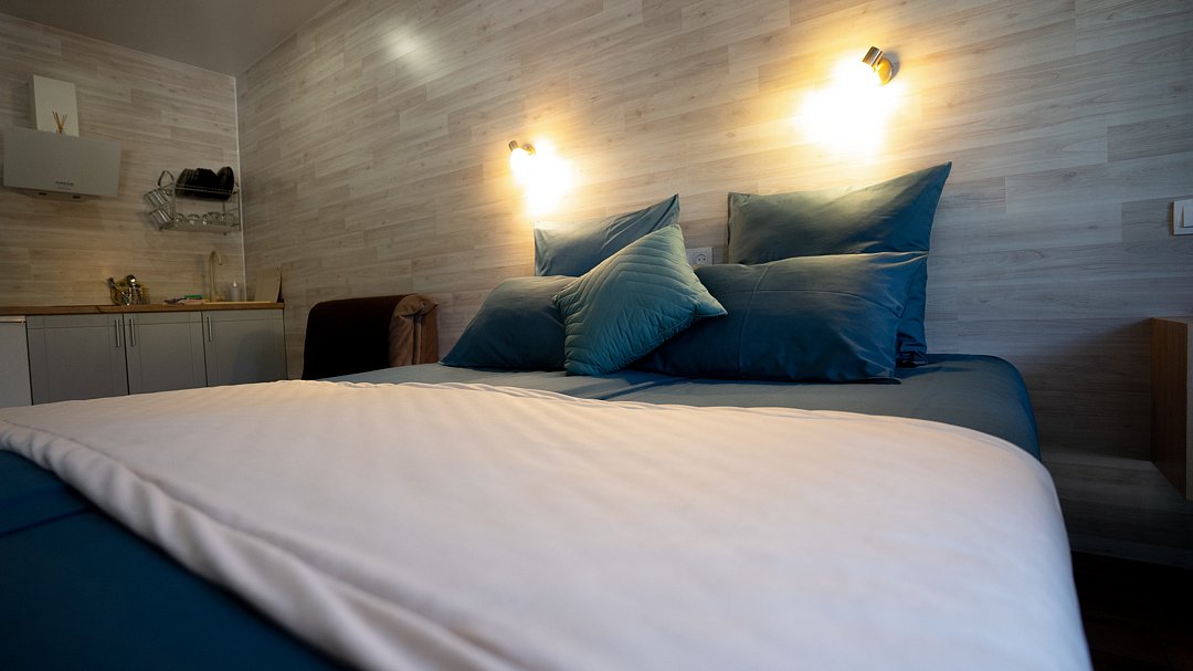 Квартира-студия в гостевом доме идеально подходит для проживания как двух взрослых гостей, так и троих взрослых гостей. В апартаментах есть: удобная двуспальная кровать с прикроватными тумбочками, телевизором, шкафом, гладильной доской и утюгом.