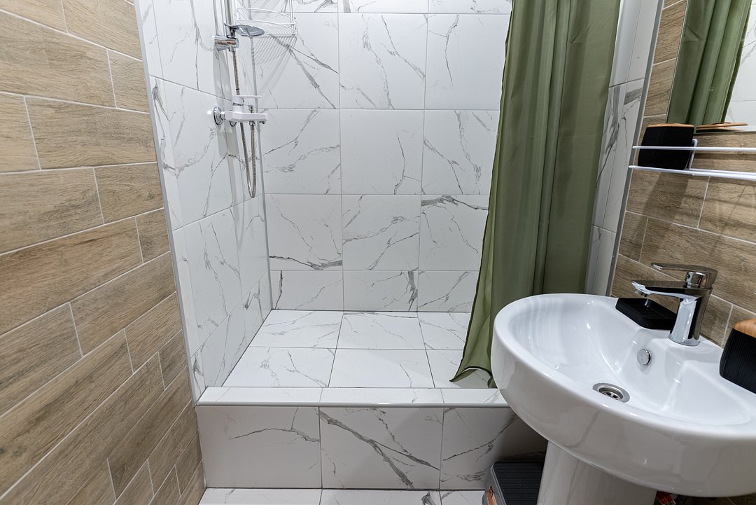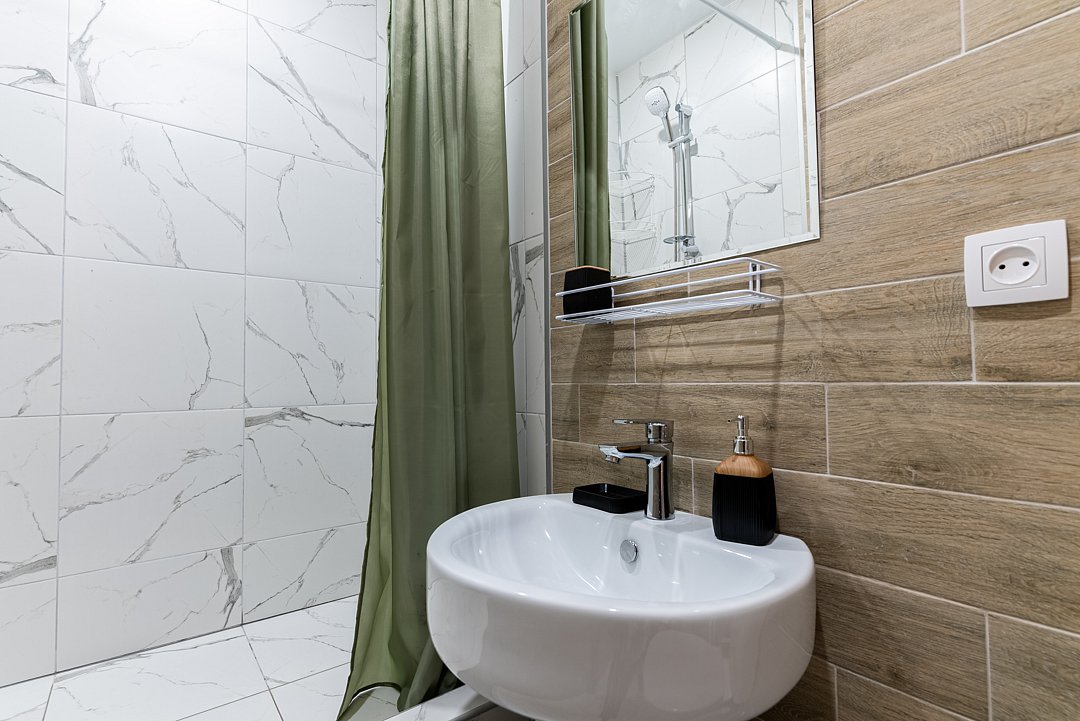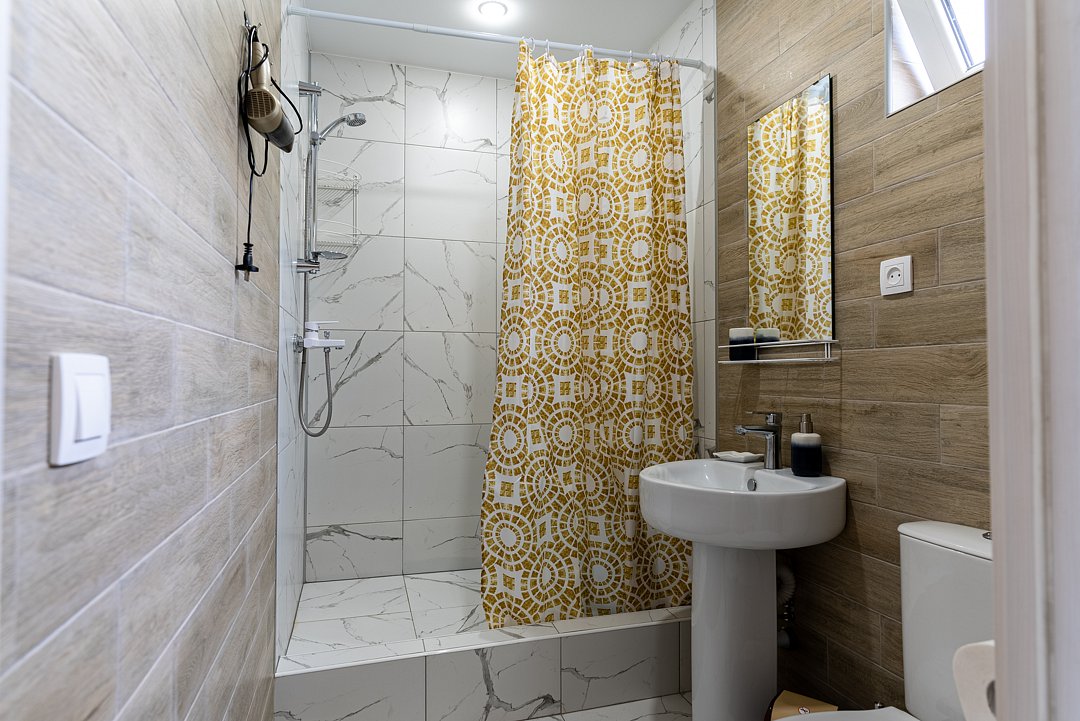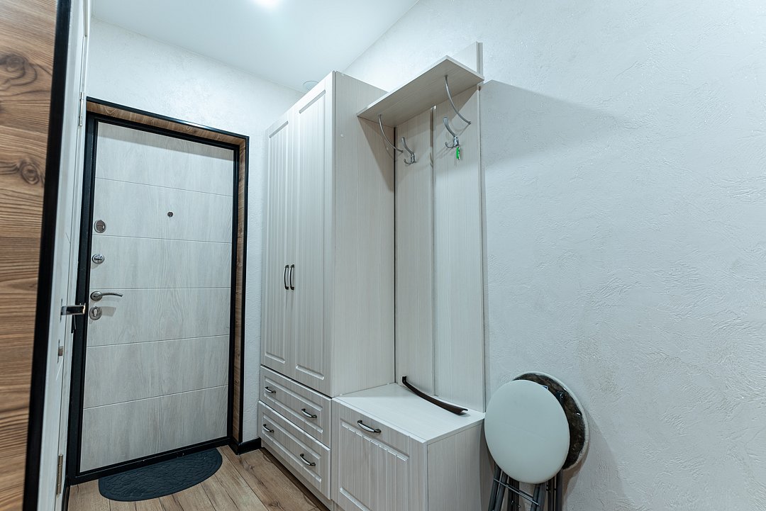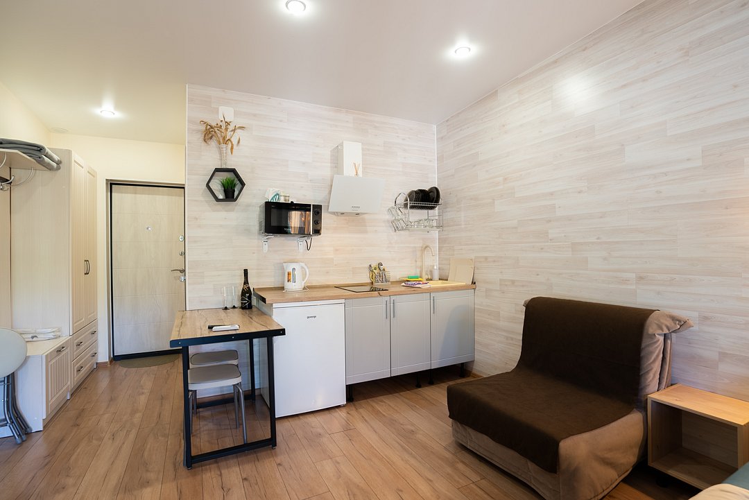 Квартира-студия отлично подходит для проживания как двух взрослых гостей, так и трех взрослых гостей. В апартаментах имеется: удобная двухспальная кровать с прикроватными тумбочками, телевизором, шкафом, гладильной доской и утюгом. Ванная комната оснащена всем необходимым (душем, санузлом, раковиной с зеркалом, феном, туалетными принадлежностями, наборы полотенец, тапочки).