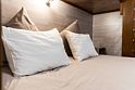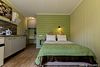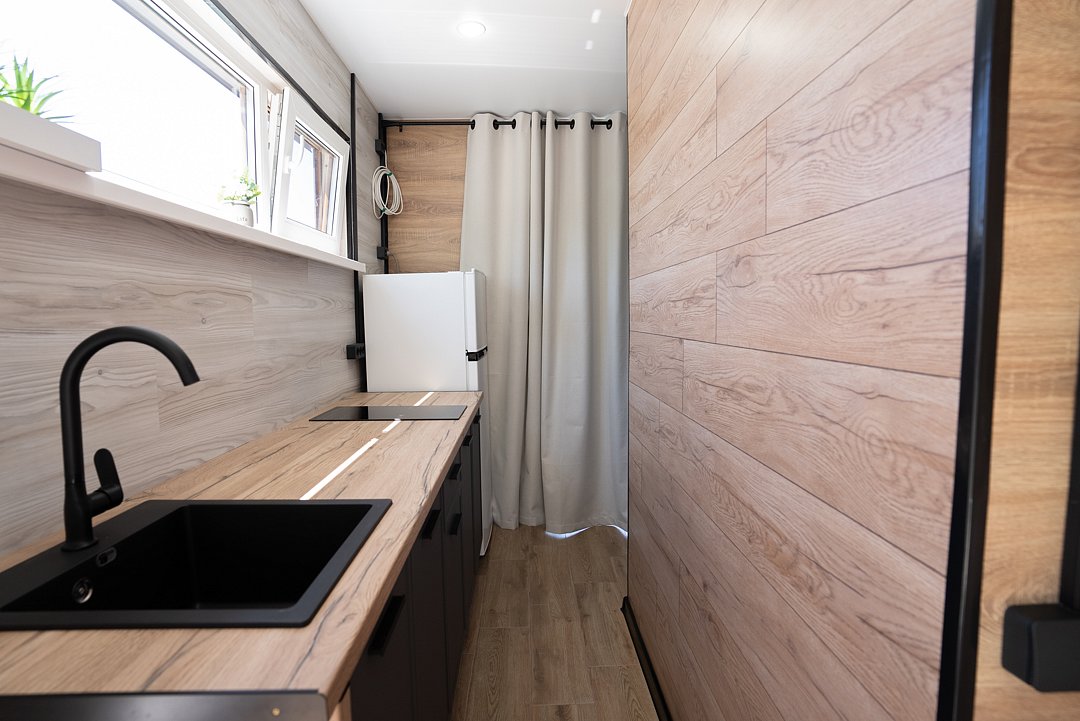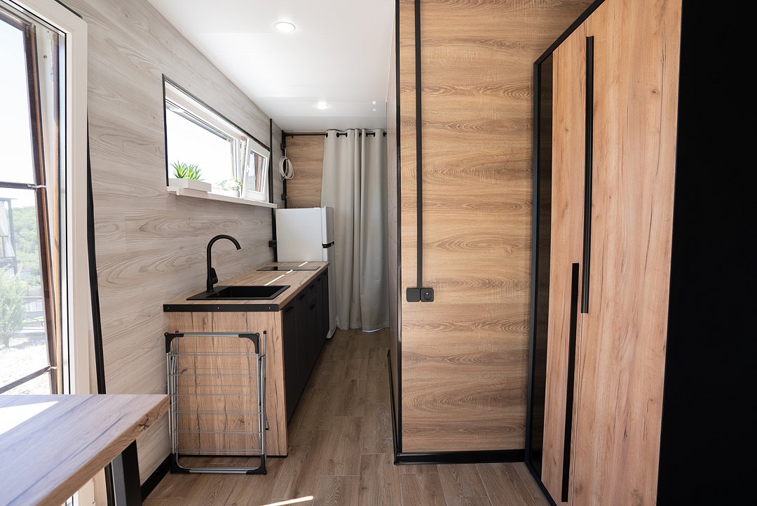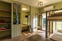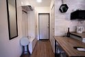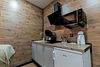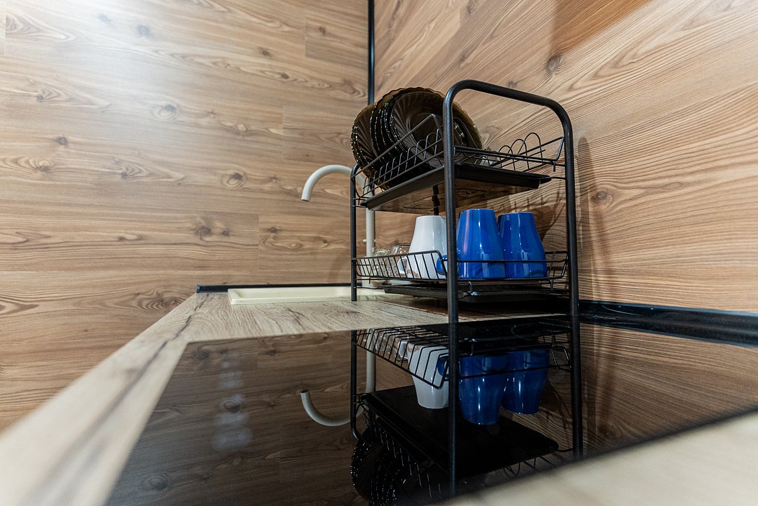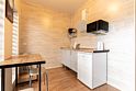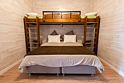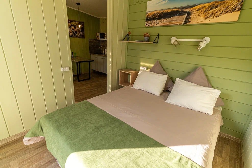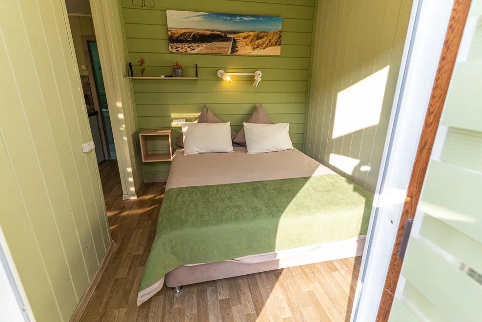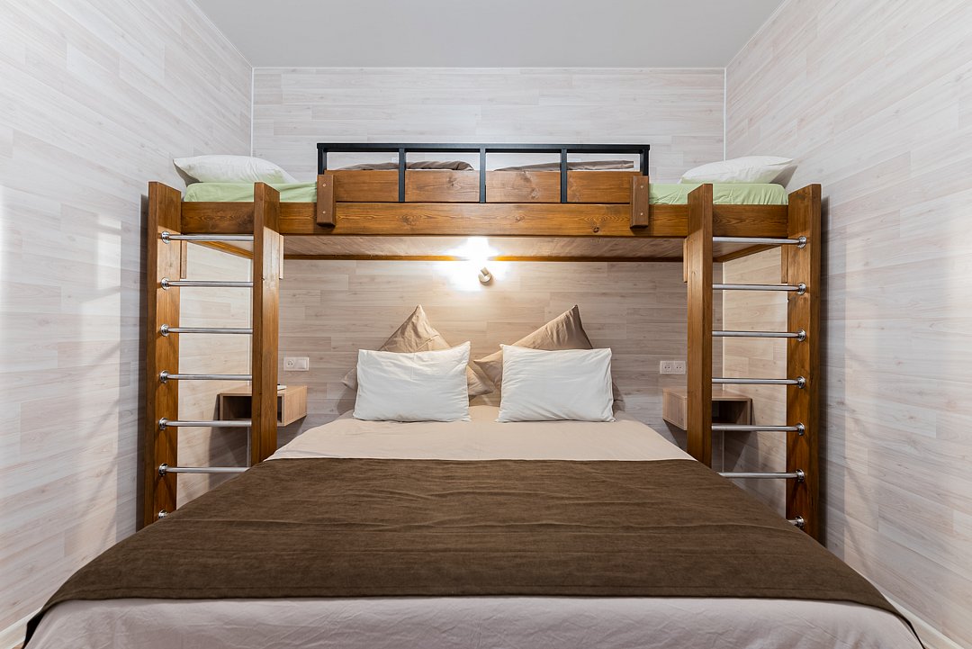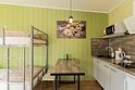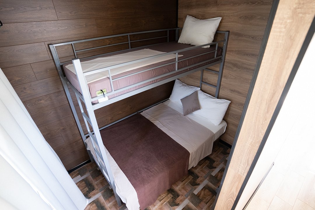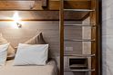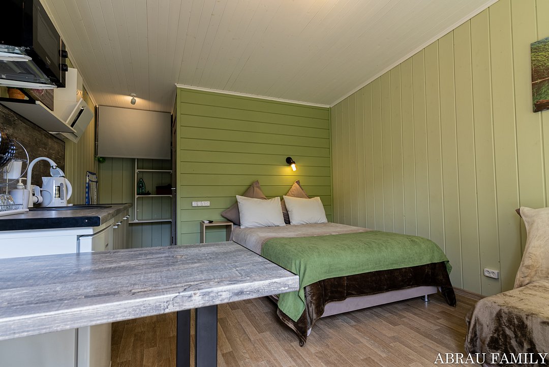 «Студия мини» идеально подходит для размещения двух взрослых гостей, максимум одного ребенка. В домике расположена двухъярусная кровать (нижний ярус шириной один метр двадцать сантиметров, верхний ярус шириной девяносто сантиметров).