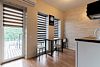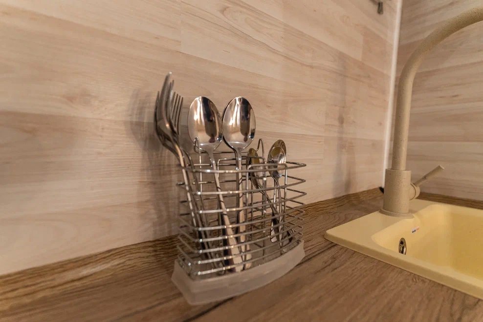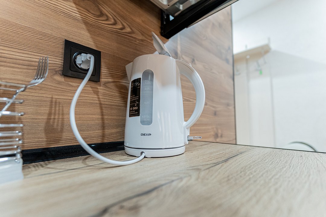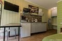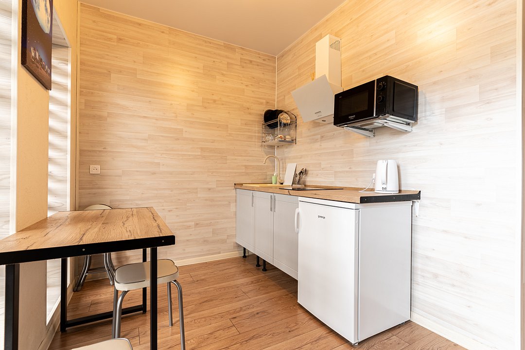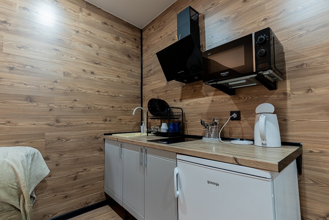 Апартаментах расположена кухня (варочная поверхность на две конфорки, холодильник, раковина и полный комплект посуды). В Апартаментах есть все, что нужно для комфортного проживания. Для проживания более двух человек имеется кресло-кровать.
