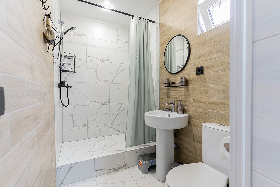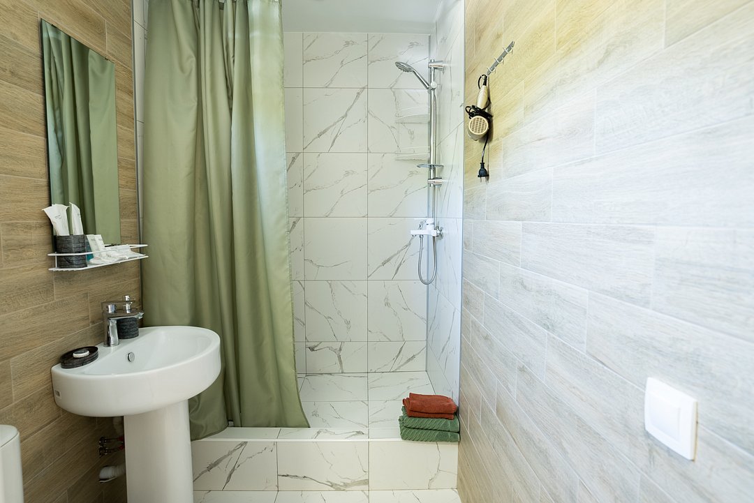 Ванная комната оснащена всем необходимым (душем, санузлом, раковиной с зеркалом, феном, туалетными принадлежностями). В апартаментах имеется: удобная двуспальная кровать с прикроватными тумбочками, телевизором, шкафом, гладильной доской и утюгом.