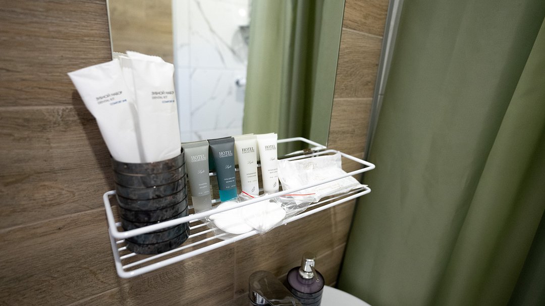 Ванная комната оснащена всем необходимым (душем, санузлом, раковиной с зеркалом, феном, туалетными принадлежностями, наборами полотенец, тапочками). В апартаментах расположена кухня (варочная поверхность на две конфорки, холодильник, раковина и полный комплект посуды).