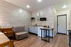 Прекрасные апартаменты, архитектурное решение которых создает ощущение однокомнатной квартиры, так как кухня отделена от спальной зоны. Вид из апартаментов на горы.