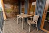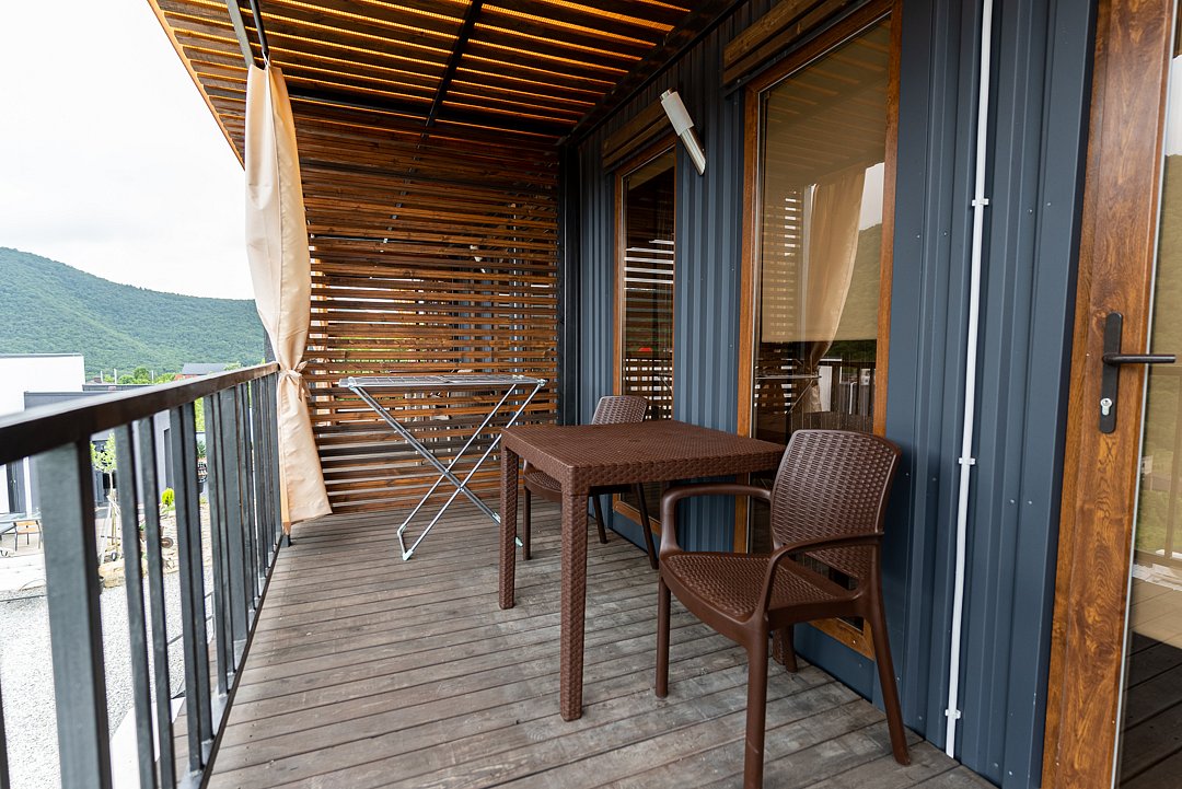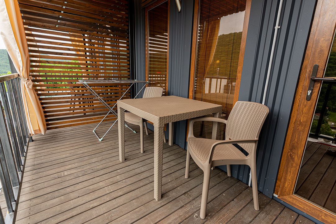 Перед номером расположена просторная терраса с креслами и столом для отдыха, площадь террасы составляет 12 м². Здесь можно наслаждаться свежим воздухом и красивым видом на горы.