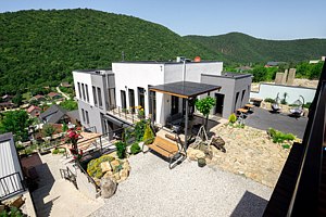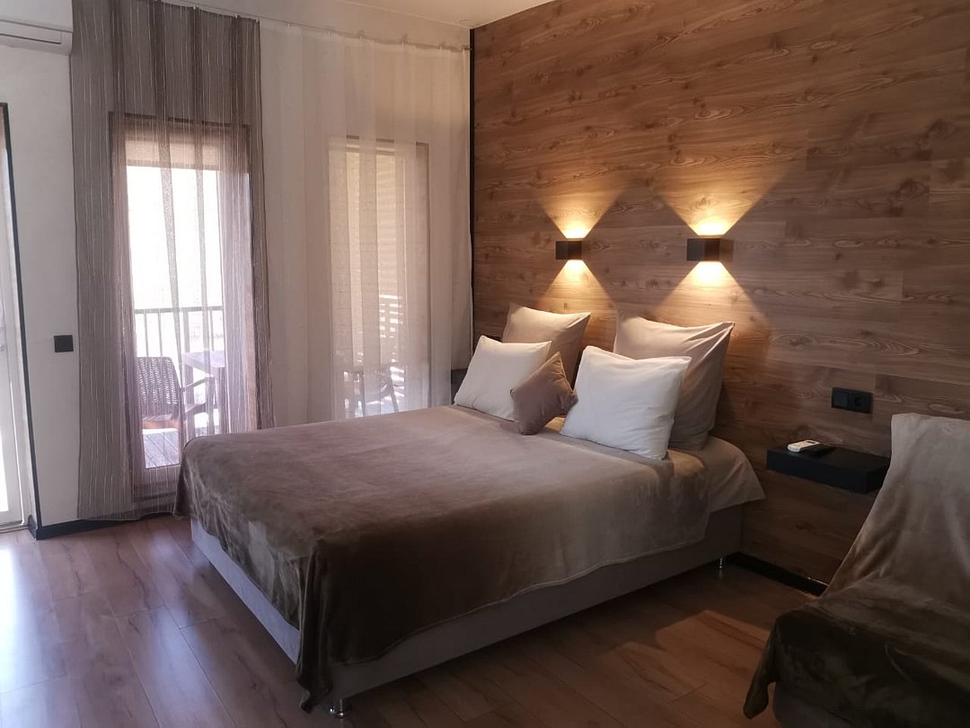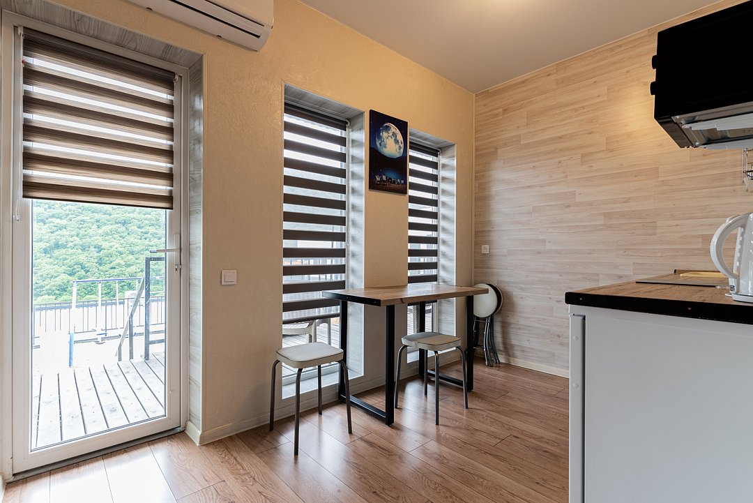 В номере расположена кухня (варочная поверхность на две конфорки, холодильник, раковина и полный комплект посуды). В номере есть все, что нужно для комфортного проживания. Прекрасный номер, архитектурное решение которого создает ощущение пространства и наполненности светом и воздухом. Вид из апартаментов на горы.