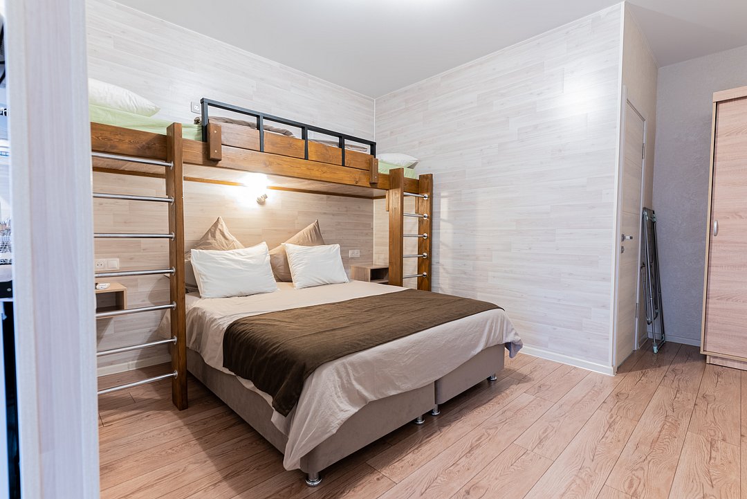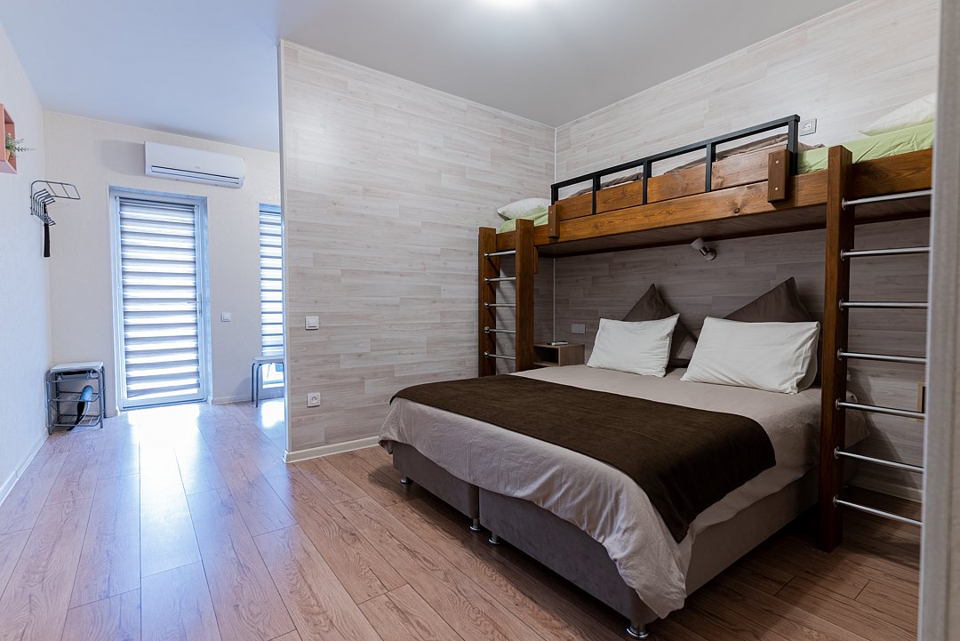 Квартира-студия семейная в гостевом доме предназначена для проживания двух взрослых и не более трех детей! Удобная двуспальная кровать с прикроватными тумбочками, двухспальная кровать-чердак только для детей, комфортная еврораскладушка или детская кроватка (для детей от двух лет).