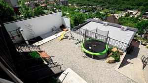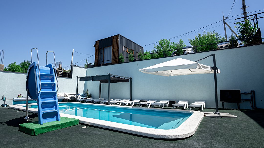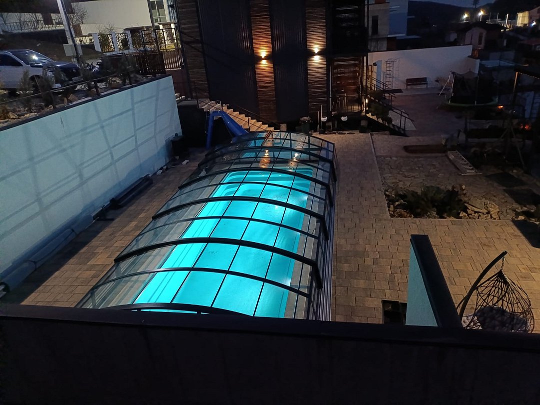 На территории гостевого дома расположен открытый бассейн с подогревом и раздвижным навесом, что обеспечивает возможность купаться в любое время, независимо от погодных условий, в течение всего года.