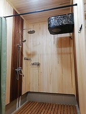 Ванная комната оснащена всем необходимым (душем, санузлом, раковиной с зеркалом, феном, туалетными принадлежностями). В номере расположена кухня (варочная поверхность на две конфорки, холодильник, раковина и полный комплект посуды).