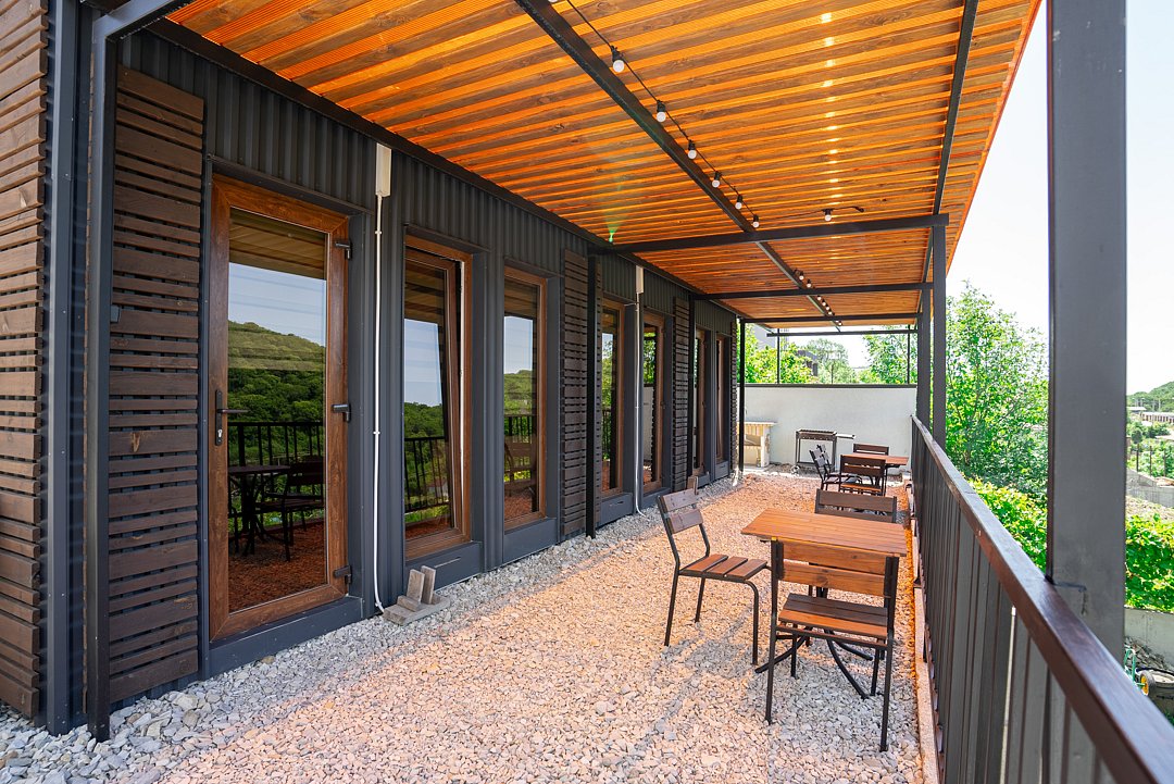 В домике есть все, что нужно для комфортного проживания. Около домика отсутствует зона отдыха. Вы можете наслаждаться утренней и вечерней зоной отдыха в зоне бассейна. Студия расположена на верхней террасе рядом с парковочными местами для машин.