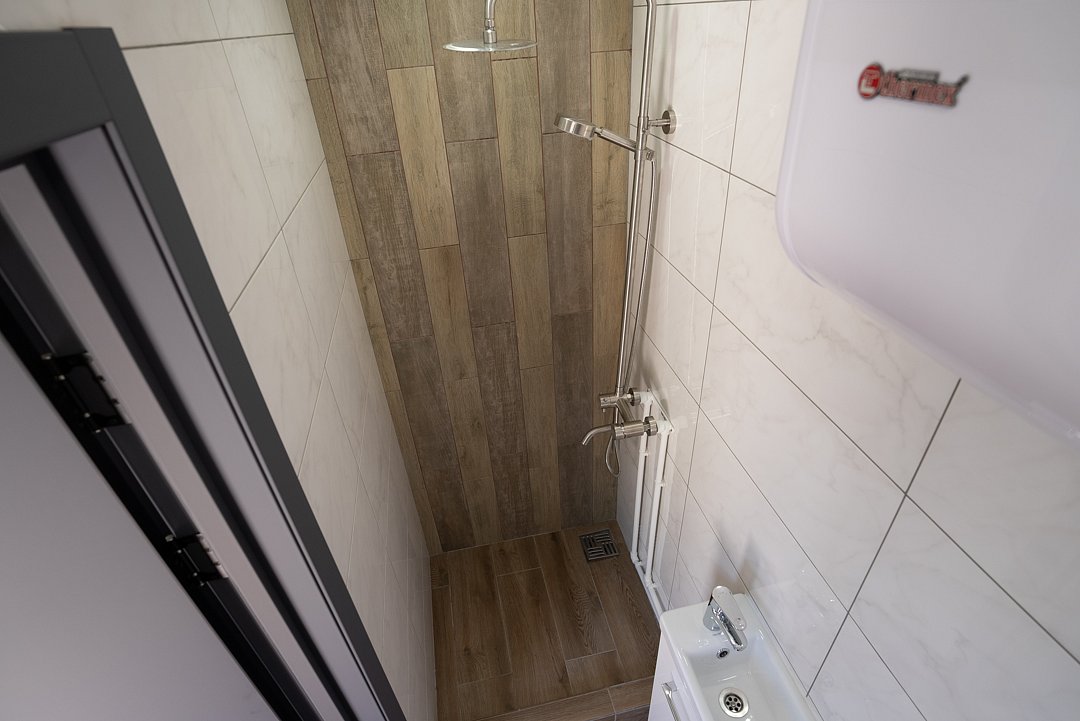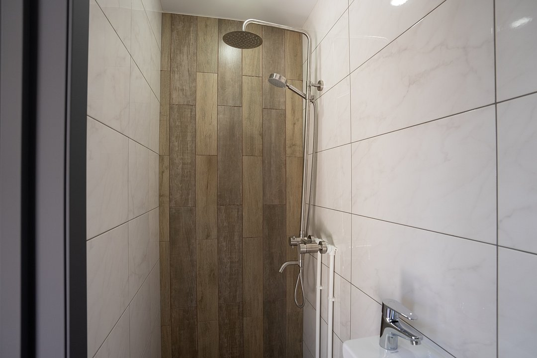 Общие удобства: просторная кухня (11 м²) с мебелью и всем необходимым: варочная поверхность на две конфорки, холодильник, раковина и полный набор посуды. Также есть гладильная доска и утюг. Одна душевая комната на две комнаты оснащена всем необходимым: душем, зеркалом, феном, туалетными принадлежностями, наборами полотенец и тапочками.