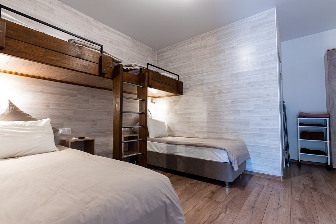Этот номер идеально подходит для большой семьи. Здесь могут разместиться двое взрослых и пятеро детей или четверо взрослых и двое детей. Комната №1: уютная двуспальная кровать с прикроватными тумбочками, телевизор, шкаф, сплит-система. В санузле — унитаз и раковина.