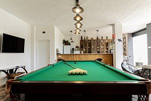На территории гостевого дома гостей ждёт широкий спектр удобств: современный бассейн с раздвижным навесом, банный комплекс с настоящей русской парной, а также просторная зона барбекю с мангалами и крытой беседкой. Для маленьких путешественников оборудована безопасная и увлекательная детская площадка с горками, батутом, детским бильярдом и аэрохоккеем, а при необходимости можно заказать праздничную анимацию, которая сделает отдых детей незабываемым.