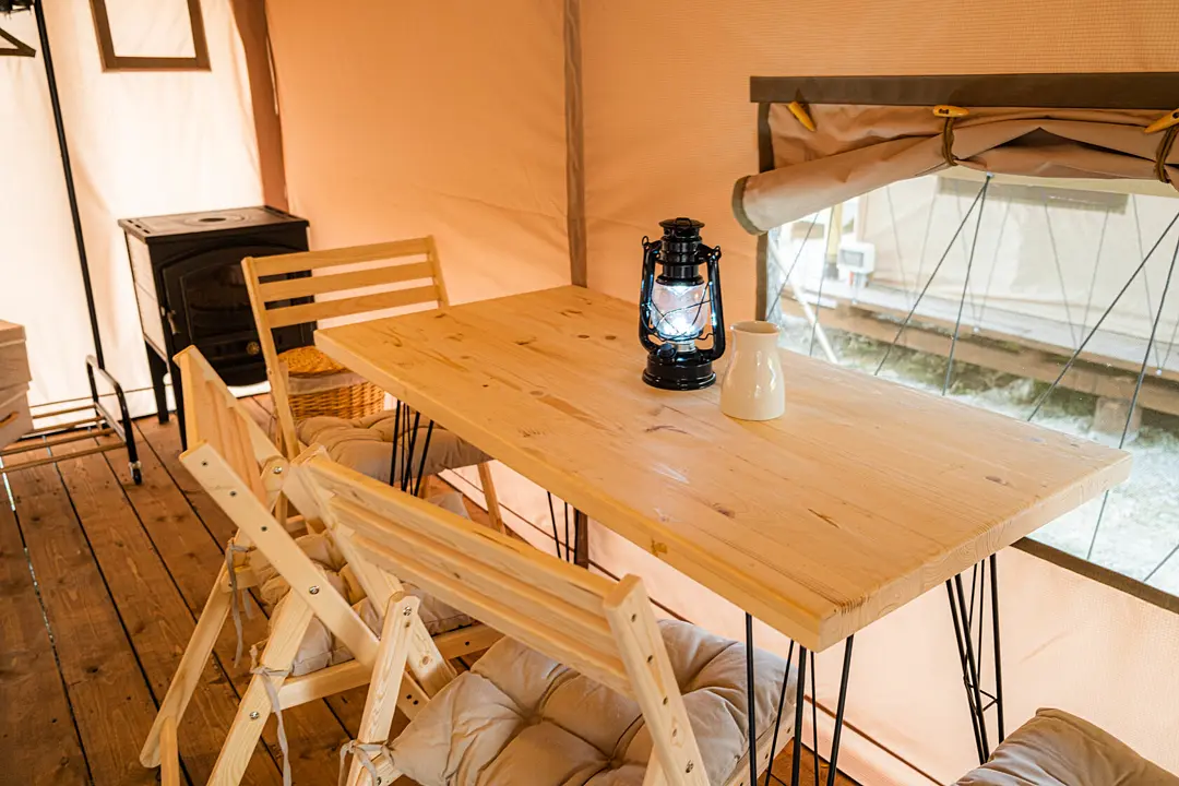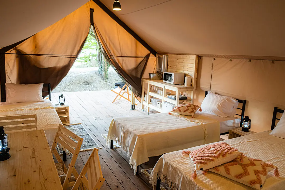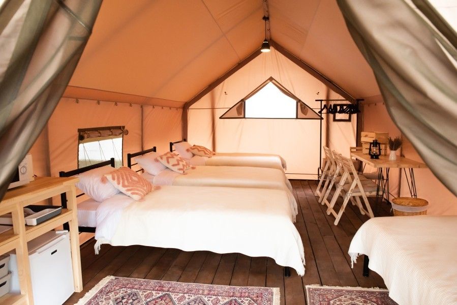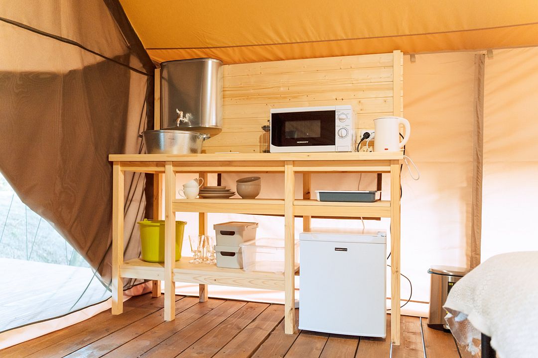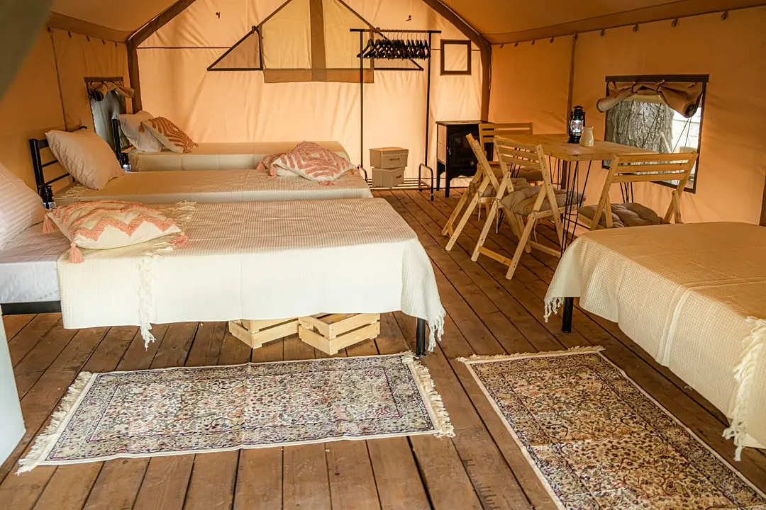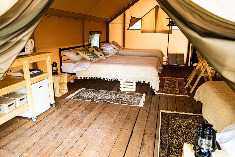 Десять сафари-тентов, предназначенных для тёплого времени года, готовы принять до 28 гостей одновременно, с апреля по ноябрь. Все глэмпы находятся вдоль береговой линии и имеют живописный вид на горное озеро. В каждом из них имеется индивидуальный туалет и душ в санитарном блоке, злектрические конвекторы (отопление) и вентиляторы, кухня, оборудованная бытовой техникой и собственная терраса.