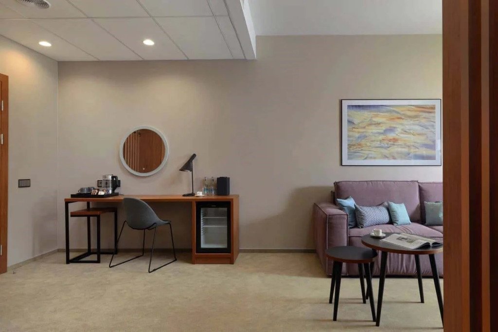 Номера обустроены современной и комфортабельной мебелью. Установлены кондиционер, телевизор с плоским экраном, имеется холодильник и чайник. Среди удобств так же Wi-Fi и собственная ванная комната.
