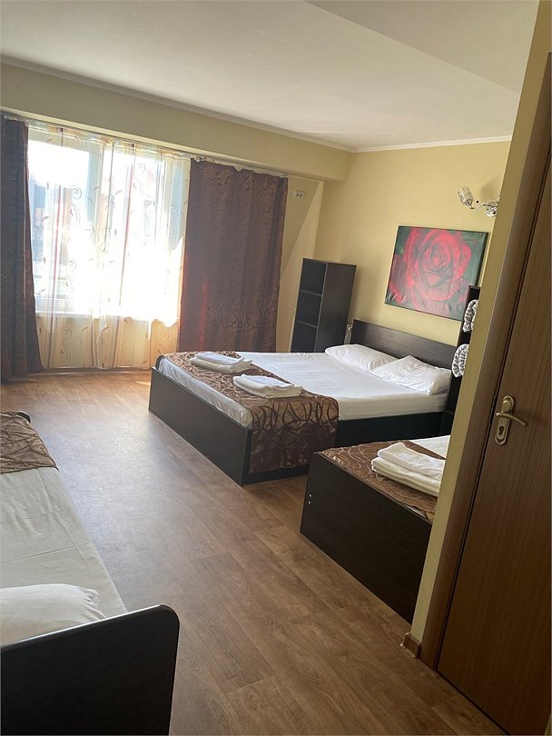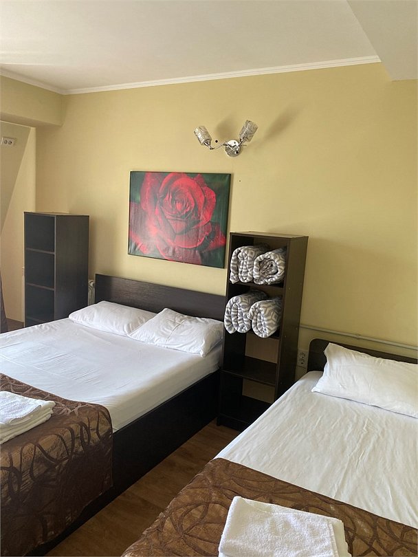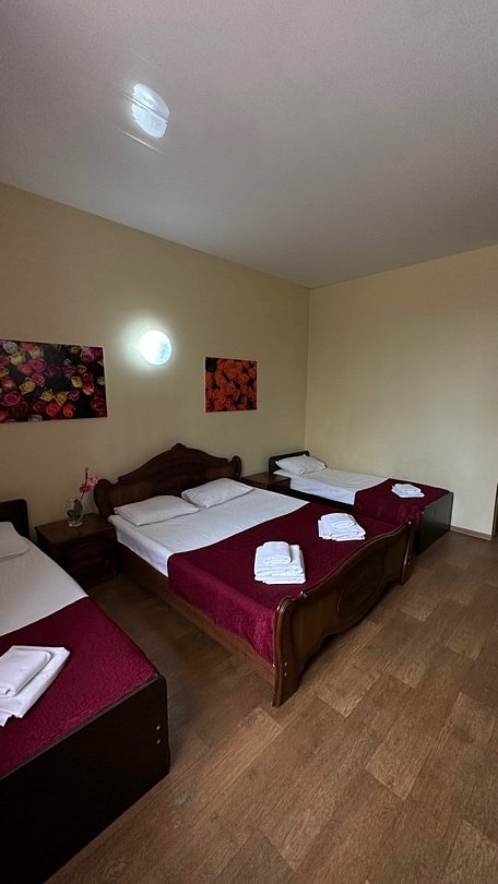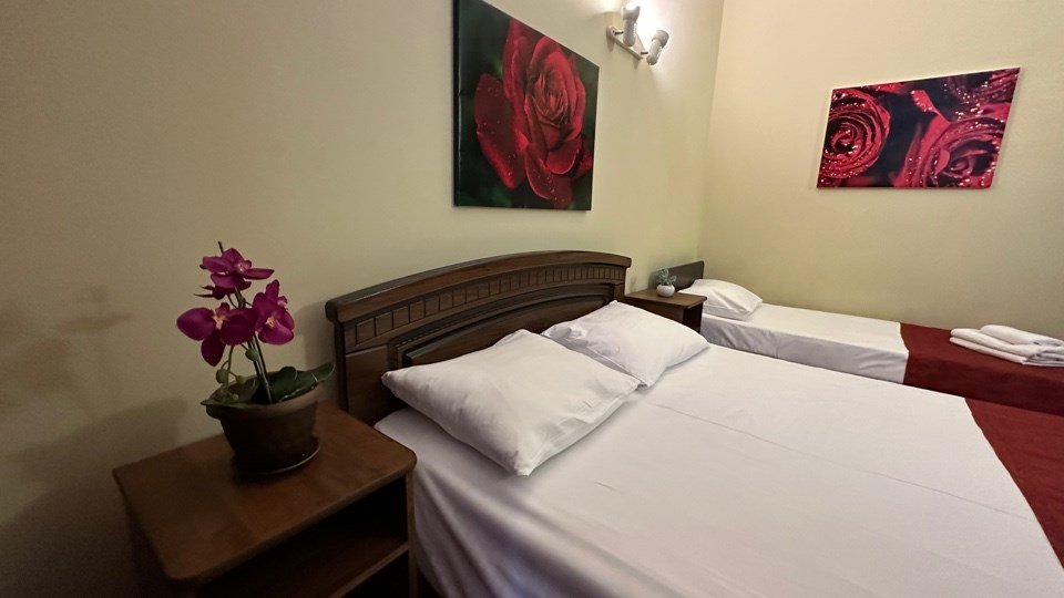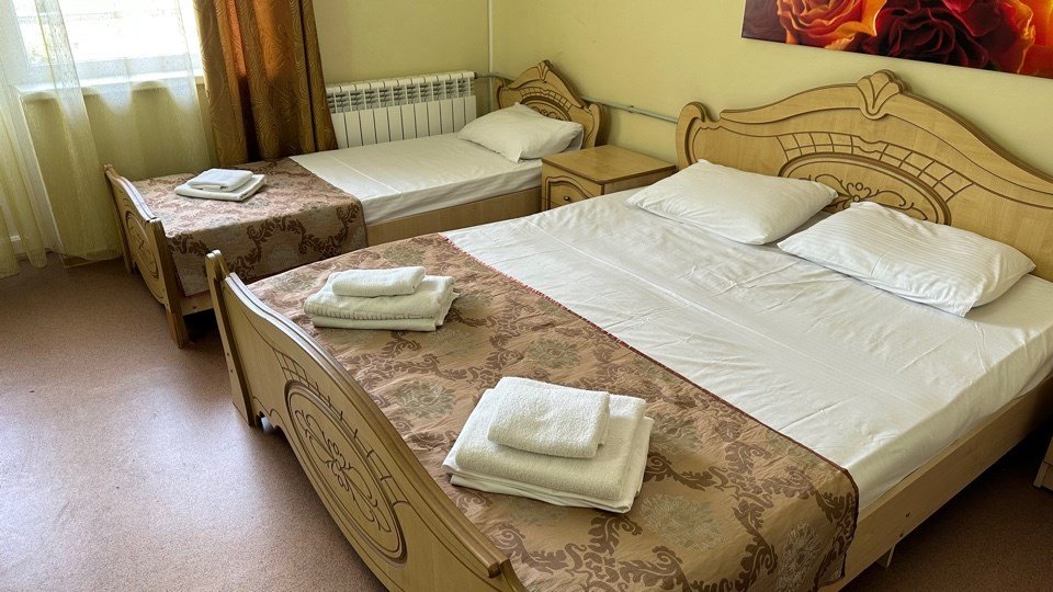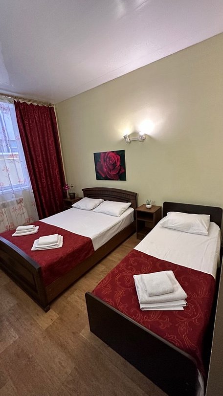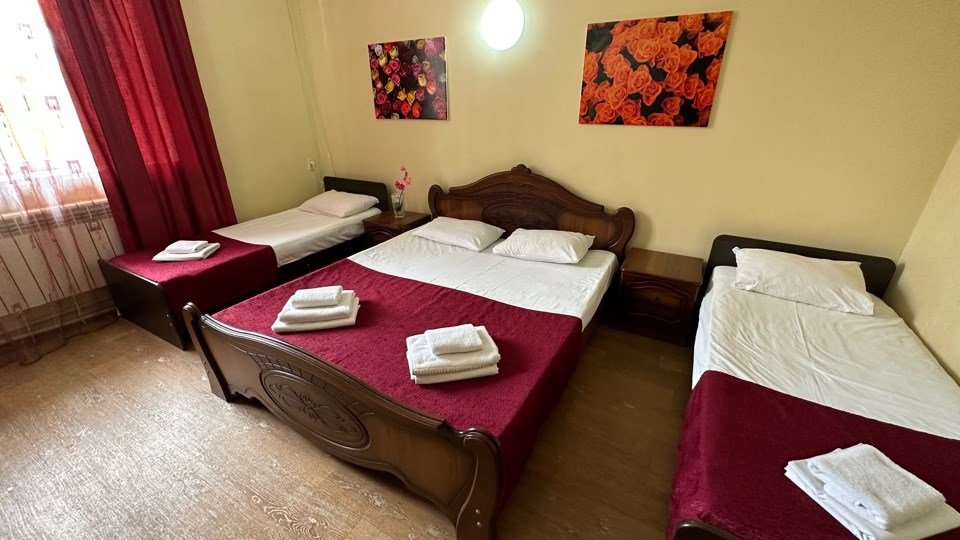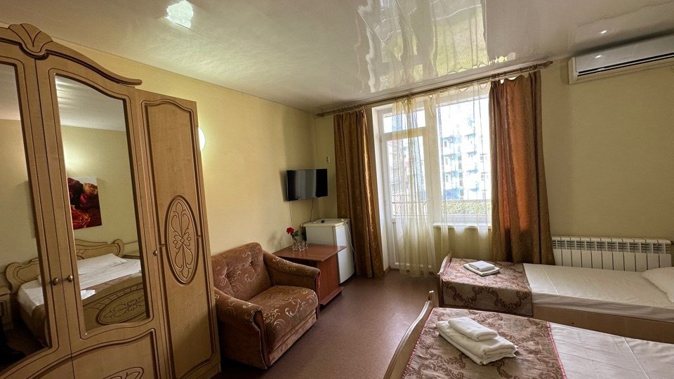 Номер с одной 2х спальной кроватью и односпальной кроватью Трехместный стандартный номер без балкона — уютный и комфортабельный вариант размещения для трех человек. Площадь однокомнатного номера 15 кв.м. Двухместные номера укомплектованы тремя односпальными кроватями или одной двуспальной и одной односпальной кроватью. В номере есть всё необходимое для проживания: - Собственная ванная комната - Набор полотенец и постельного белья - Бесплатный Wi-Fi - ТВ - Кондиционер - Холодильник - Стол - Шкаф - Прикроватные тумбочки - ЗеркалоУслуги и удобства