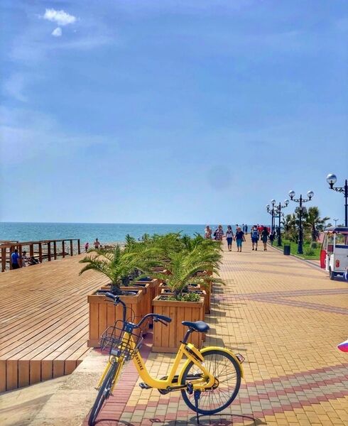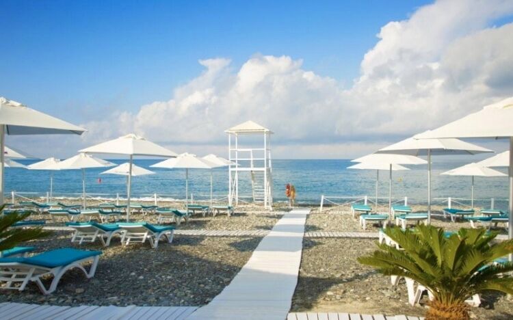 В паре минут ходьбы расположен благоустроенный пляж. На галечном побережье есть раздевалки, теневые навесы, шезлонги, различные водные аттракционы.