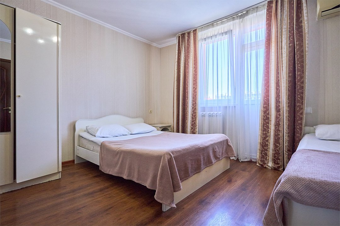 2-КОМНАТНЫЙ СТАНДАРТ без балкона 28 кв.м, двуспальная кровать, 2 односпальные кровати, вид во двор, две комнатыУслуги и удобства