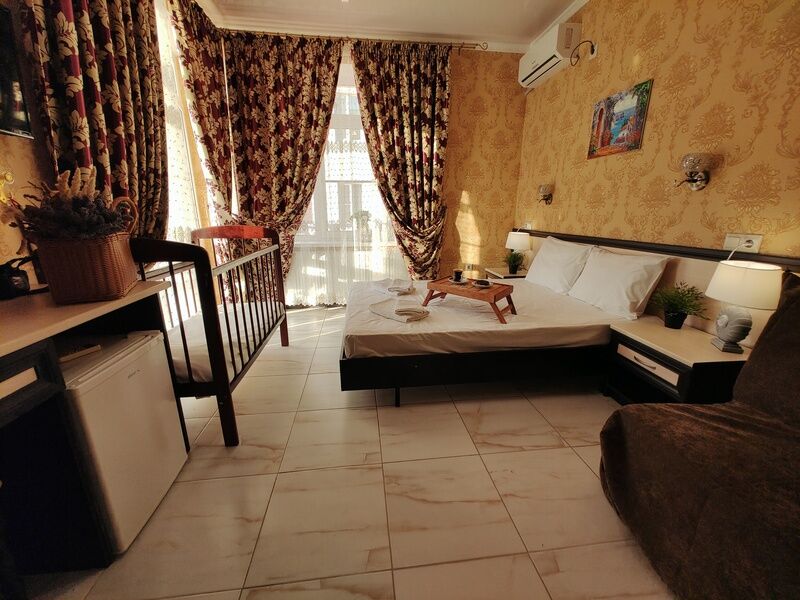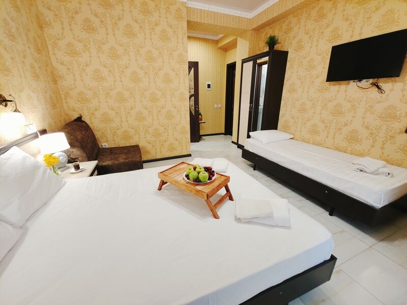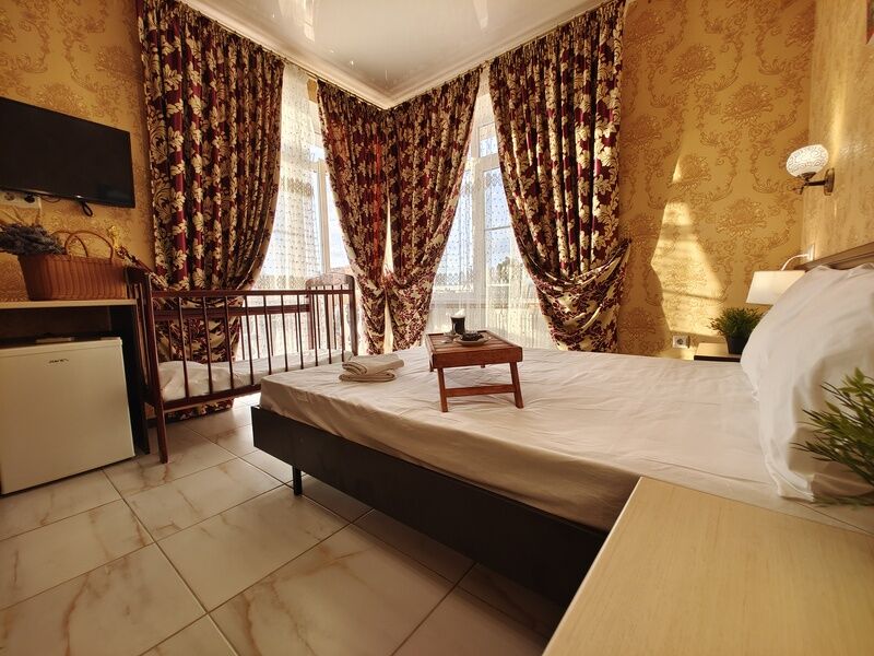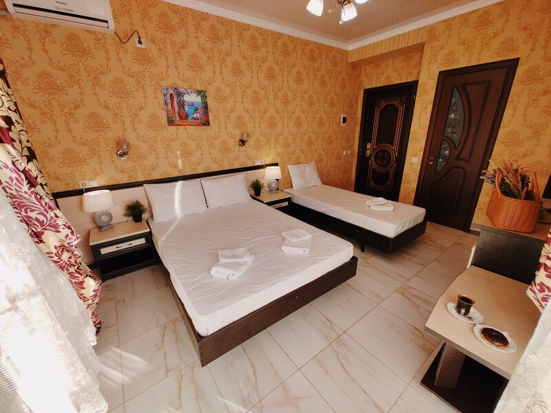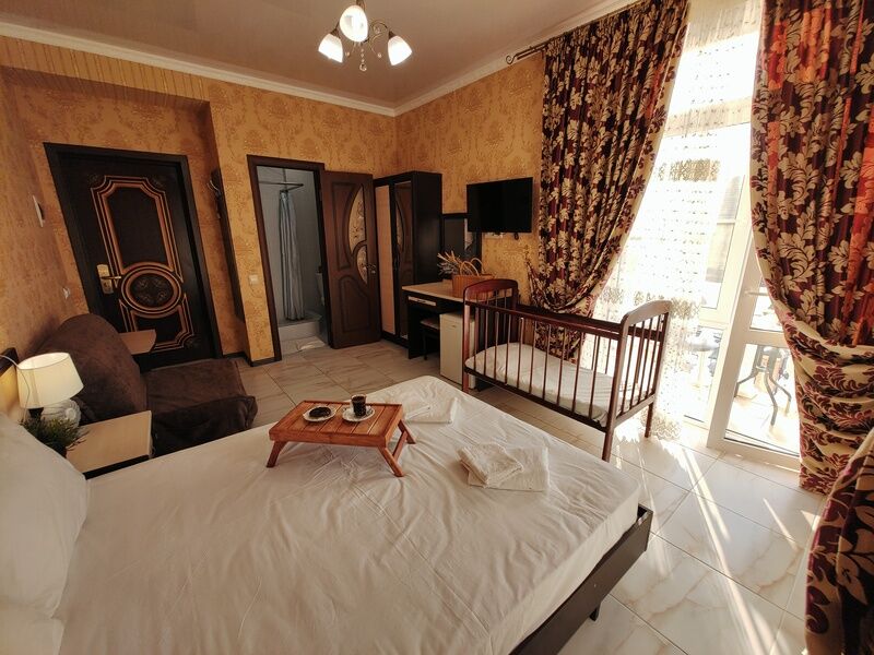 Двуспальная кровать и односпальная кровать или кресло-кровать, прикроватные тумбочки, шкаф, туалетный столик, журнальный столик, вешалка, зеркало, пуфик, мини-холодильник, ТВ, кондиционер. Ванная комната — душевая и санузел, фен, набор полотенец.