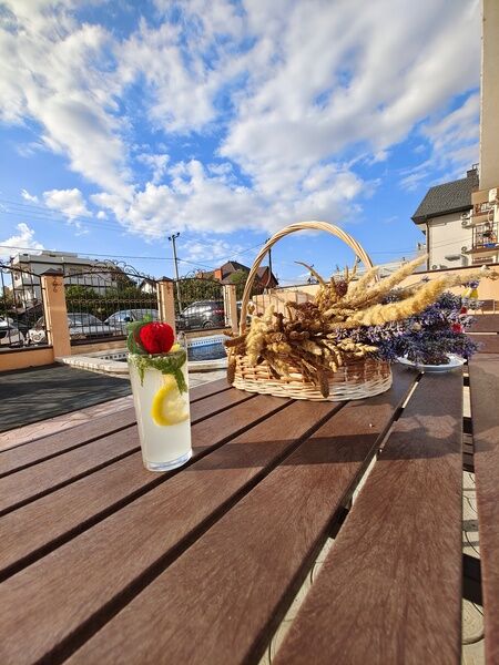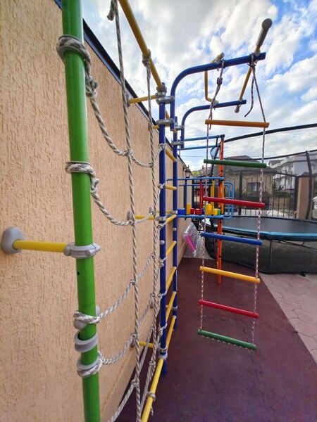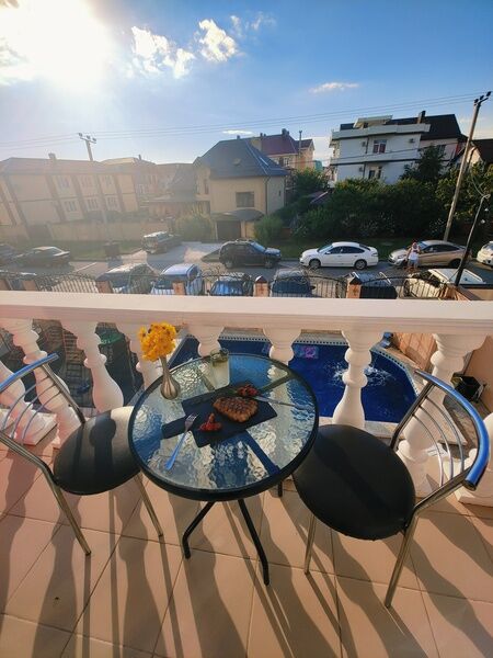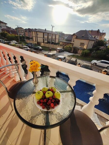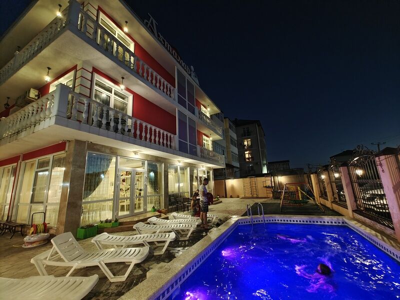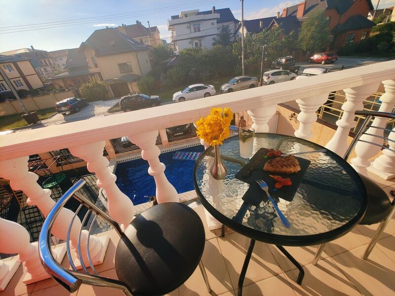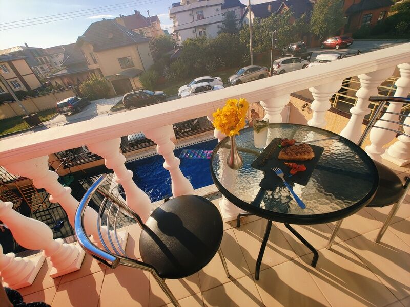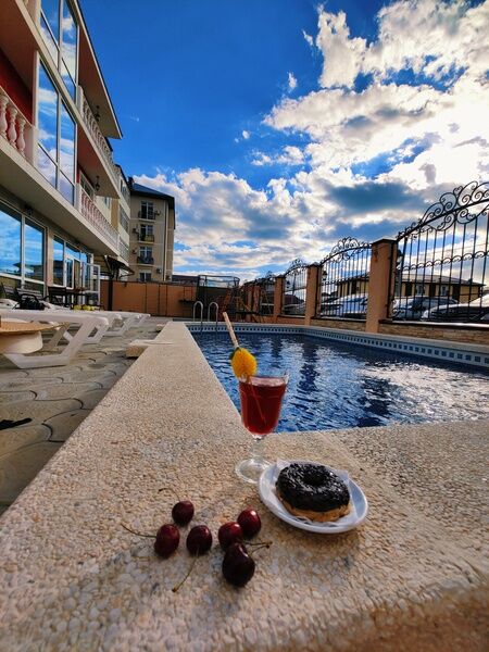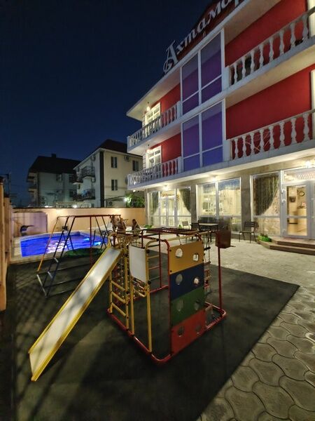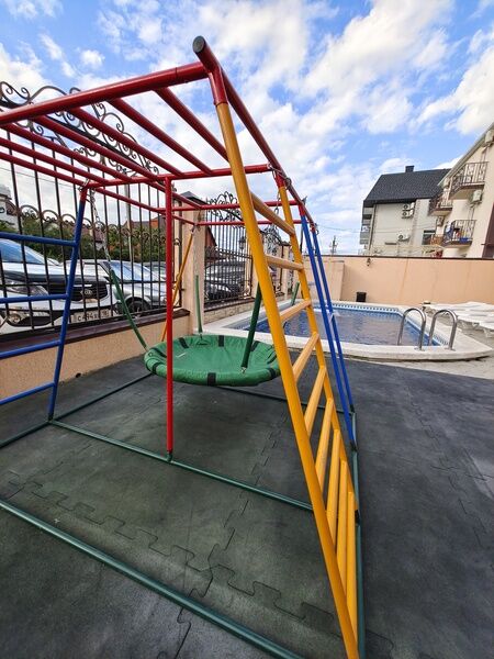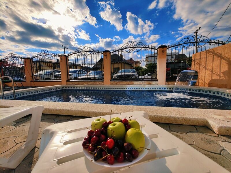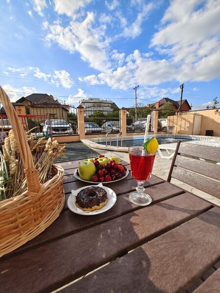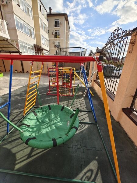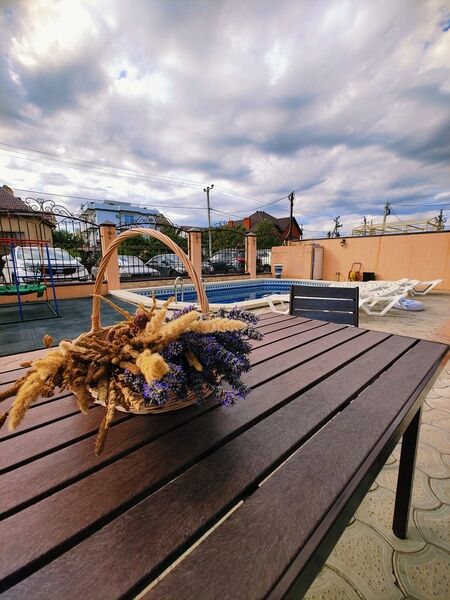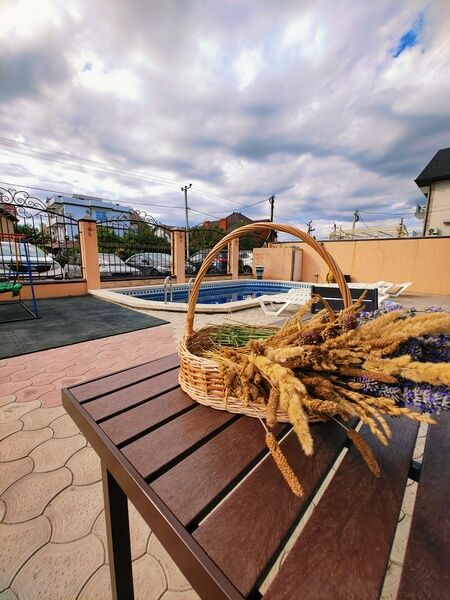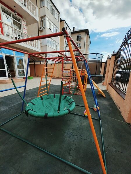 Для отдыха на свежем воздухе для Вас доступны — большой бассейн, шезлонги, уютный дворик, мангальная зона, детская площадка (качели, горки, батут).