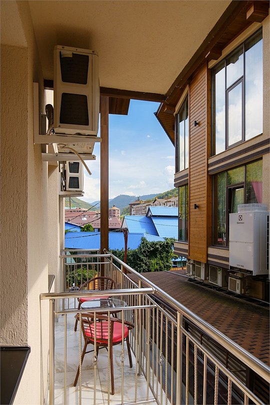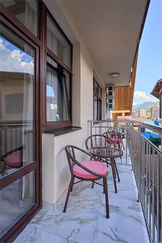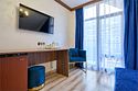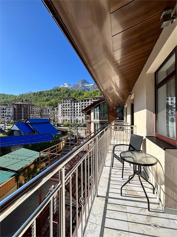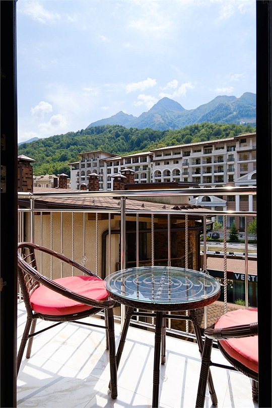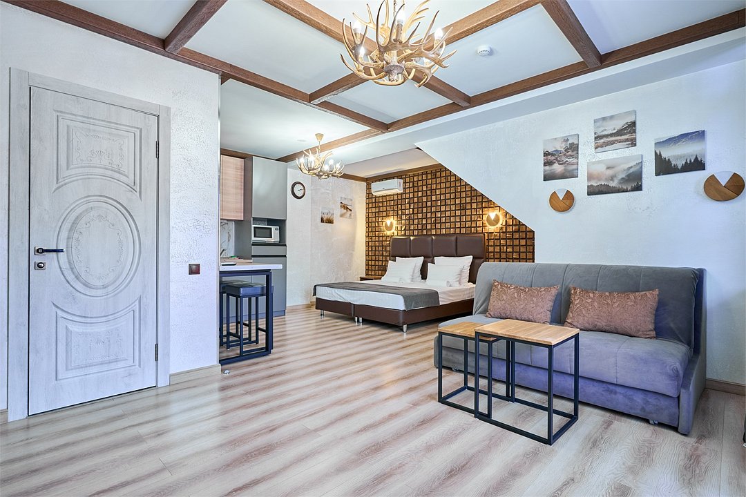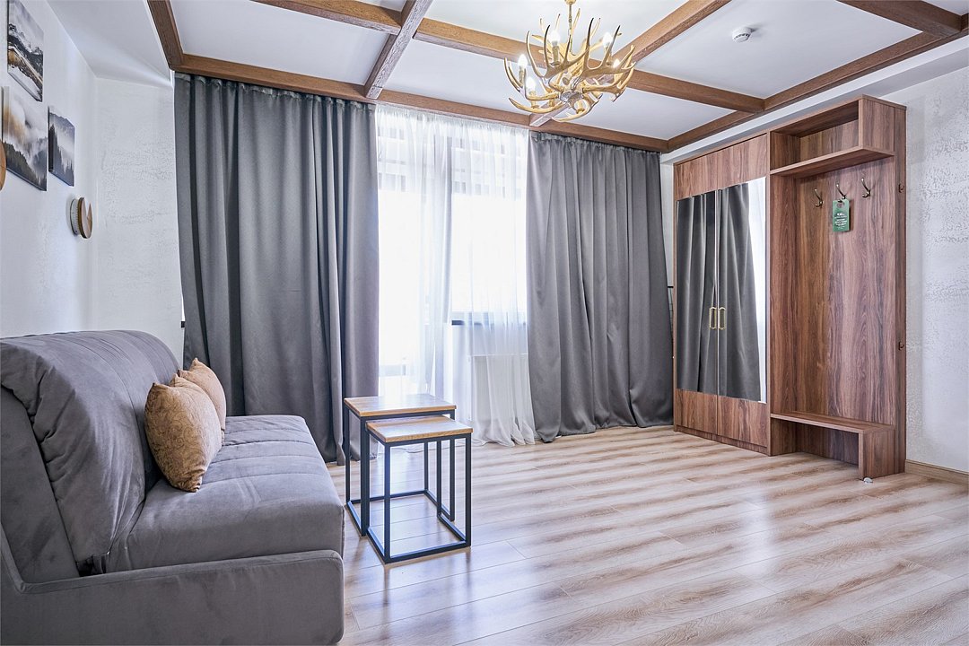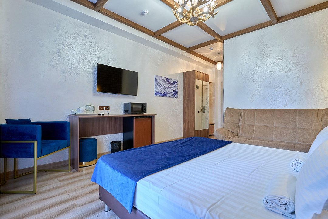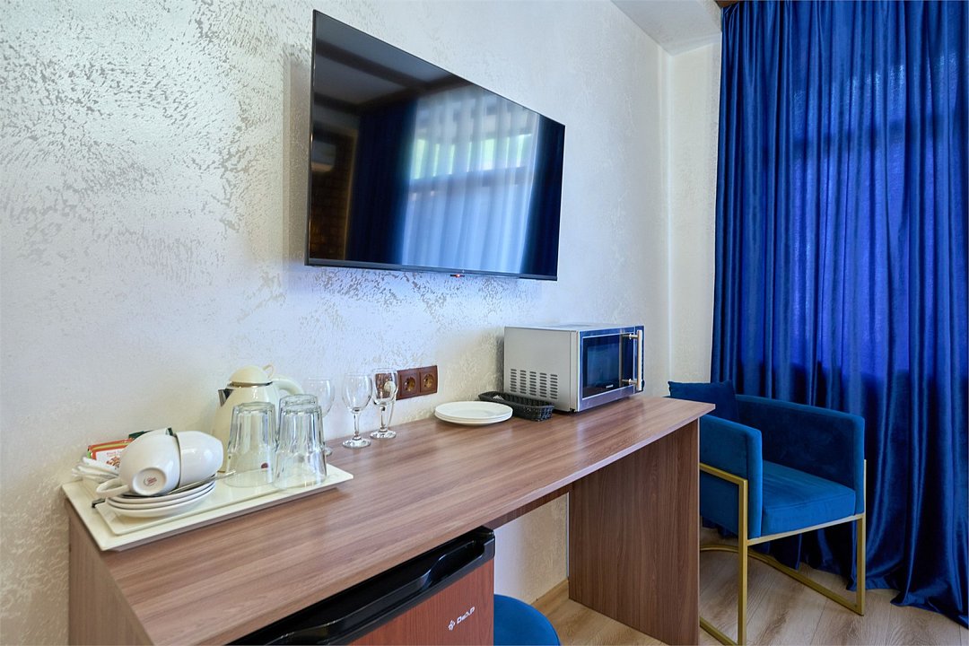 Студия с мини- кухней предлагает комфортные условия для отдыха и уединения. Номер площадью 40 м2, оснащен двуспальной кроватью и диван-кроватью, что создает комфорт и удобство, идеально подходя для семей с детьми или дружеских компаний. Уютный интерьер, продуманные детали и качественная мебель создают теплую и расслабляющую атмосферу. Номер станет отличным выбором для тех, кто ценит гармонию и высокий уровень сервиса во время своего отдыха. Номер оборудован балконам с летней мебелью и имеет вид на город и горы. Ванная комната в дизайнерском исполнении с современным душем и ванной, полностью соответствует высоким стандартам комфорта. Для вашего комфортного проживания ежедневно у вас в номере зелёный и черный чай, а также кофе и сахар в индивидуальных упаковках - предоставляются бесплатно. Халаты - предоставляются по запросу, платно (500 рублей за пользование халатом). Обращаем ваше внимание на то что фото номеров носят ознакомительный характер и являются иллюстрацией типа и категории номера, фактический цвет стен номера и деталей интерьера а также конфигурация, тип и набор предметов мебели могут отличаться от той что представлена на фотографиях.Услуги и удобства