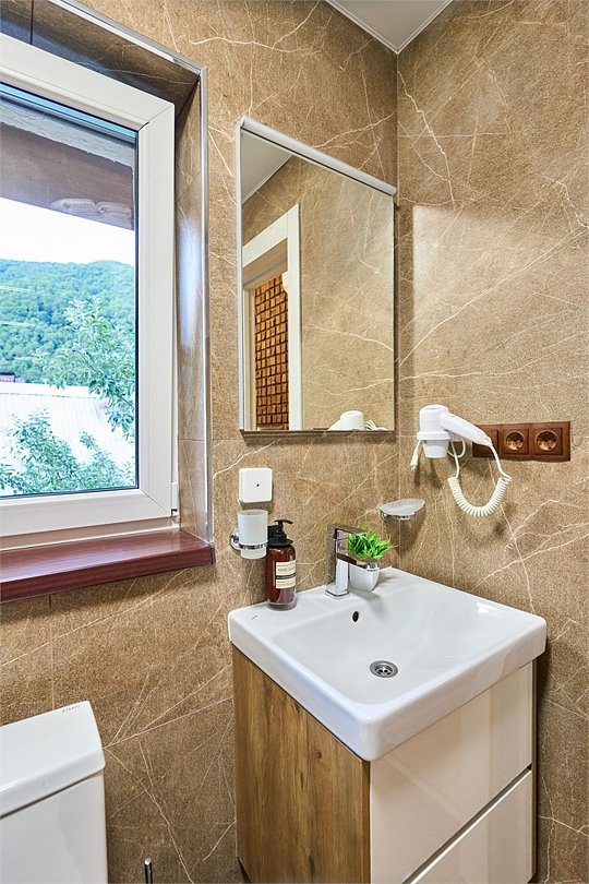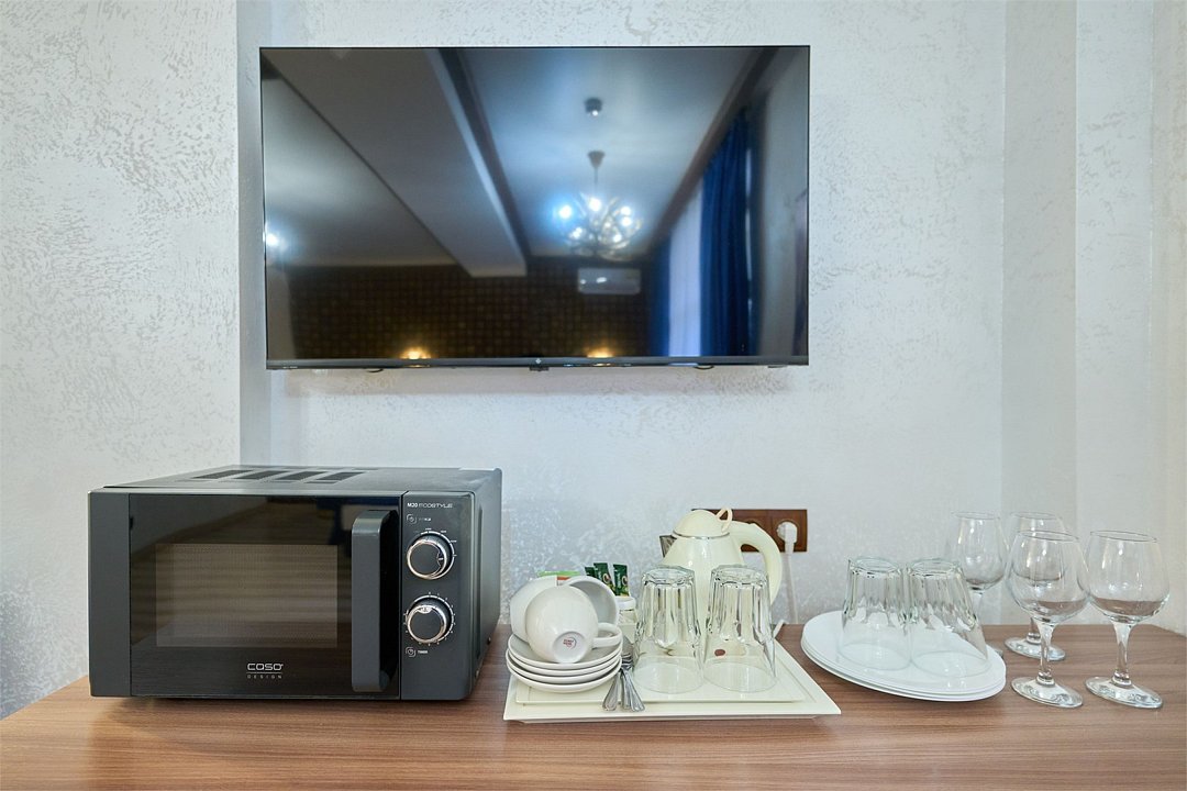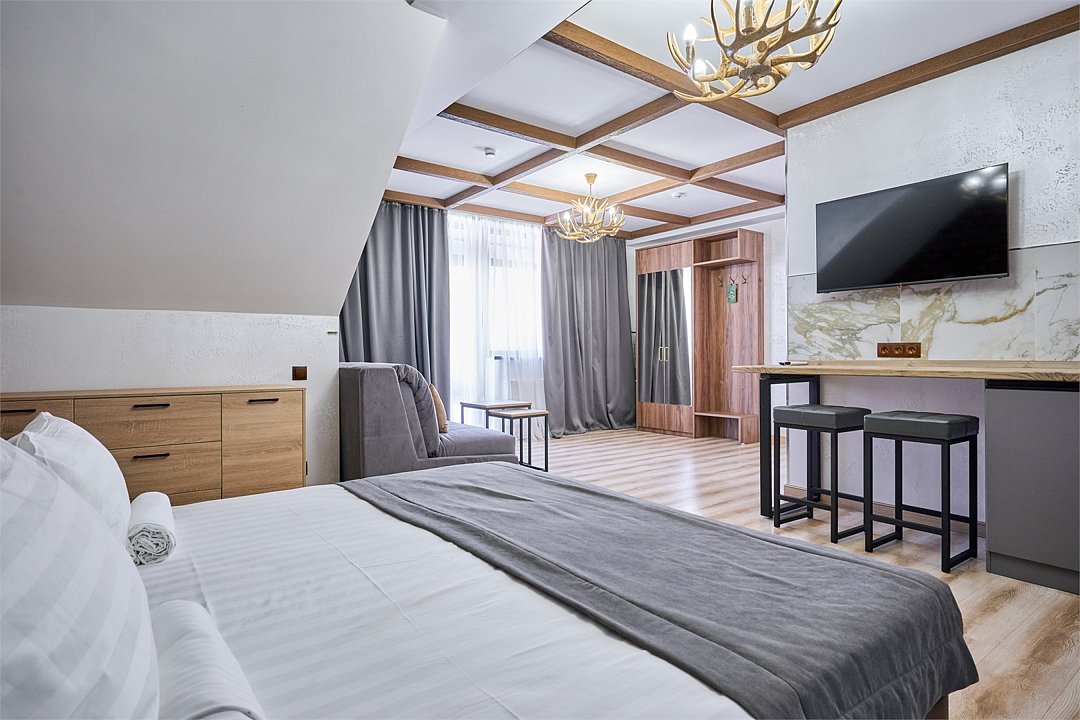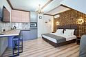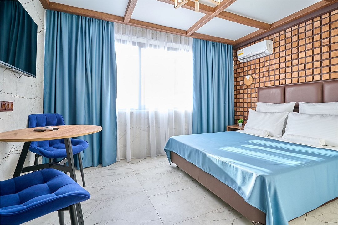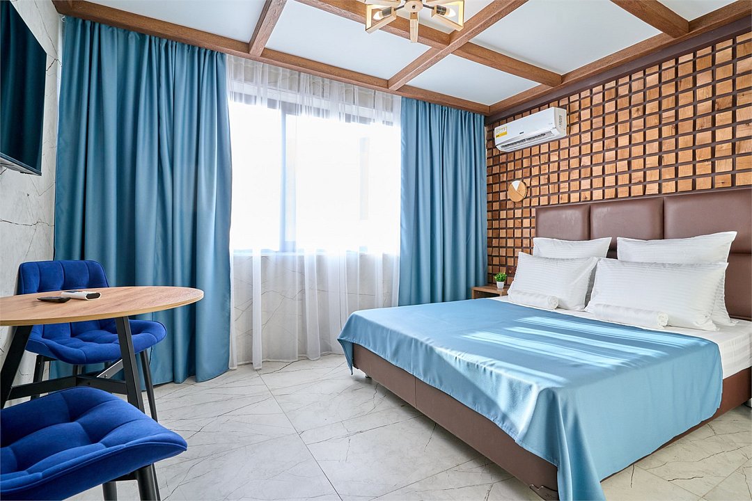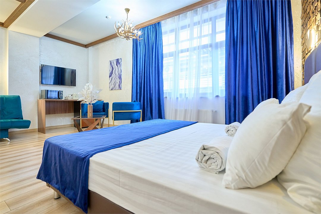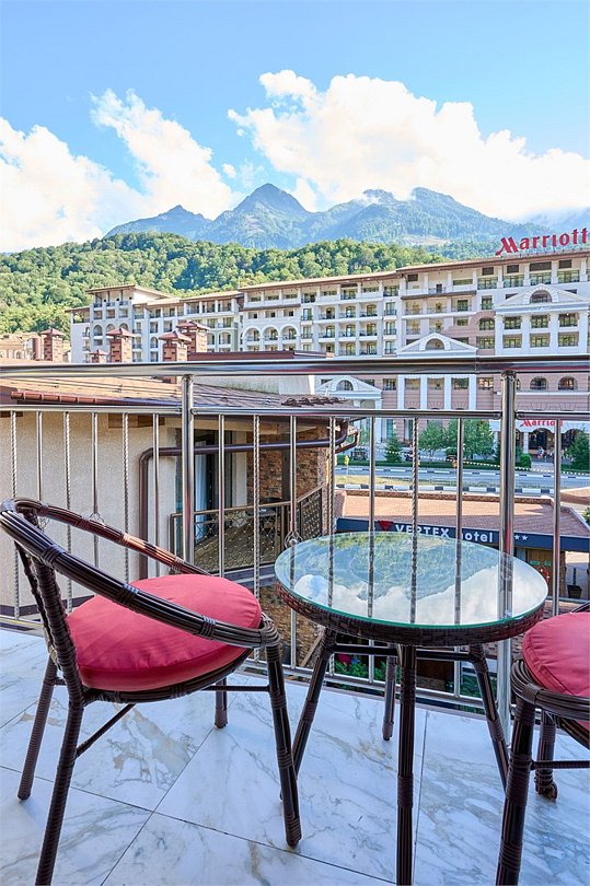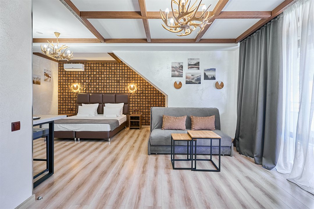 Студия с мини- кухней предлагает комфортные условия для отдыха и уединения. Номер площадью 40 м2, оснащен двуспальной кроватью и диван-кроватью, что создает комфорт и удобство, идеально подходя для семей с детьми или дружеских компаний. Уютный интерьер, продуманные детали и качественная мебель создают теплую и расслабляющую атмосферу. Номер станет отличным выбором для тех, кто ценит гармонию и высокий уровень сервиса во время своего отдыха. Номер оборудован балконам с летней мебелью и имеет вид на город и горы. Ванная комната в дизайнерском исполнении с современным душем и ванной, полностью соответствует высоким стандартам комфорта. Для вашего комфортного проживания ежедневно у вас в номере зелёный и черный чай, а также кофе и сахар в индивидуальных упаковках - предоставляются бесплатно. Халаты - предоставляются по запросу, платно (500 рублей за пользование халатом). Обращаем ваше внимание на то что фото номеров носят ознакомительный характер и являются иллюстрацией типа и категории номера, фактический цвет стен номера и деталей интерьера а также конфигурация, тип и набор предметов мебели могут отличаться от той что представлена на фотографиях.Услуги и удобства