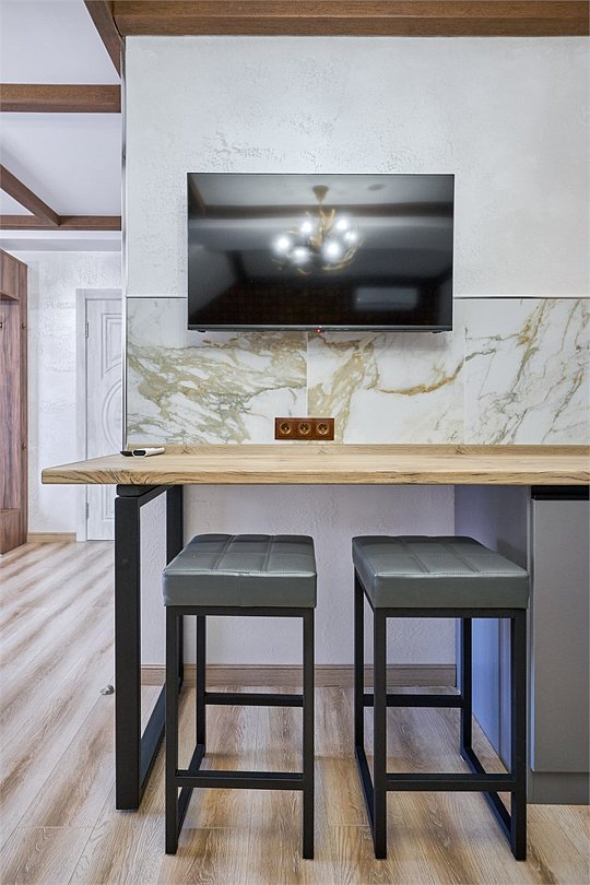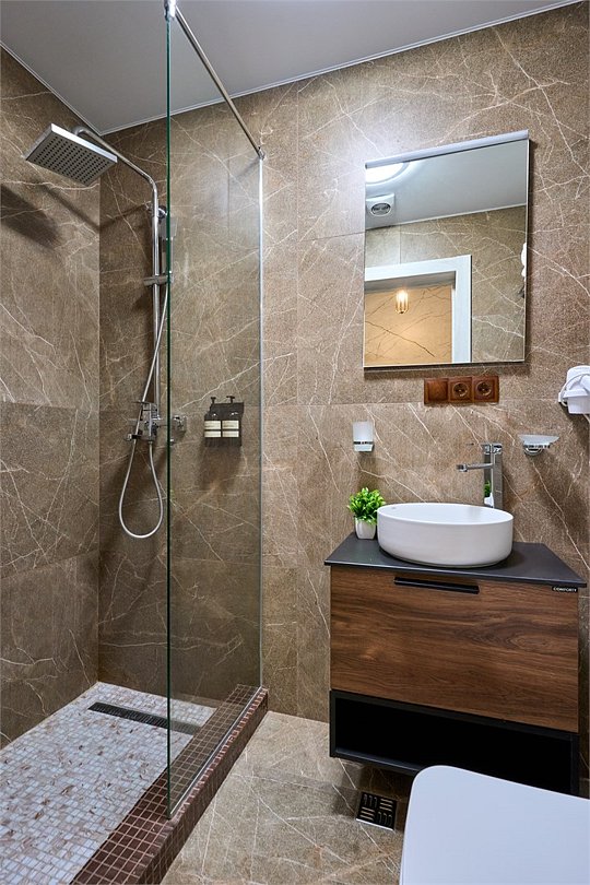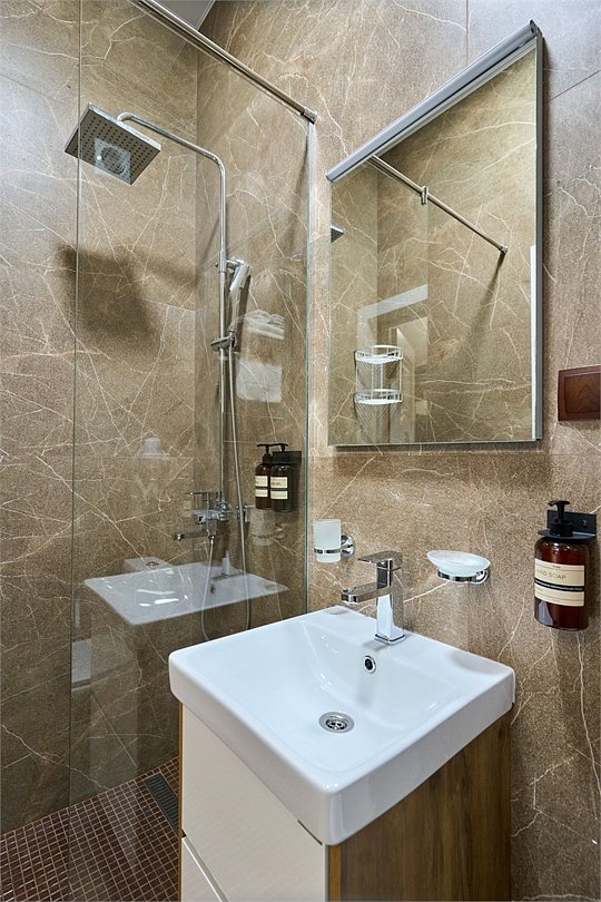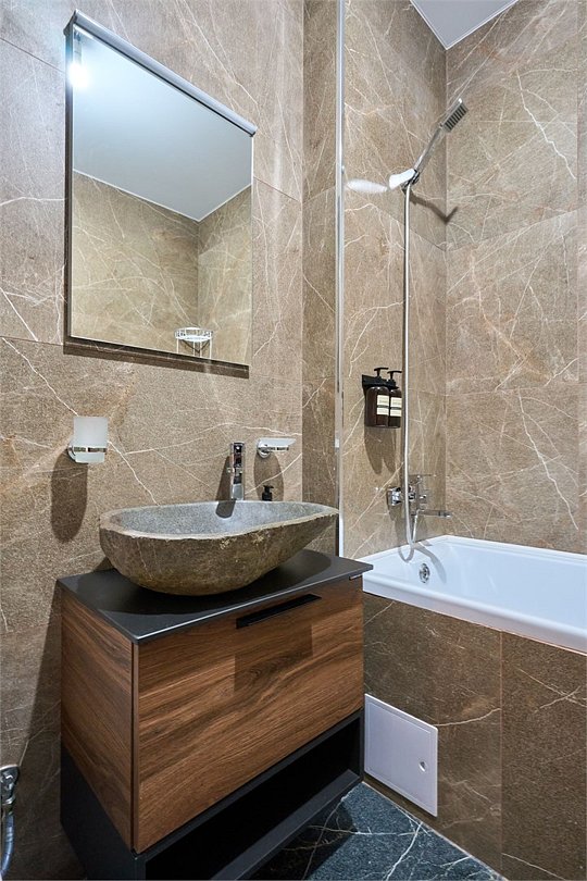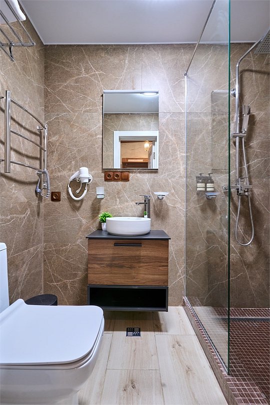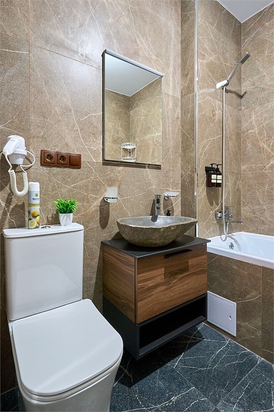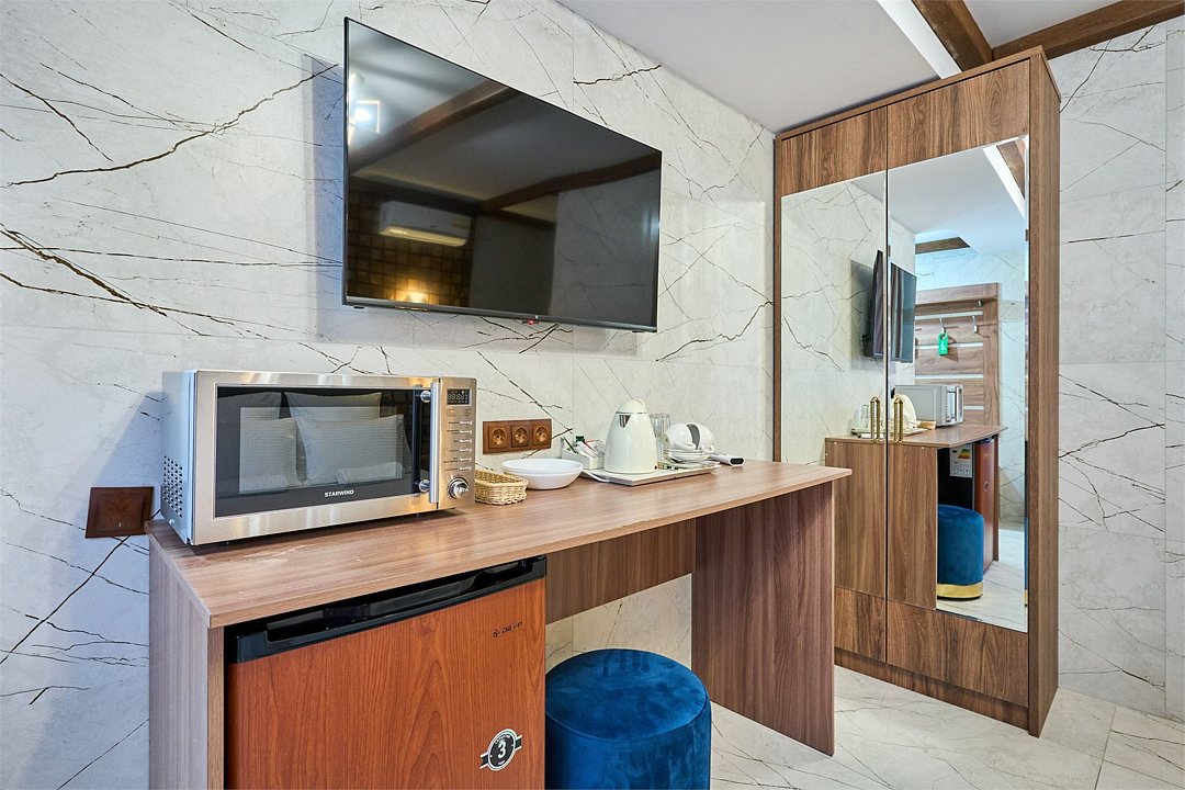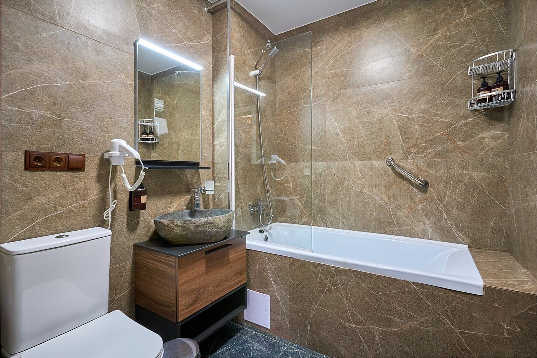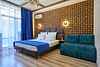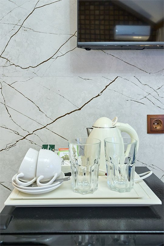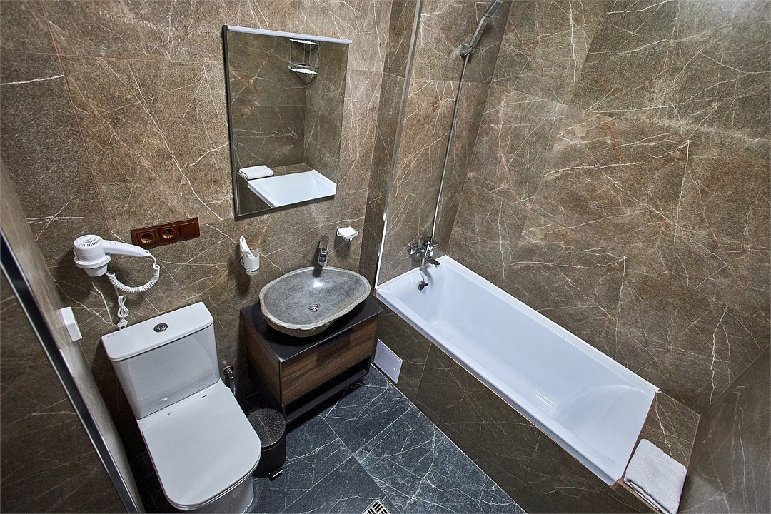 Студия с мини- кухней предлагает комфортные условия для отдыха и уединения. Номер площадью 40 м2, оснащен двуспальной кроватью и диван-кроватью, что создает комфорт и удобство, идеально подходя для семей с детьми или дружеских компаний. Уютный интерьер, продуманные детали и качественная мебель создают теплую и расслабляющую атмосферу. Номер станет отличным выбором для тех, кто ценит гармонию и высокий уровень сервиса во время своего отдыха. Номер оборудован балконам с летней мебелью и имеет вид на город и горы. Ванная комната в дизайнерском исполнении с современным душем и ванной, полностью соответствует высоким стандартам комфорта. Для вашего комфортного проживания ежедневно у вас в номере зелёный и черный чай, а также кофе и сахар в индивидуальных упаковках - предоставляются бесплатно. Халаты - предоставляются по запросу, платно (500 рублей за пользование халатом). Обращаем ваше внимание на то что фото номеров носят ознакомительный характер и являются иллюстрацией типа и категории номера, фактический цвет стен номера и деталей интерьера а также конфигурация, тип и набор предметов мебели могут отличаться от той что представлена на фотографиях.Услуги и удобства