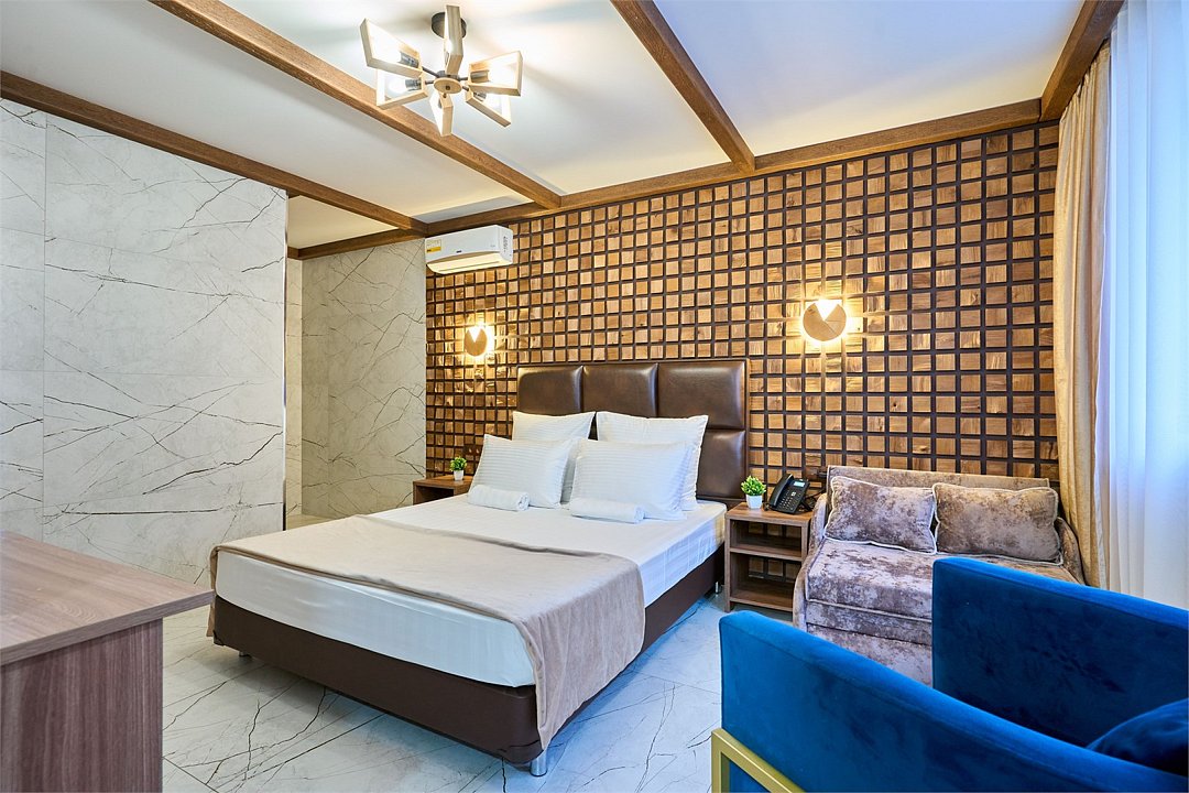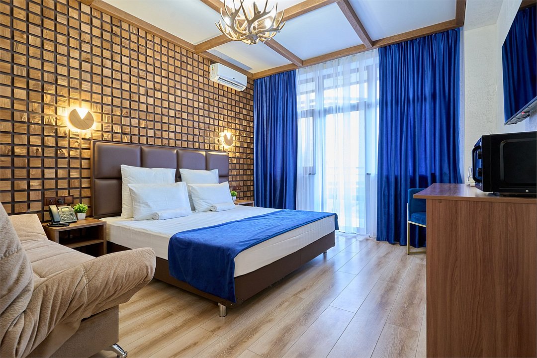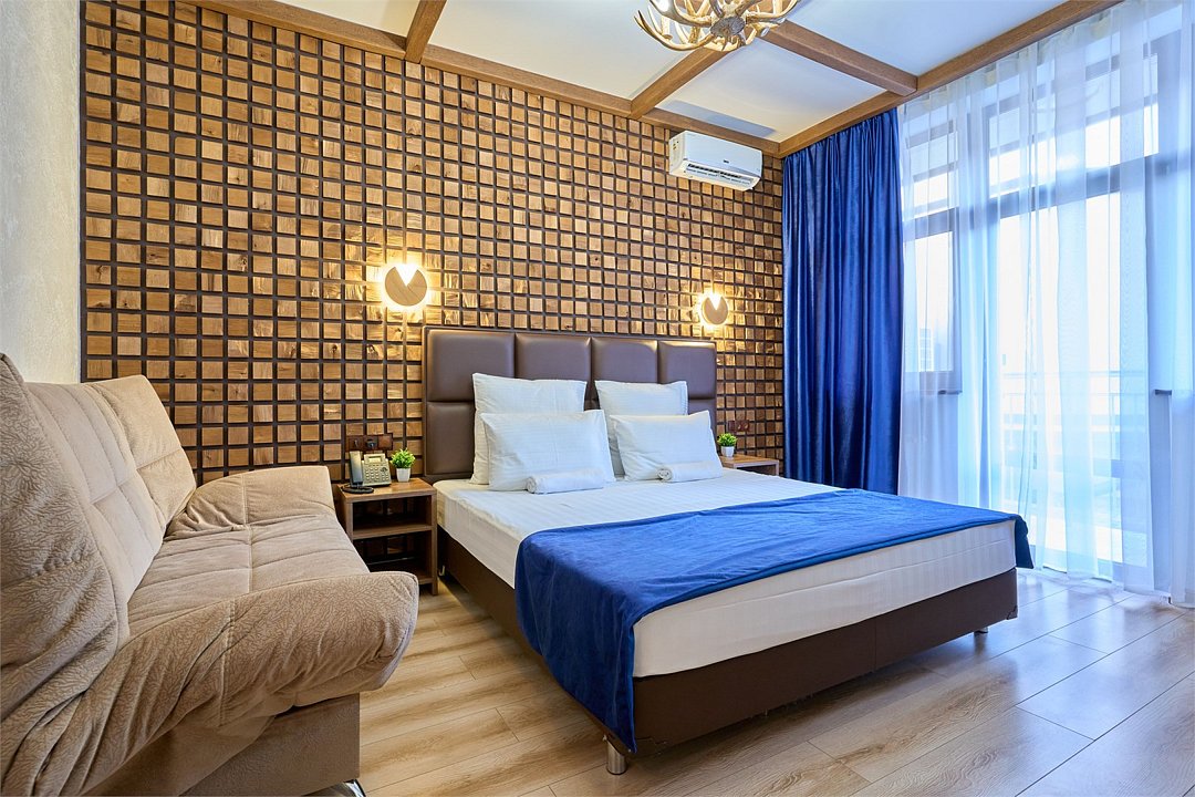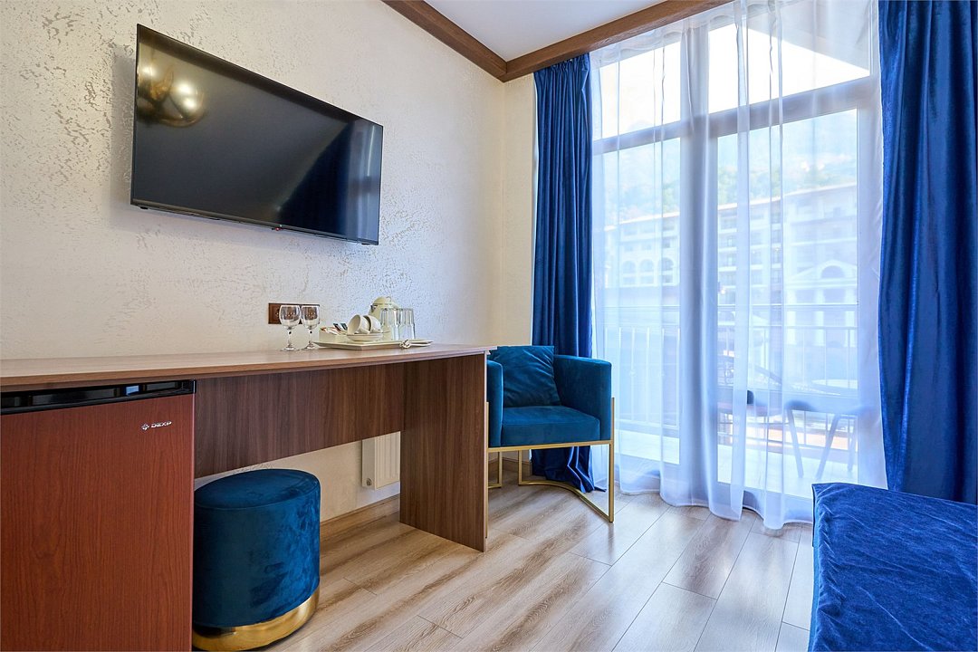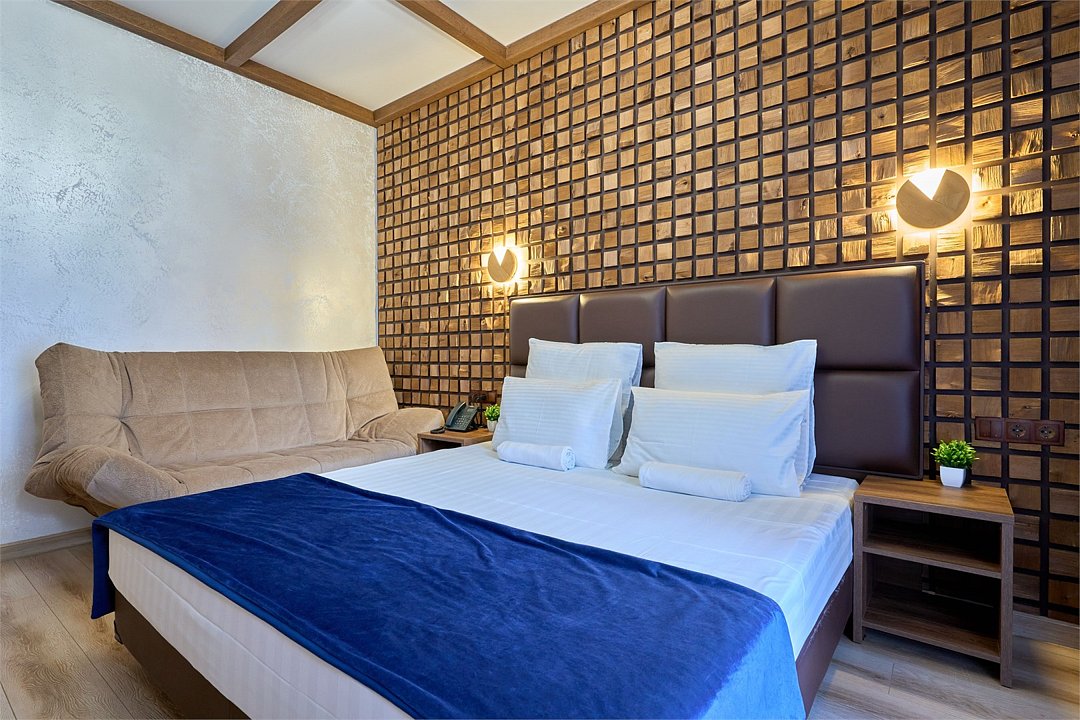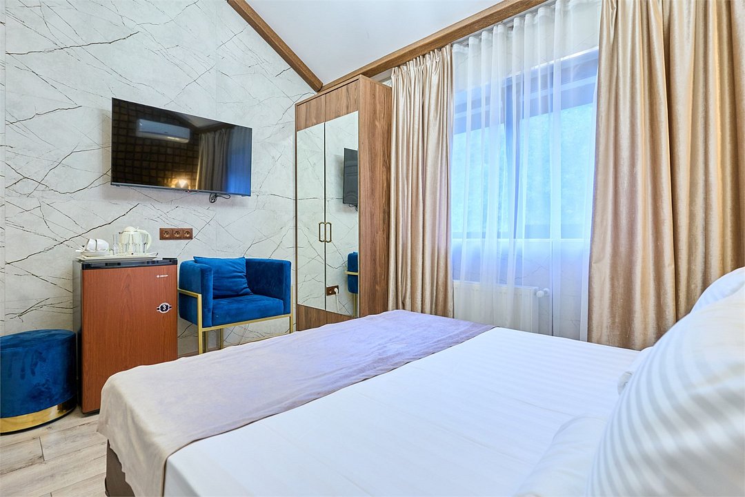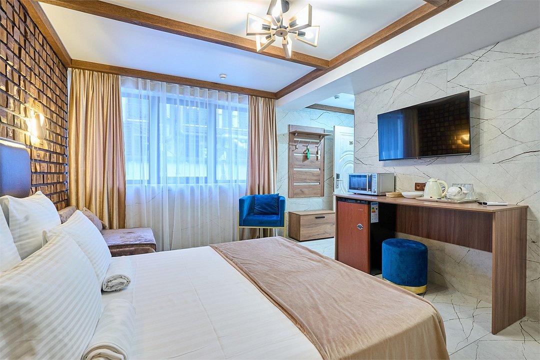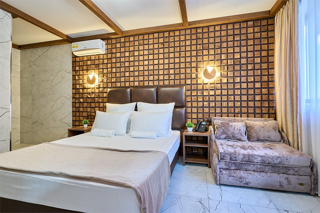 Комфортный двухместный улучшенный предлагает идеальные условия для отдыха и уединения. Каждый номер, площадью от 28 квадратных метров, оснащен как двуспальными, так и раздельными кроватями, что обеспечивает максимальный комфорт для гостей с разными предпочтениями. Дополнительный диван-кровать создает комфорт и удобство, идеально подходя для семей с детьми или дружеских компаний. Уютный интерьер, продуманные детали и качественная мебель создают теплую и расслабляющую атмосферу. Номер станет отличным выбором для тех, кто ценит гармонию и высокий уровень сервиса во время своего отдыха. Все номера оборудованы балконами с летней мебелью и имеют вид на город и внутреннюю территорию отеля. Из некоторых номеров данной категории может открываться вид на горы, (обращаем ваше внимание что не из всех номеров категории Комфорт улучшенный открывается панорамный вид на горы). Ванная комната в дизайнерском исполнении с современным душем и ванной, полностью соответствует высоким стандартам комфорта. Для вашего комфортного проживания ежедневно у вас в номере зелёный и черный чай, а также кофе и сахар в индивидуальных упаковках - предоставляются бесплатно. Халаты - предоставляются по запросу, платно (500 рублей за пользование халатом). Обращаем ваше внимание на то что фото номеров носят ознакомительный характер и являются иллюстрацией типа и категории номера, фактический цвет стен номера и деталей интерьера а также конфигурация, тип и набор предметов мебели могут отличаться от той что представлена на фотографиях. Также обращаем внимание на то что: - площадь номеров в каждой категории может варьироваться в пределах 3 квадратных метров,; - этажи на которых расположены номера могут варьироваться; - набор мебели может варьироваться (например в некоторых номерах могут быть стулья со спинкой а в некоторых номерах могут быть пуфики, в некоторых номерах могут быть небольшие сервировочные столики на колёсах а в некоторых номерах могут быть круглые столы на ножках и т.д.) Так же может отличаться вид открывающийся из номера, цвет штор цвет покрывала и саше.Услуги и удобства