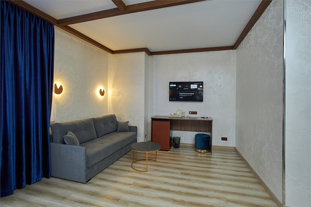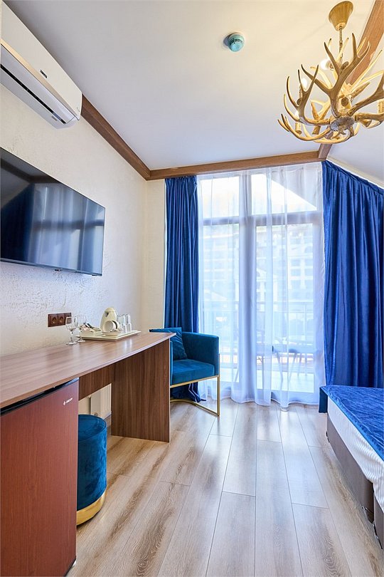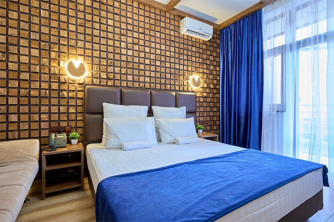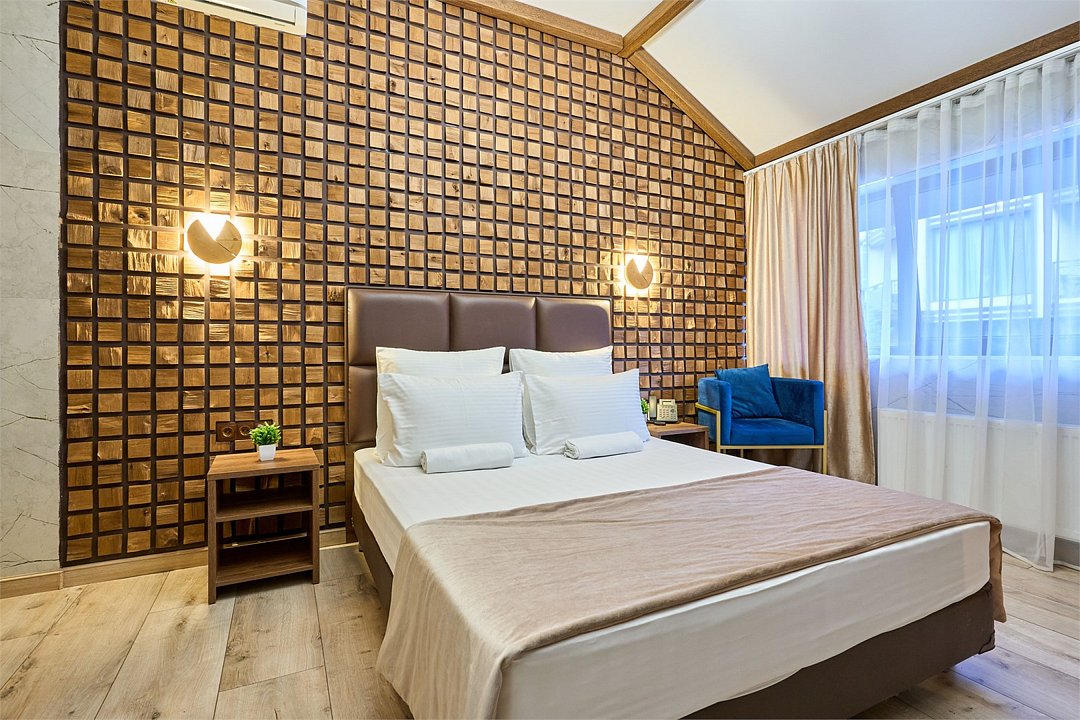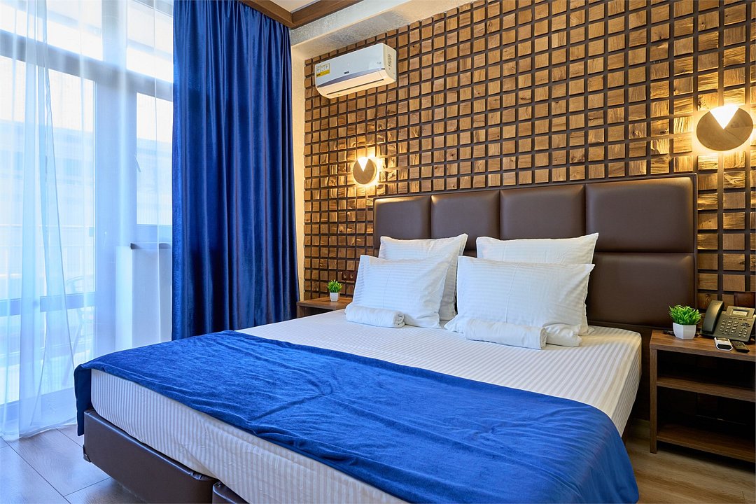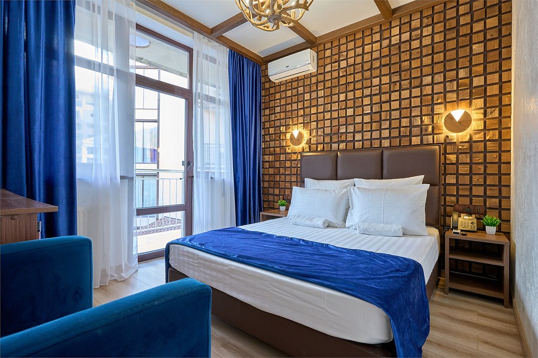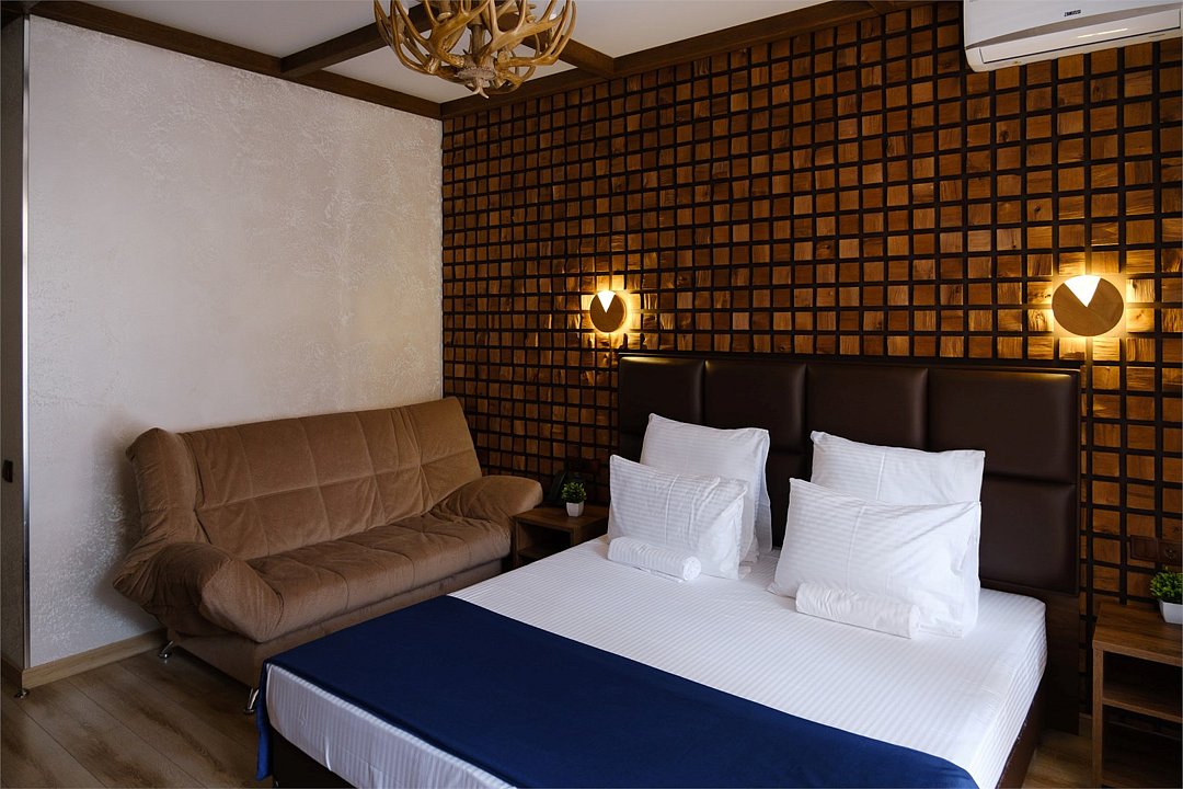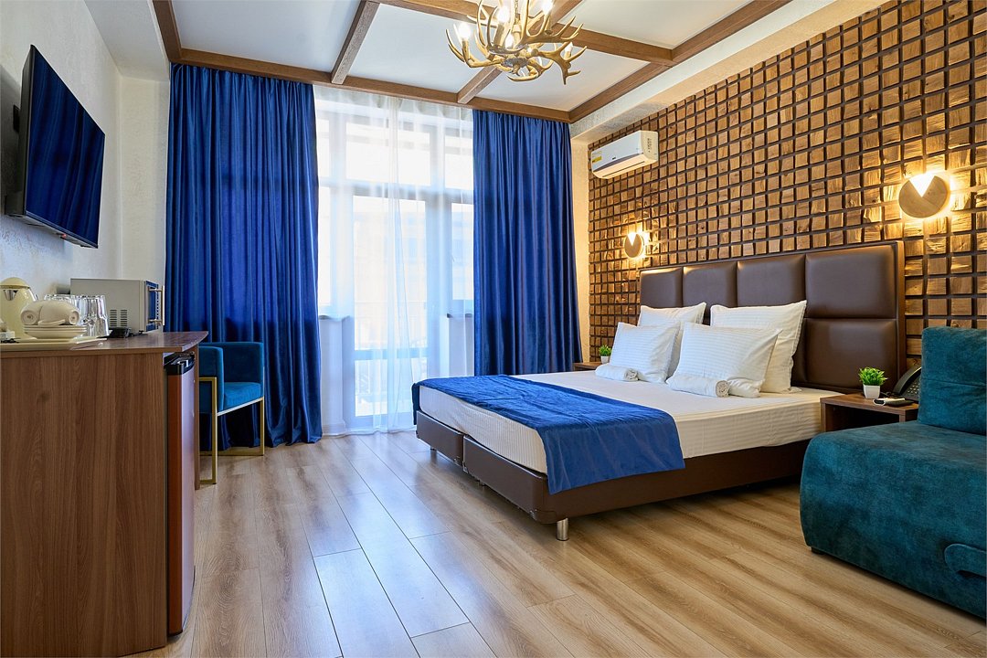 Комфортный двухместный улучшенный предлагает идеальные условия для отдыха и уединения. Каждый номер, площадью от 28 квадратных метров, оснащен как двуспальными, так и раздельными кроватями, что обеспечивает максимальный комфорт для гостей с разными предпочтениями. Дополнительный диван-кровать создает комфорт и удобство, идеально подходя для семей с детьми или дружеских компаний. Уютный интерьер, продуманные детали и качественная мебель создают теплую и расслабляющую атмосферу. Номер станет отличным выбором для тех, кто ценит гармонию и высокий уровень сервиса во время своего отдыха. Все номера оборудованы балконами с летней мебелью и имеют вид на город и внутреннюю территорию отеля. Из некоторых номеров данной категории может открываться вид на горы, (обращаем ваше внимание что не из всех номеров категории Комфорт улучшенный открывается панорамный вид на горы). Ванная комната в дизайнерском исполнении с современным душем и ванной, полностью соответствует высоким стандартам комфорта. Для вашего комфортного проживания ежедневно у вас в номере зелёный и черный чай, а также кофе и сахар в индивидуальных упаковках - предоставляются бесплатно. Халаты - предоставляются по запросу, платно (500 рублей за пользование халатом). Обращаем ваше внимание на то что фото номеров носят ознакомительный характер и являются иллюстрацией типа и категории номера, фактический цвет стен номера и деталей интерьера а также конфигурация, тип и набор предметов мебели могут отличаться от той что представлена на фотографиях. Также обращаем внимание на то что: - площадь номеров в каждой категории может варьироваться в пределах 3 квадратных метров,; - этажи на которых расположены номера могут варьироваться; - набор мебели может варьироваться (например в некоторых номерах могут быть стулья со спинкой а в некоторых номерах могут быть пуфики, в некоторых номерах могут быть небольшие сервировочные столики на колёсах а в некоторых номерах могут быть круглые столы на ножках и т.д.) Так же может отличаться вид открывающийся из номера, цвет штор цвет покрывала и саше.Услуги и удобства
