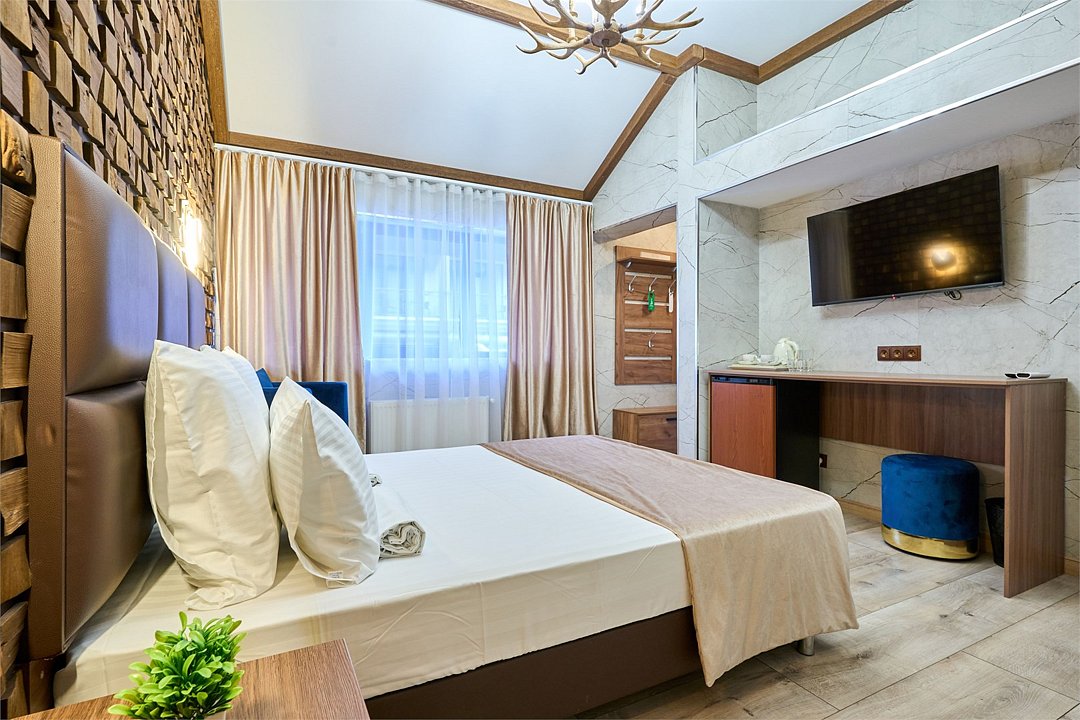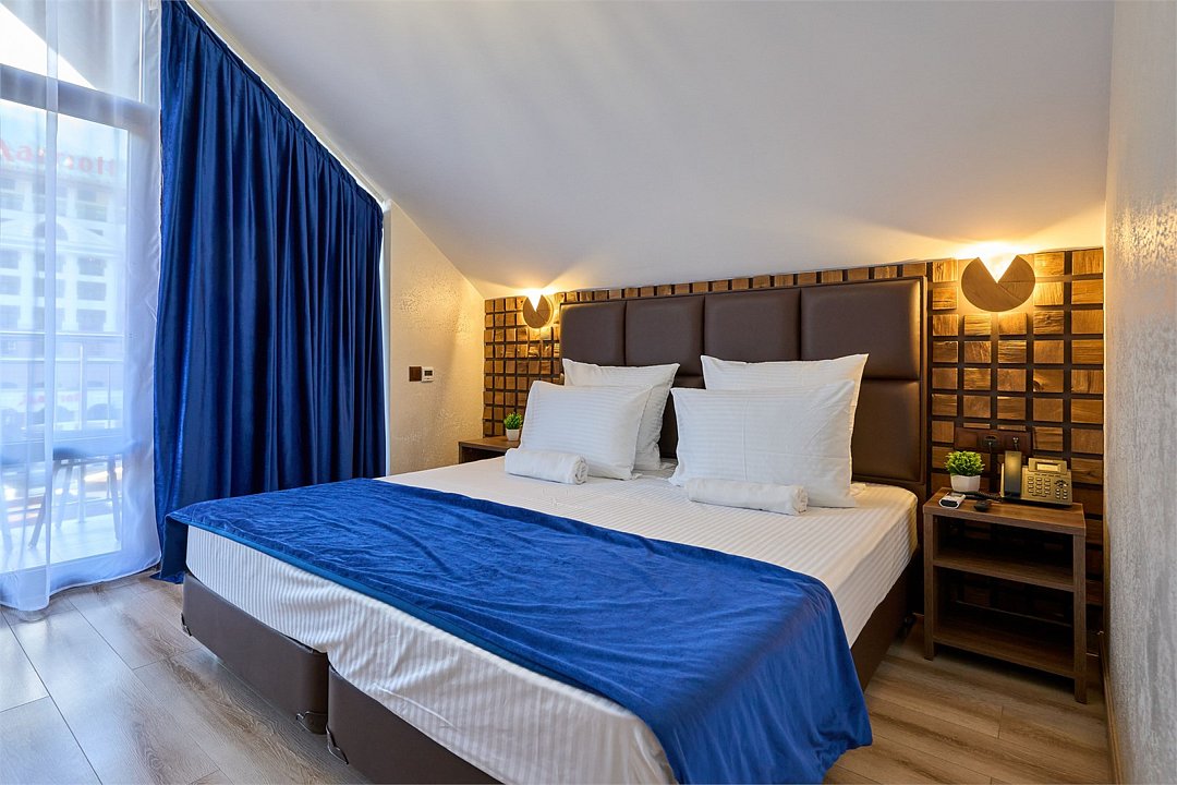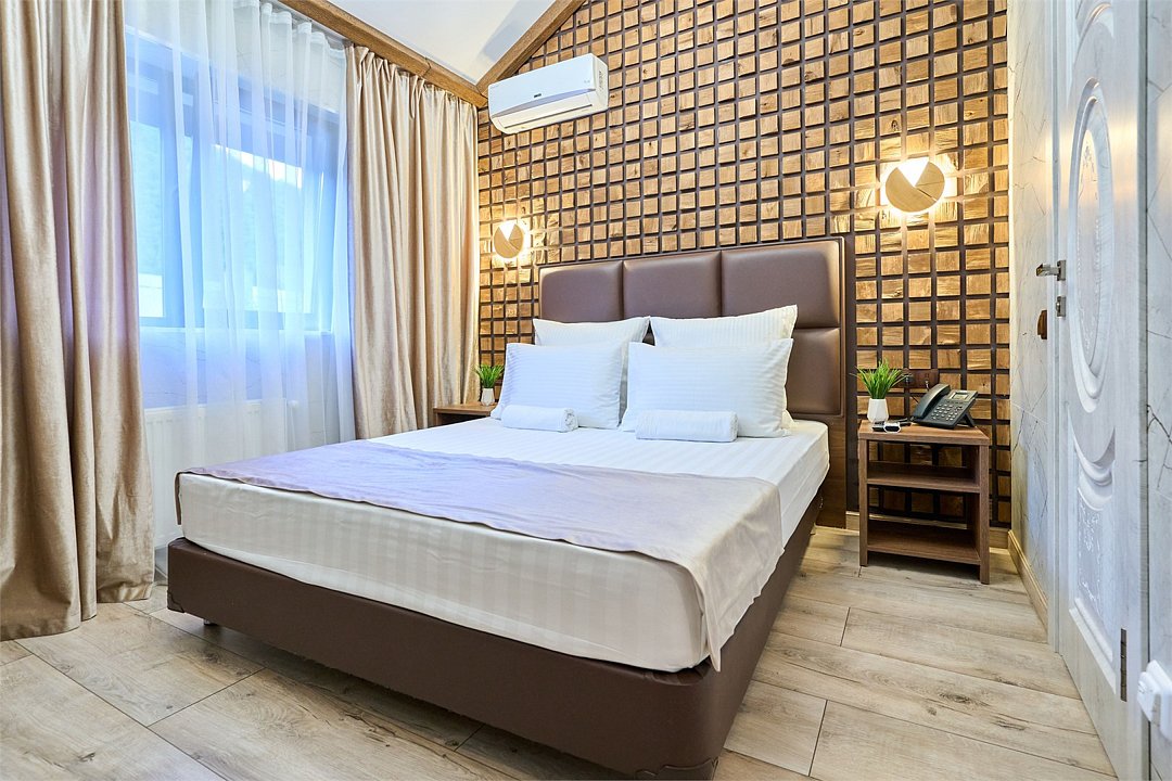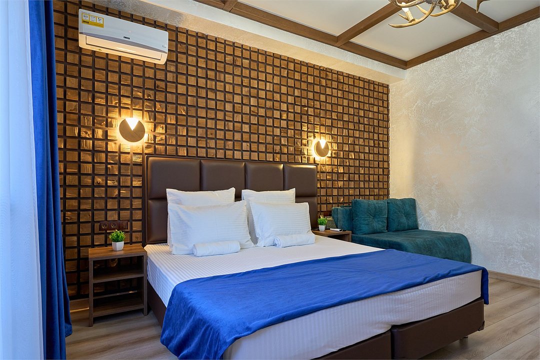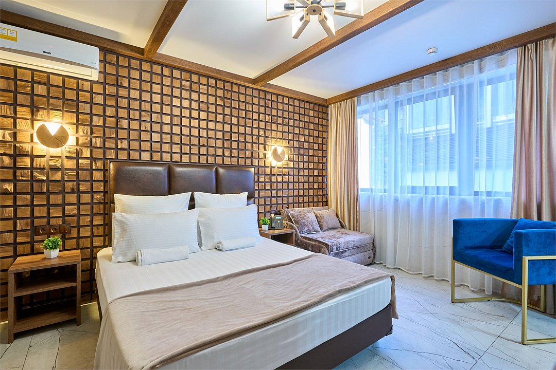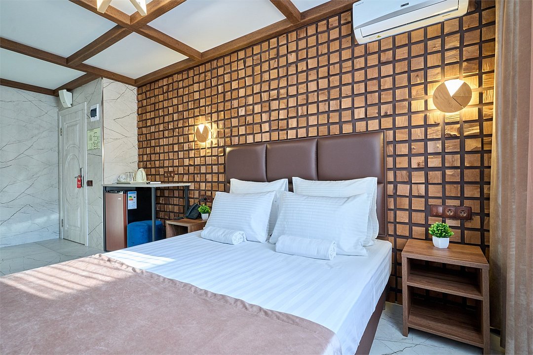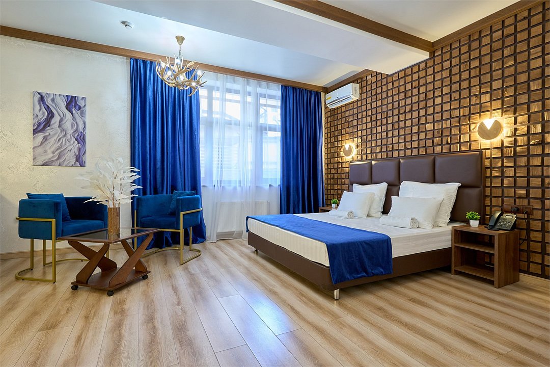 Комфортный двухместный улучшенный предлагает идеальные условия для отдыха и уединения. Каждый номер, площадью от 28 квадратных метров, оснащен как двуспальными, так и раздельными кроватями, что обеспечивает максимальный комфорт для гостей с разными предпочтениями. Дополнительный диван-кровать создает комфорт и удобство, идеально подходя для семей с детьми или дружеских компаний. Уютный интерьер, продуманные детали и качественная мебель создают теплую и расслабляющую атмосферу. Номер станет отличным выбором для тех, кто ценит гармонию и высокий уровень сервиса во время своего отдыха. Все номера оборудованы балконами с летней мебелью и имеют вид на город и внутреннюю территорию отеля. Из некоторых номеров данной категории может открываться вид на горы, (обращаем ваше внимание что не из всех номеров категории Комфорт улучшенный открывается панорамный вид на горы). Ванная комната в дизайнерском исполнении с современным душем и ванной, полностью соответствует высоким стандартам комфорта. Для вашего комфортного проживания ежедневно у вас в номере зелёный и черный чай, а также кофе и сахар в индивидуальных упаковках - предоставляются бесплатно. Халаты - предоставляются по запросу, платно (500 рублей за пользование халатом). Обращаем ваше внимание на то что фото номеров носят ознакомительный характер и являются иллюстрацией типа и категории номера, фактический цвет стен номера и деталей интерьера а также конфигурация, тип и набор предметов мебели могут отличаться от той что представлена на фотографиях. Также обращаем внимание на то что: - площадь номеров в каждой категории может варьироваться в пределах 3 квадратных метров,; - этажи на которых расположены номера могут варьироваться; - набор мебели может варьироваться (например в некоторых номерах могут быть стулья со спинкой а в некоторых номерах могут быть пуфики, в некоторых номерах могут быть небольшие сервировочные столики на колёсах а в некоторых номерах могут быть круглые столы на ножках и т.д.) Так же может отличаться вид открывающийся из номера, цвет штор цвет покрывала и саше.Услуги и удобства