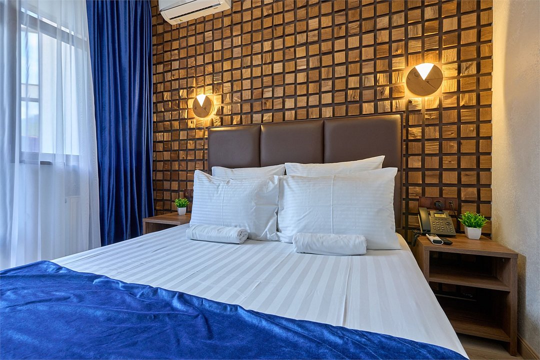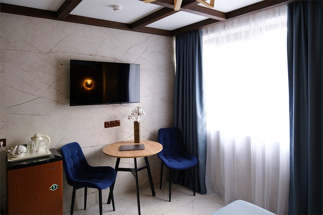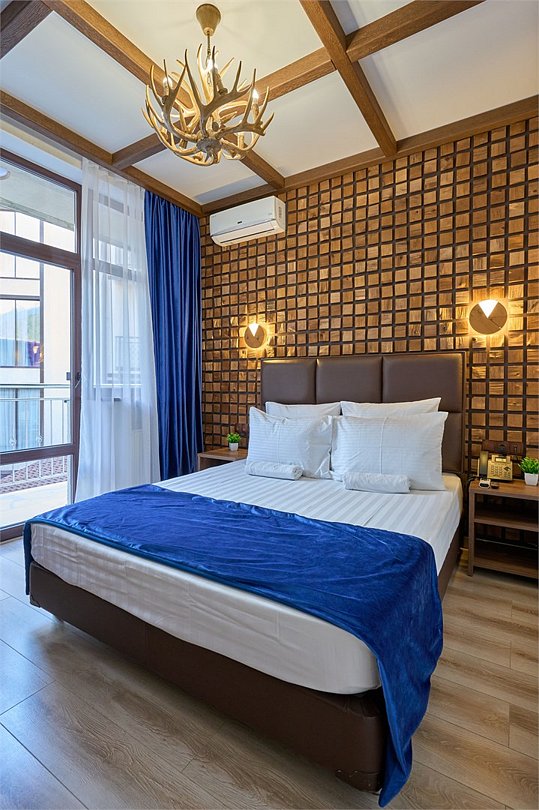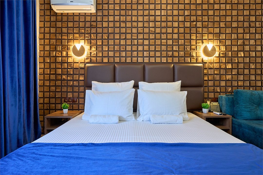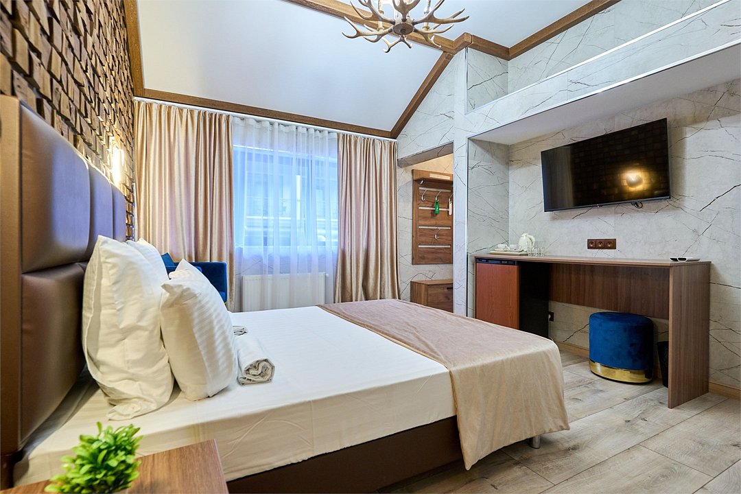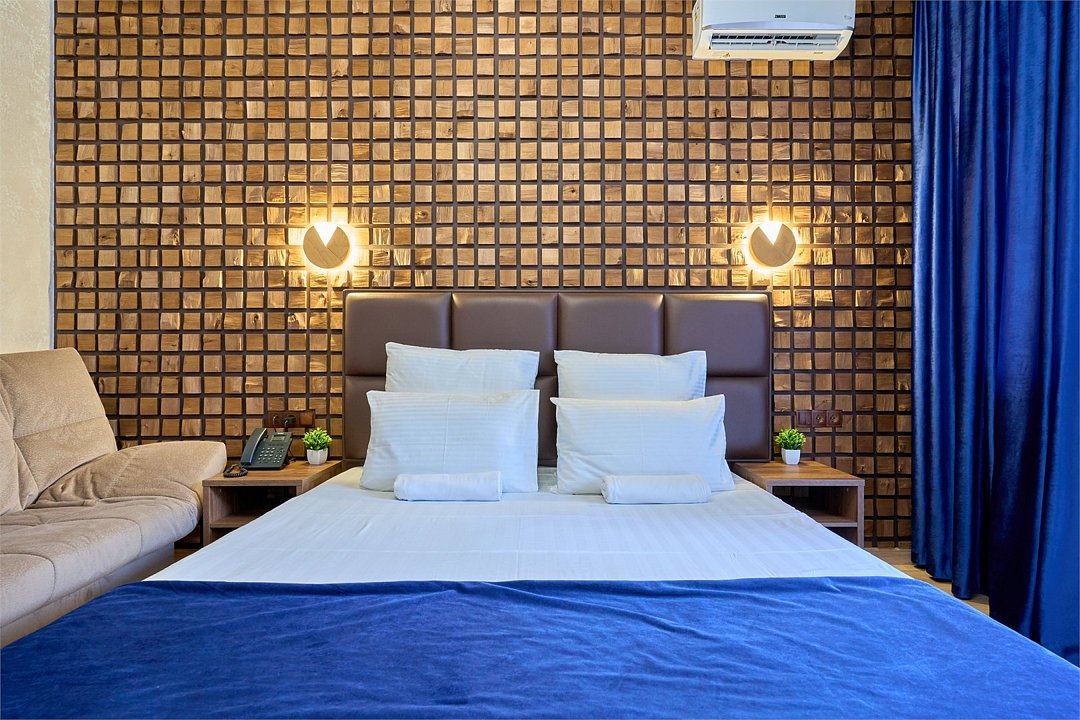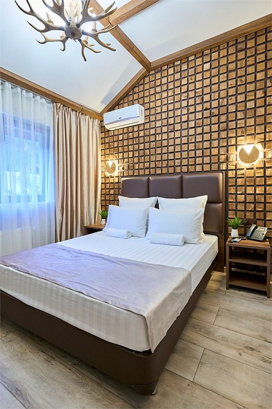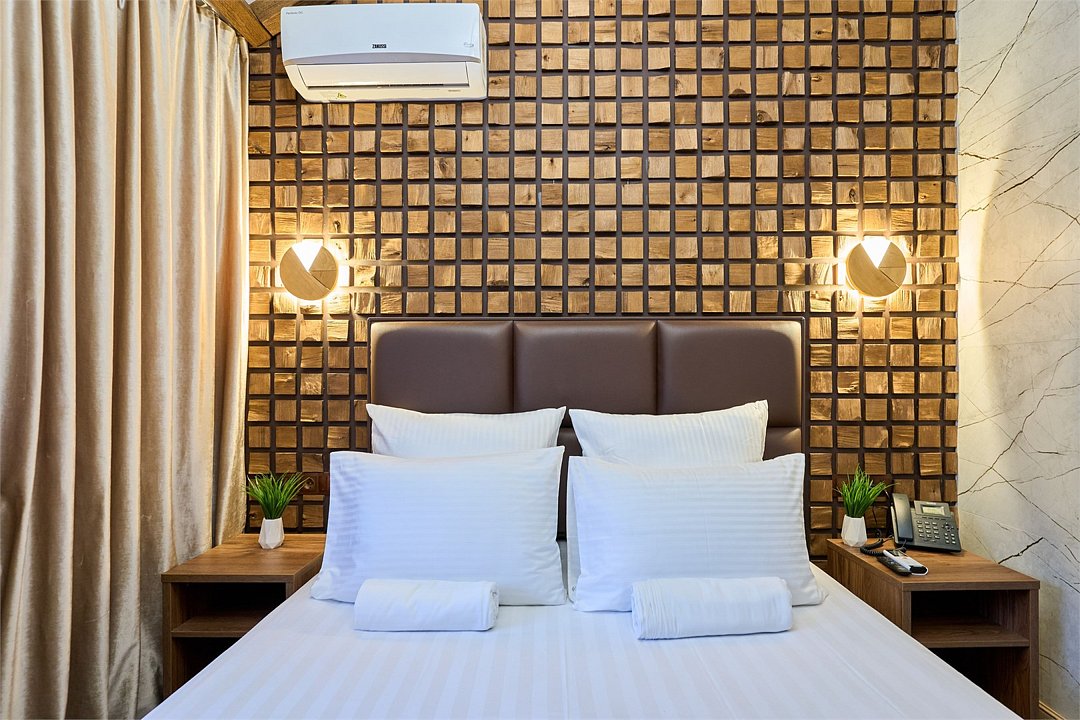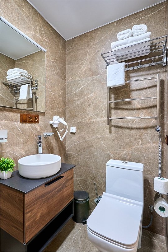 Комфортный двухместный улучшенный предлагает идеальные условия для отдыха и уединения. Каждый номер, площадью от 28 квадратных метров, оснащен как двуспальными, так и раздельными кроватями, что обеспечивает максимальный комфорт для гостей с разными предпочтениями. Дополнительный диван-кровать создает комфорт и удобство, идеально подходя для семей с детьми или дружеских компаний. Уютный интерьер, продуманные детали и качественная мебель создают теплую и расслабляющую атмосферу. Номер станет отличным выбором для тех, кто ценит гармонию и высокий уровень сервиса во время своего отдыха. Все номера оборудованы балконами с летней мебелью и имеют вид на город и внутреннюю территорию отеля. Из некоторых номеров данной категории может открываться вид на горы, (обращаем ваше внимание что не из всех номеров категории Комфорт улучшенный открывается панорамный вид на горы). Ванная комната в дизайнерском исполнении с современным душем и ванной, полностью соответствует высоким стандартам комфорта. Для вашего комфортного проживания ежедневно у вас в номере зелёный и черный чай, а также кофе и сахар в индивидуальных упаковках - предоставляются бесплатно. Халаты - предоставляются по запросу, платно (500 рублей за пользование халатом). Обращаем ваше внимание на то что фото номеров носят ознакомительный характер и являются иллюстрацией типа и категории номера, фактический цвет стен номера и деталей интерьера а также конфигурация, тип и набор предметов мебели могут отличаться от той что представлена на фотографиях. Также обращаем внимание на то что: - площадь номеров в каждой категории может варьироваться в пределах 3 квадратных метров,; - этажи на которых расположены номера могут варьироваться; - набор мебели может варьироваться (например в некоторых номерах могут быть стулья со спинкой а в некоторых номерах могут быть пуфики, в некоторых номерах могут быть небольшие сервировочные столики на колёсах а в некоторых номерах могут быть круглые столы на ножках и т.д.) Так же может отличаться вид открывающийся из номера, цвет штор цвет покрывала и саше.Услуги и удобства