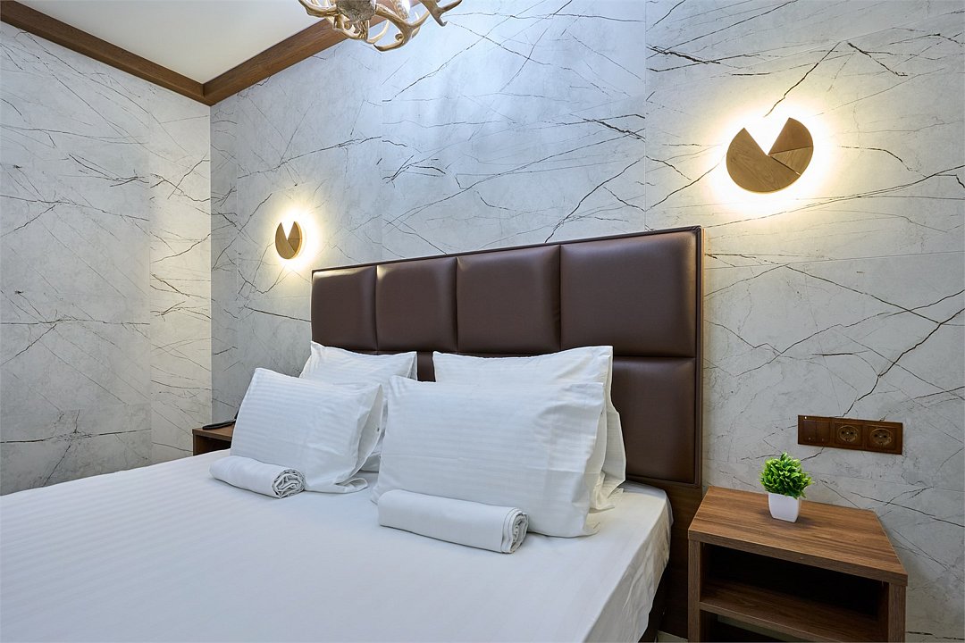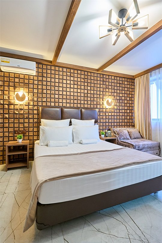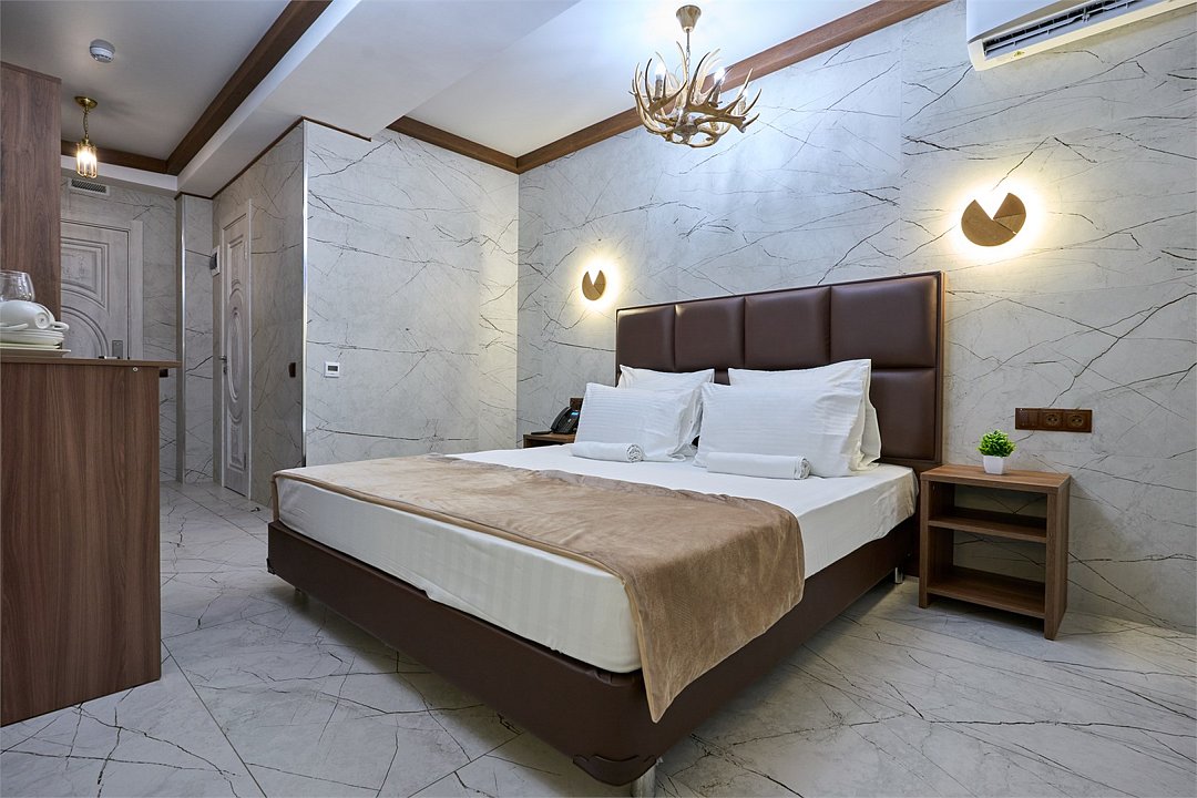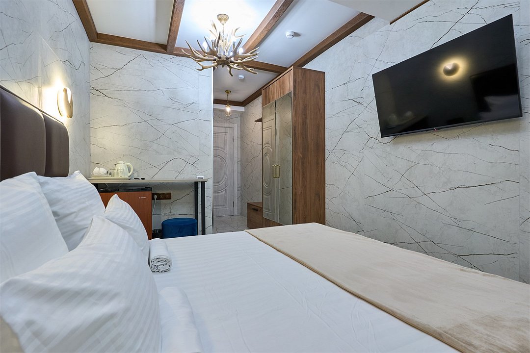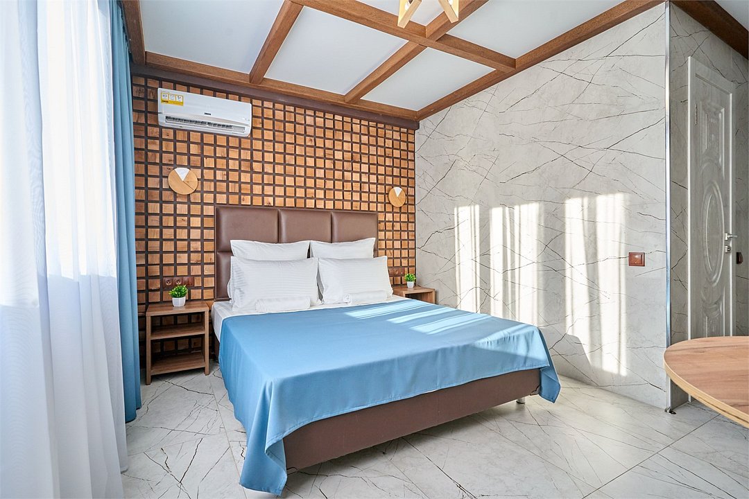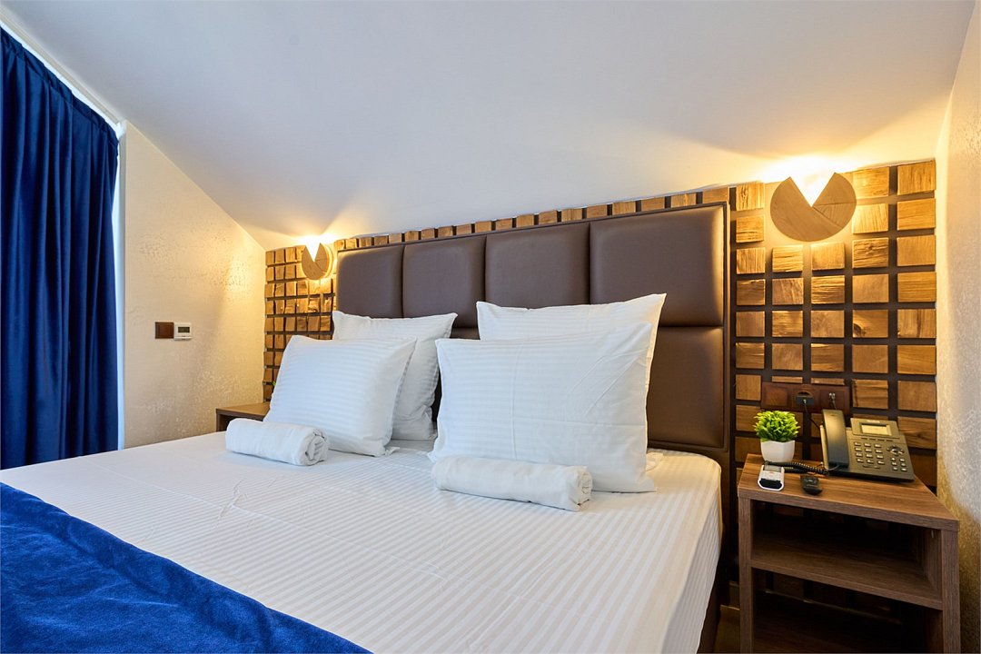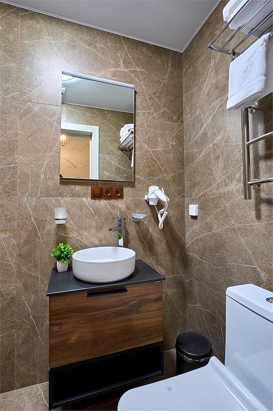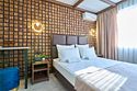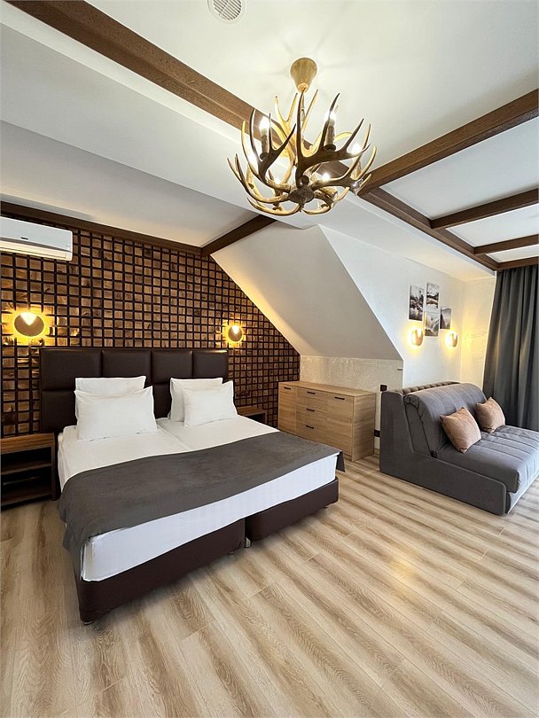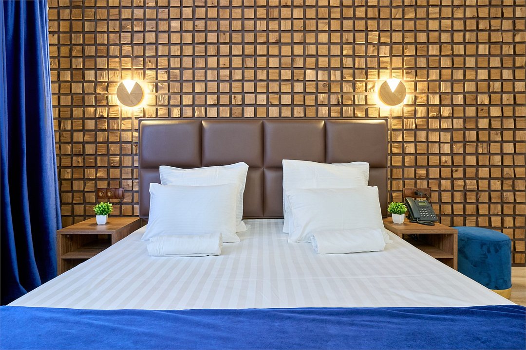 Комфортный двухместный улучшенный предлагает идеальные условия для отдыха и уединения. Каждый номер, площадью от 28 квадратных метров, оснащен как двуспальными, так и раздельными кроватями, что обеспечивает максимальный комфорт для гостей с разными предпочтениями. Дополнительный диван-кровать создает комфорт и удобство, идеально подходя для семей с детьми или дружеских компаний. Уютный интерьер, продуманные детали и качественная мебель создают теплую и расслабляющую атмосферу. Номер станет отличным выбором для тех, кто ценит гармонию и высокий уровень сервиса во время своего отдыха. Все номера оборудованы балконами с летней мебелью и имеют вид на город и внутреннюю территорию отеля. Из некоторых номеров данной категории может открываться вид на горы, (обращаем ваше внимание что не из всех номеров категории Комфорт улучшенный открывается панорамный вид на горы). Ванная комната в дизайнерском исполнении с современным душем и ванной, полностью соответствует высоким стандартам комфорта. Для вашего комфортного проживания ежедневно у вас в номере зелёный и черный чай, а также кофе и сахар в индивидуальных упаковках - предоставляются бесплатно. Халаты - предоставляются по запросу, платно (500 рублей за пользование халатом). Обращаем ваше внимание на то что фото номеров носят ознакомительный характер и являются иллюстрацией типа и категории номера, фактический цвет стен номера и деталей интерьера а также конфигурация, тип и набор предметов мебели могут отличаться от той что представлена на фотографиях. Также обращаем внимание на то что: - площадь номеров в каждой категории может варьироваться в пределах 3 квадратных метров,; - этажи на которых расположены номера могут варьироваться; - набор мебели может варьироваться (например в некоторых номерах могут быть стулья со спинкой а в некоторых номерах могут быть пуфики, в некоторых номерах могут быть небольшие сервировочные столики на колёсах а в некоторых номерах могут быть круглые столы на ножках и т.д.) Так же может отличаться вид открывающийся из номера, цвет штор цвет покрывала и саше.Услуги и удобства