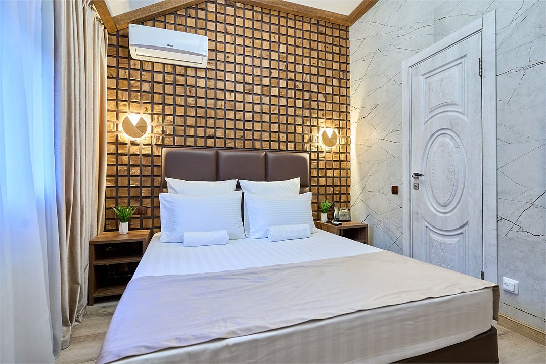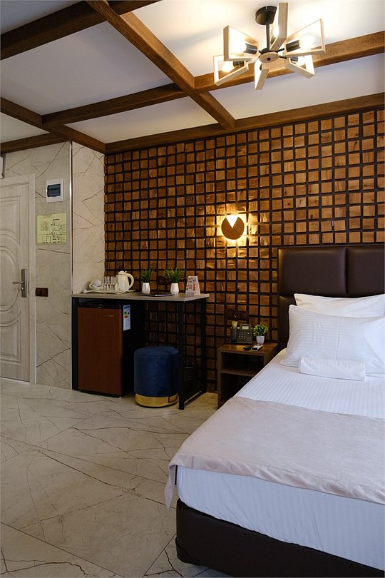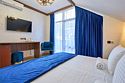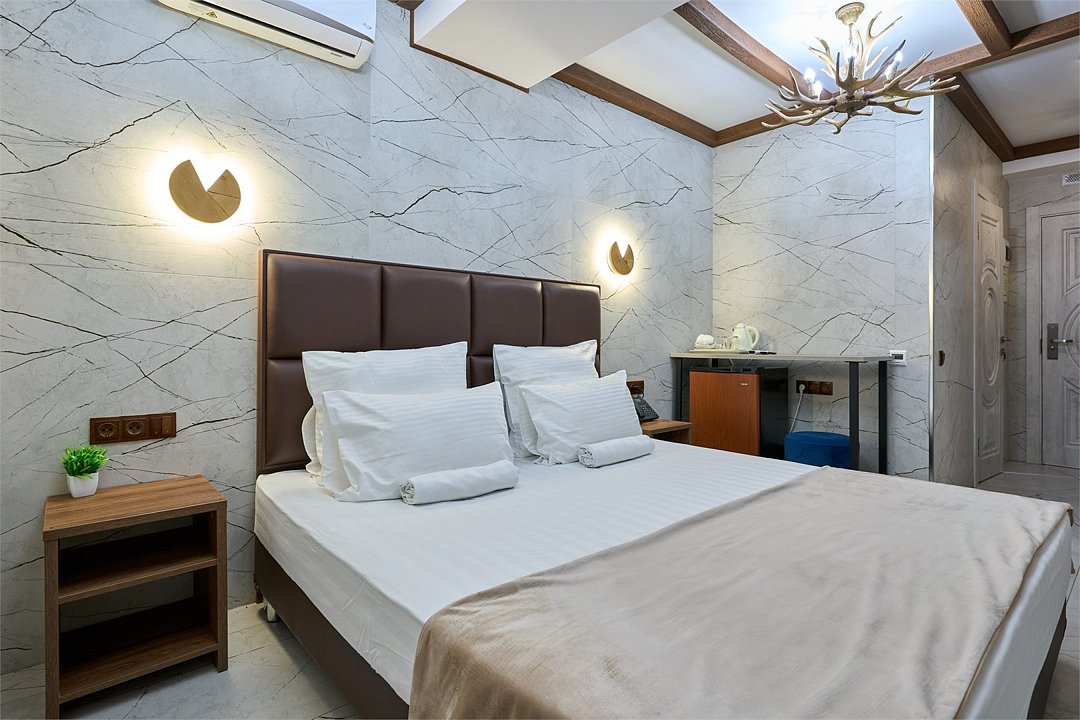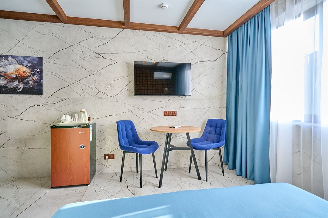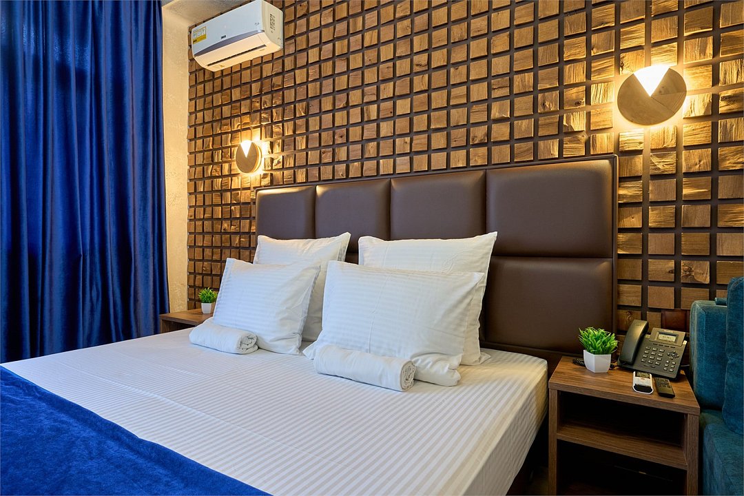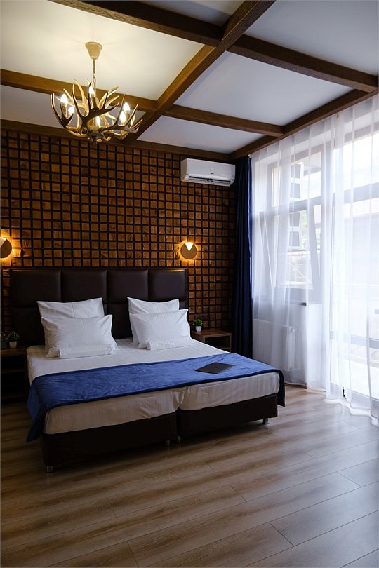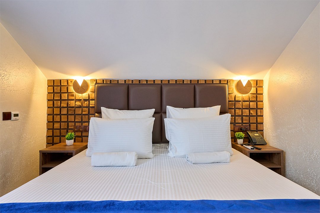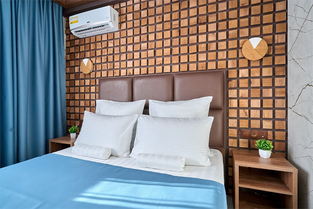 Комфортный двухместный улучшенный предлагает идеальные условия для отдыха и уединения. Каждый номер, площадью от 28 квадратных метров, оснащен как двуспальными, так и раздельными кроватями, что обеспечивает максимальный комфорт для гостей с разными предпочтениями. Дополнительный диван-кровать создает комфорт и удобство, идеально подходя для семей с детьми или дружеских компаний. Уютный интерьер, продуманные детали и качественная мебель создают теплую и расслабляющую атмосферу. Номер станет отличным выбором для тех, кто ценит гармонию и высокий уровень сервиса во время своего отдыха. Все номера оборудованы балконами с летней мебелью и имеют вид на город и внутреннюю территорию отеля. Из некоторых номеров данной категории может открываться вид на горы, (обращаем ваше внимание что не из всех номеров категории Комфорт улучшенный открывается панорамный вид на горы). Ванная комната в дизайнерском исполнении с современным душем и ванной, полностью соответствует высоким стандартам комфорта. Для вашего комфортного проживания ежедневно у вас в номере зелёный и черный чай, а также кофе и сахар в индивидуальных упаковках - предоставляются бесплатно. Халаты - предоставляются по запросу, платно (500 рублей за пользование халатом). Обращаем ваше внимание на то что фото номеров носят ознакомительный характер и являются иллюстрацией типа и категории номера, фактический цвет стен номера и деталей интерьера а также конфигурация, тип и набор предметов мебели могут отличаться от той что представлена на фотографиях. Также обращаем внимание на то что: - площадь номеров в каждой категории может варьироваться в пределах 3 квадратных метров,; - этажи на которых расположены номера могут варьироваться; - набор мебели может варьироваться (например в некоторых номерах могут быть стулья со спинкой а в некоторых номерах могут быть пуфики, в некоторых номерах могут быть небольшие сервировочные столики на колёсах а в некоторых номерах могут быть круглые столы на ножках и т.д.) Так же может отличаться вид открывающийся из номера, цвет штор цвет покрывала и саше.Услуги и удобства