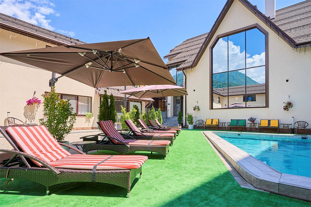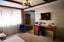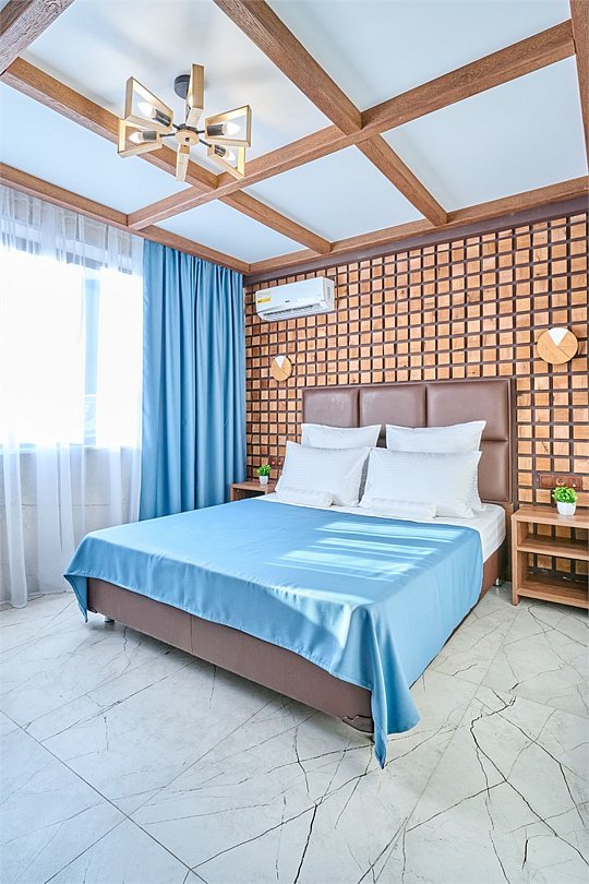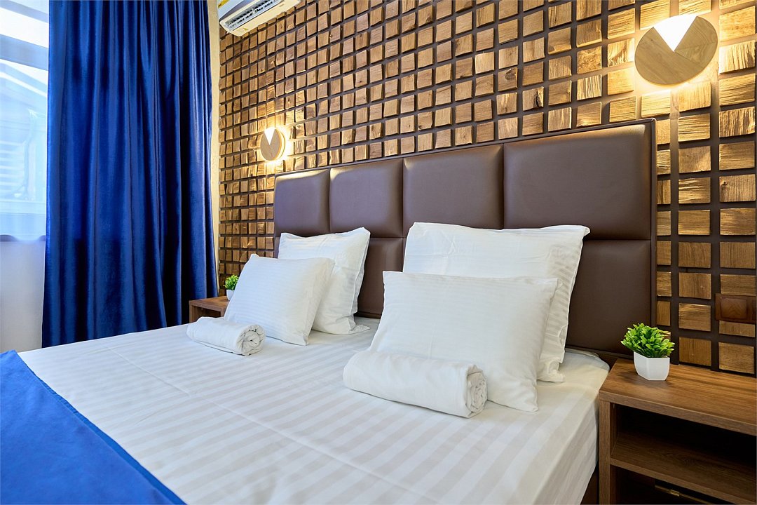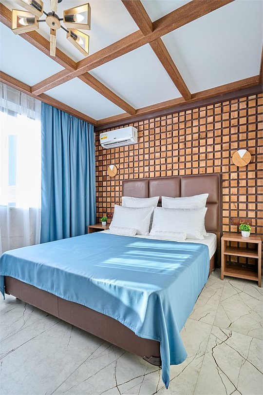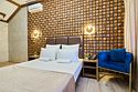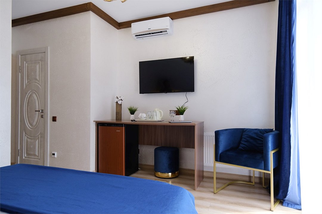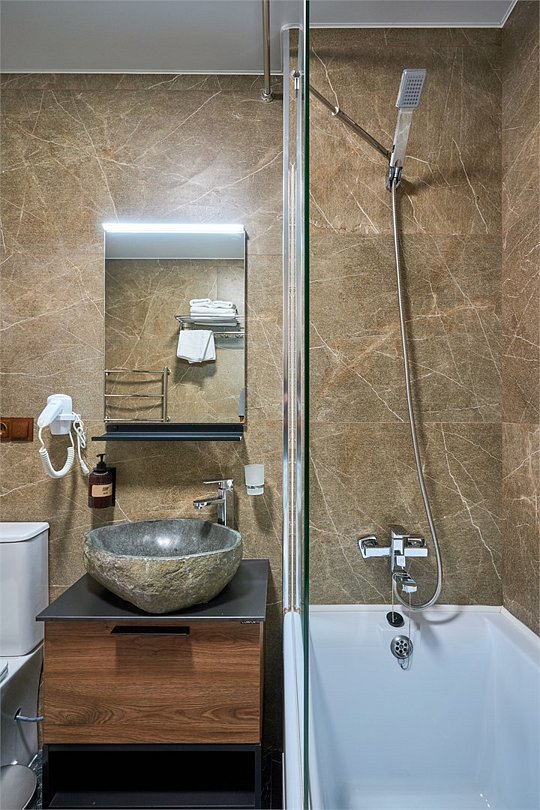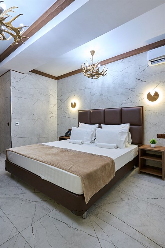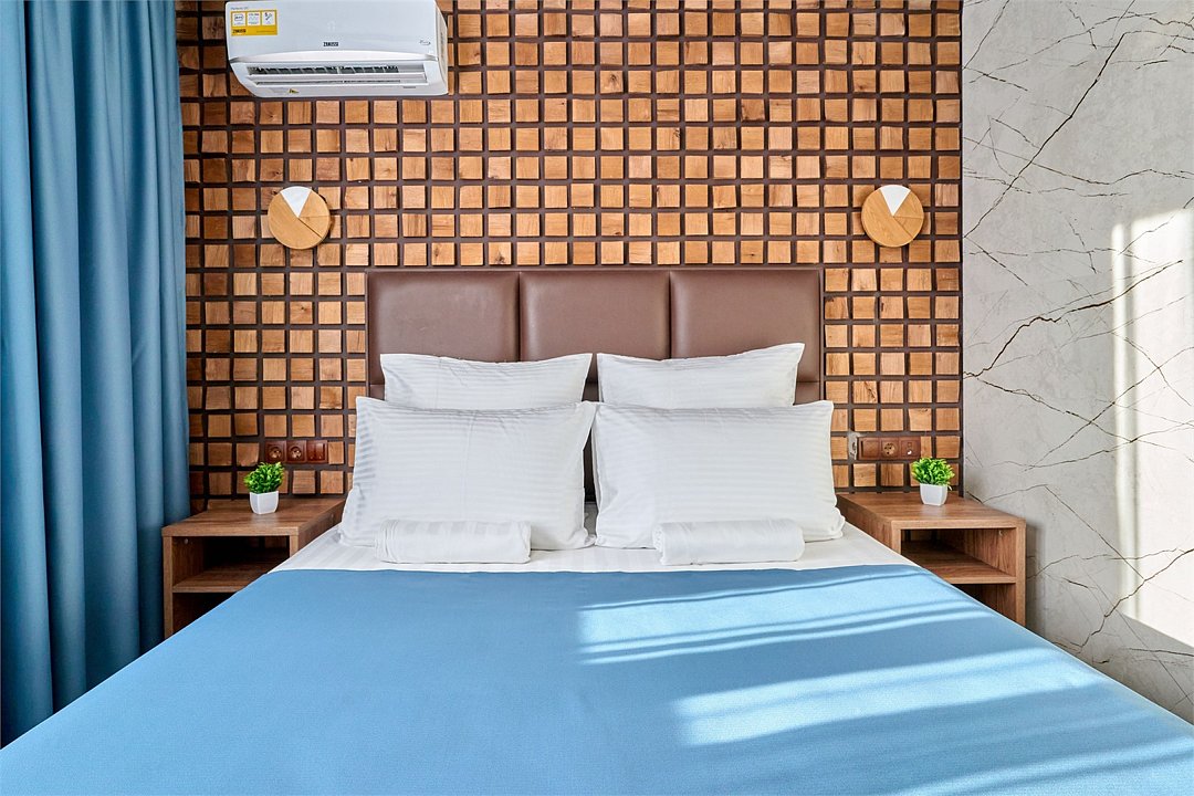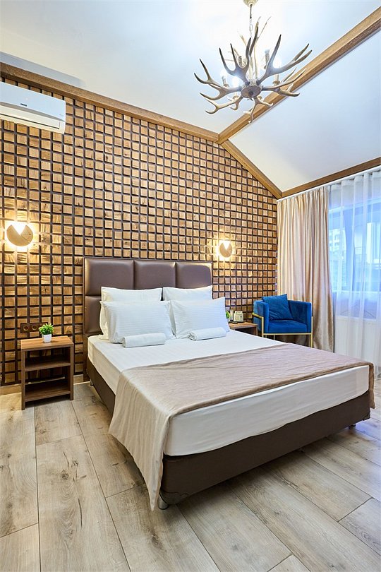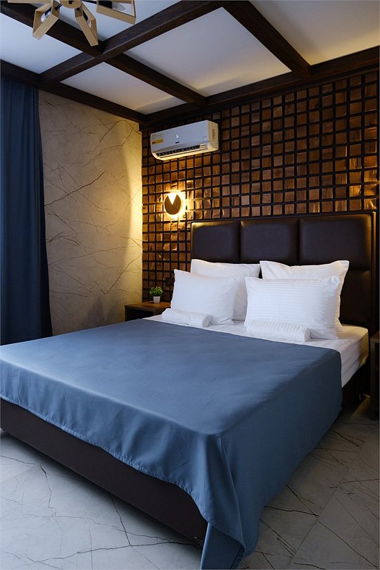Комфортный двухместный улучшенный предлагает идеальные условия для отдыха и уединения. Каждый номер, площадью от 28 квадратных метров, оснащен как двуспальными, так и раздельными кроватями, что обеспечивает максимальный комфорт для гостей с разными предпочтениями. Дополнительный диван-кровать создает комфорт и удобство, идеально подходя для семей с детьми или дружеских компаний. Уютный интерьер, продуманные детали и качественная мебель создают теплую и расслабляющую атмосферу. Номер станет отличным выбором для тех, кто ценит гармонию и высокий уровень сервиса во время своего отдыха. Все номера оборудованы балконами с летней мебелью и имеют вид на город и внутреннюю территорию отеля. Из некоторых номеров данной категории может открываться вид на горы, (обращаем ваше внимание что не из всех номеров категории Комфорт улучшенный открывается панорамный вид на горы). Ванная комната в дизайнерском исполнении с современным душем и ванной, полностью соответствует высоким стандартам комфорта. Для вашего комфортного проживания ежедневно у вас в номере зелёный и черный чай, а также кофе и сахар в индивидуальных упаковках - предоставляются бесплатно. Халаты - предоставляются по запросу, платно (500 рублей за пользование халатом). Обращаем ваше внимание на то что фото номеров носят ознакомительный характер и являются иллюстрацией типа и категории номера, фактический цвет стен номера и деталей интерьера а также конфигурация, тип и набор предметов мебели могут отличаться от той что представлена на фотографиях. Также обращаем внимание на то что: - площадь номеров в каждой категории может варьироваться в пределах 3 квадратных метров,; - этажи на которых расположены номера могут варьироваться; - набор мебели может варьироваться (например в некоторых номерах могут быть стулья со спинкой а в некоторых номерах могут быть пуфики, в некоторых номерах могут быть небольшие сервировочные столики на колёсах а в некоторых номерах могут быть круглые столы на ножках и т.д.) Так же может отличаться вид открывающийся из номера, цвет штор цвет покрывала и саше.Услуги и удобства