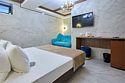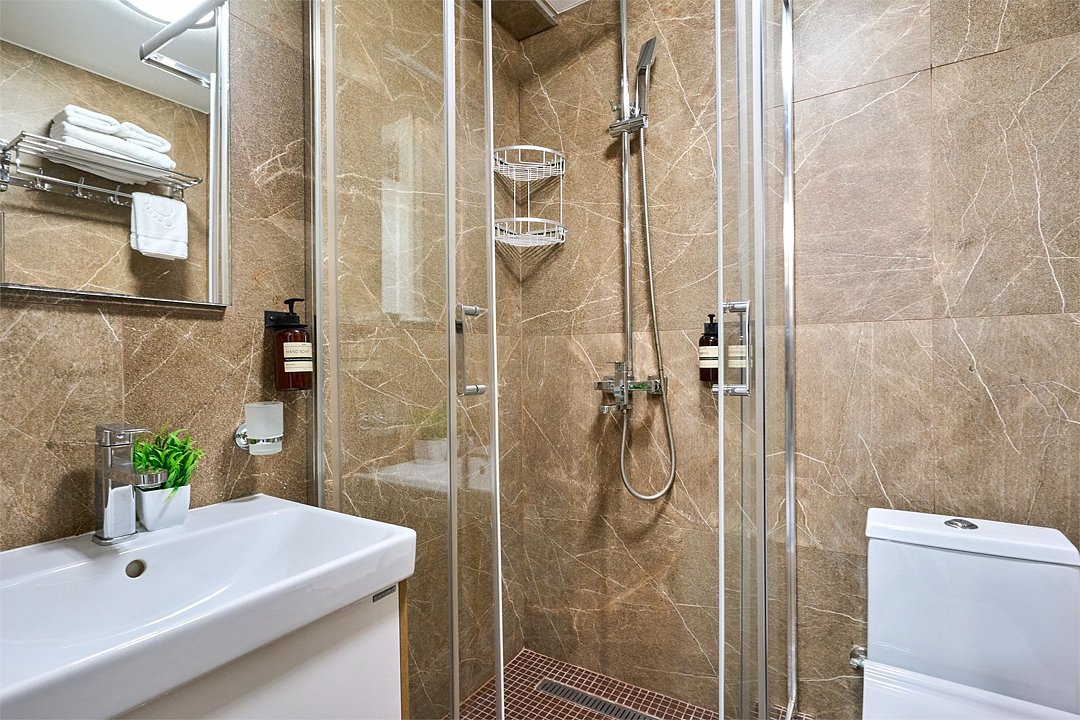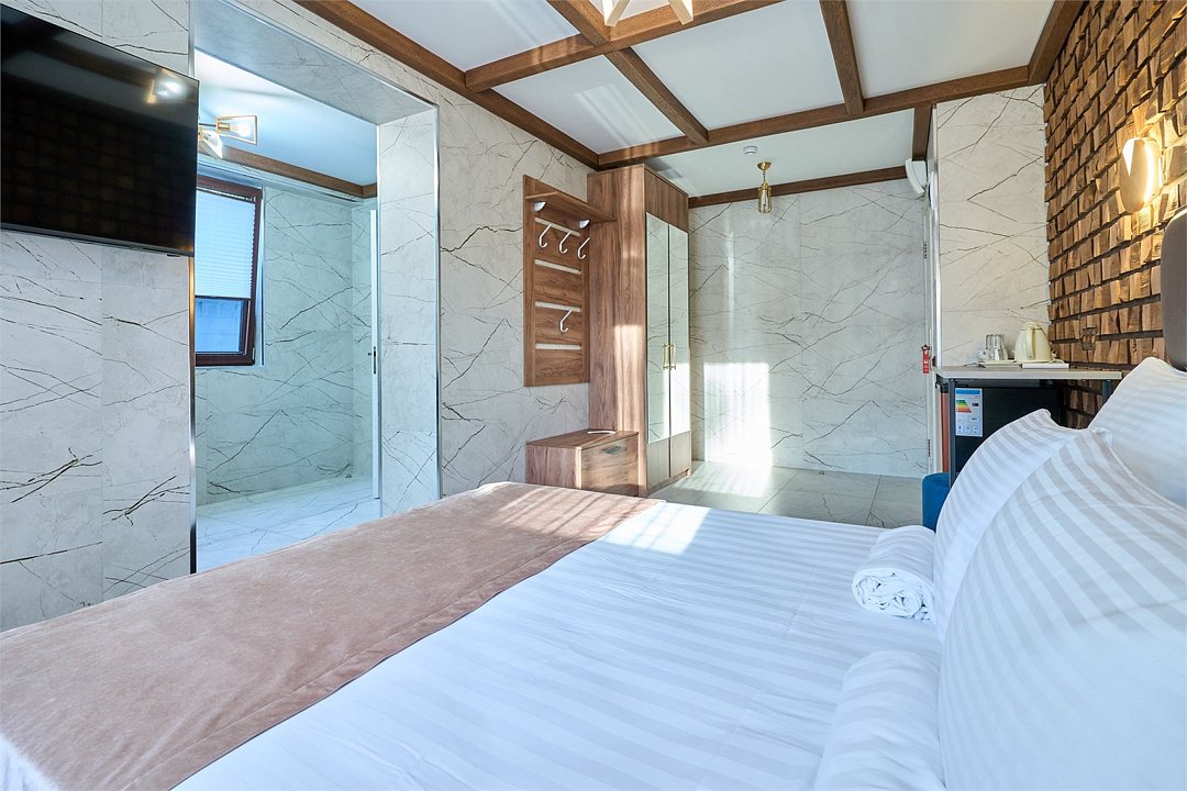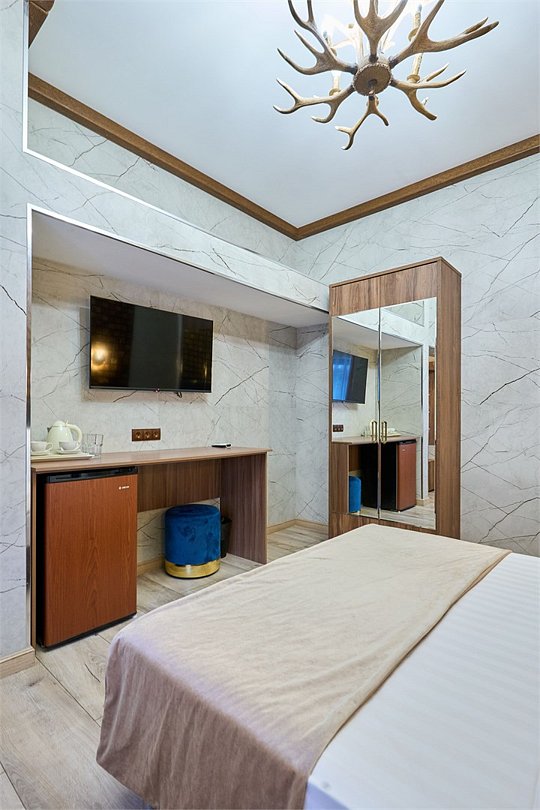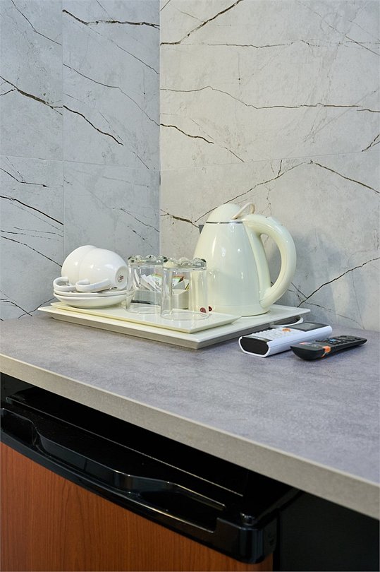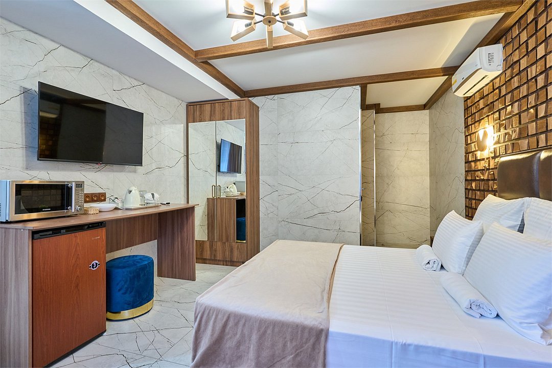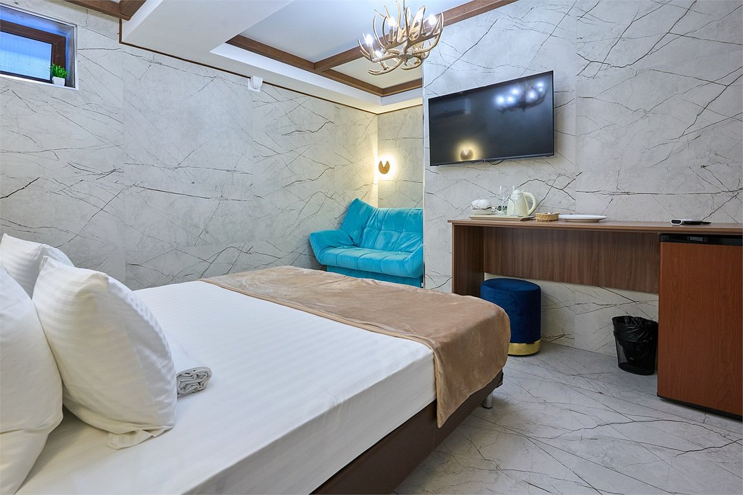 Wi-Fi, кондиционер, фен, электронные замки, утюг, душевая кабина, теплый пол, халаты, тапочки, двуспальная кровать, стулья, шкаф для одежды, чайный набор, обслуживание номеров, сейф, чайник, унитаз, раковина, душ, кулер на этаже, плиточное покрытие, стаканы, столовые приборы, стол, туалетные средства, туалет, цифровое тв, внутренний телефон, телевизор с плоским экраном, мини-холодильник, без окна, теплые полы, номер для некурящих, общественный бассейн, чайная станция, уборка номера, набор для приготовления чая и кофе, мыло, без питомцевВ гостиничном номере