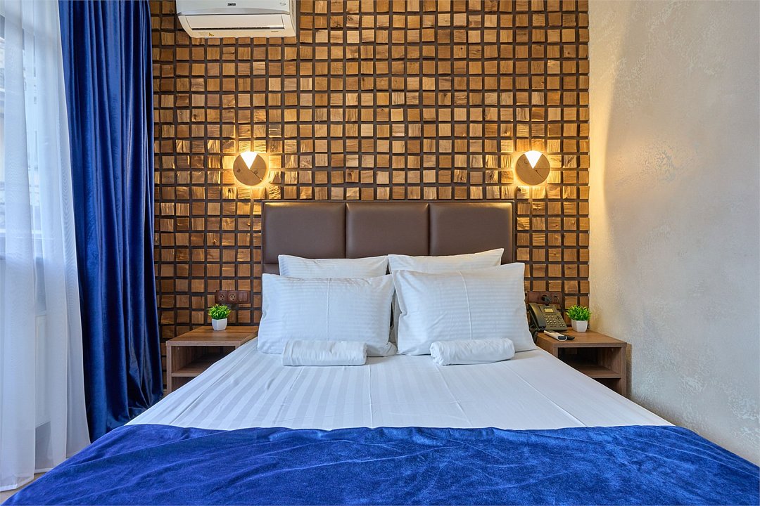 Стандартный двухместный номер предлагает уют и комфорт для двух человек. Небольшие по площади, от 13 до 16 квадратных метров номера, оформлены в теплых, приглушенных тонах с деревянными элементами в интерьере. Номера категории Стандарт оснащены всем необходимым для комфортного проживания. Из номеров открывается вид на улицу и город. Стандартный номер — это идеальный выбор для тех, кто ценит комфорт и практичность во время своего пребывания. Ванная комната в дизайнерском исполнении с современным душем полностью соответствует высоким стандартам комфорта. Для вашего комфортного проживания ежедневно у вас в номере зелёный и черный чай, а также кофе и сахар в индивидуальных упаковках. Халаты - предоставляются по запросу, платно (500 рублей за пользование халатом). Обращаем ваше внимание на то что фото номеров носят ознакомительный характер и являются иллюстрацией типа и категории номера, фактический цвет стен номера и деталей интерьера а также конфигурация, тип и набор предметов мебели могут отличаться от той что представлена на фотографиях. Также обращаем внимание на то что: - площадь номеров в каждой категории может варьироваться в пределах 3 квадратных метров,; - этажи на которых расположены номера могут варьироваться; - набор мебели может варьироваться (например в некоторых номерах могут быть стулья со спинкой а в некоторых номерах могут быть пуфики, в некоторых номерах могут быть небольшие сервировочные столики на колёсах а в некоторых номерах могут быть круглые столы на ножках и т.д.) Так же может отличаться вид открывающийся из номера, цвет штор цвет покрывала и саше.Услуги и удобства