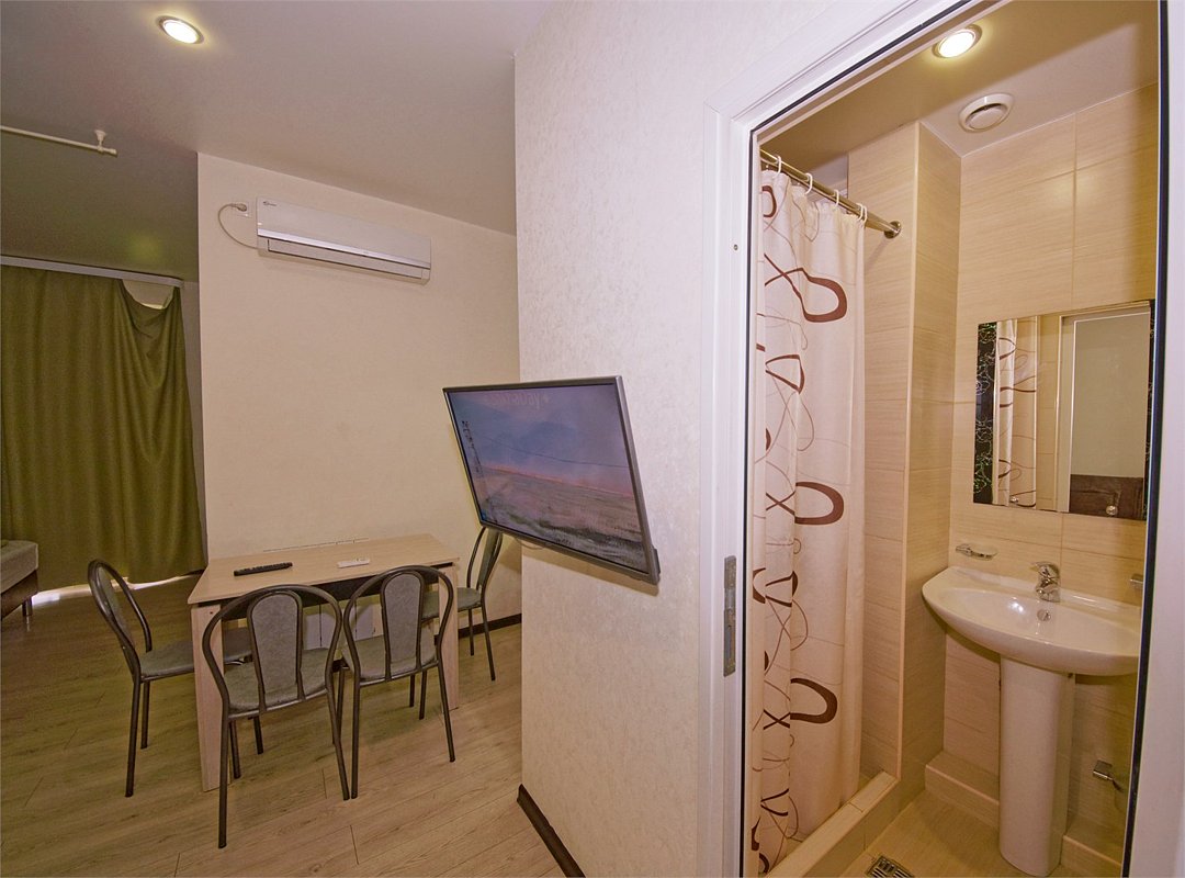 два телевизора, Wi-Fi, холодильник, кондиционер, фен, плита для приготовления пищи, банные полотенца, балкон, тумбы, стулья, шкаф для одежды, раковина, душ, стол, туалет, вешалки-плечикиВ апартаментах