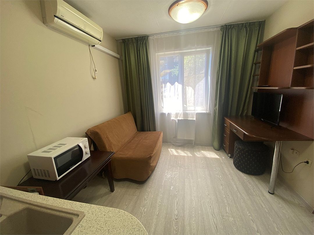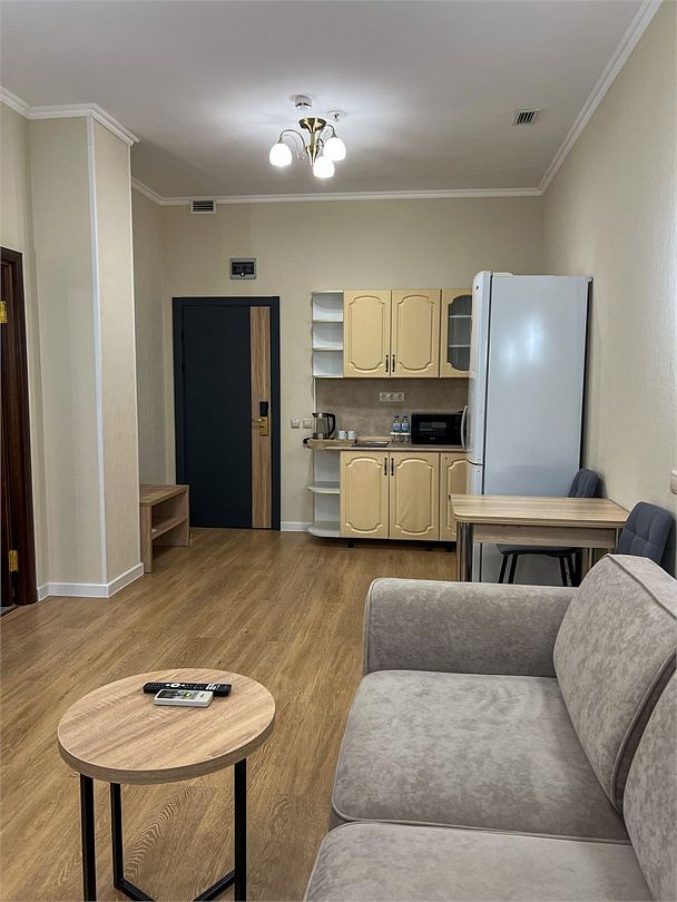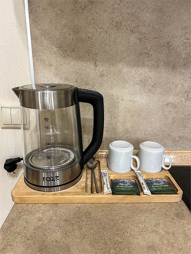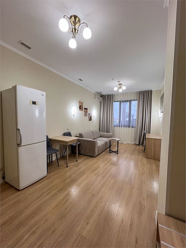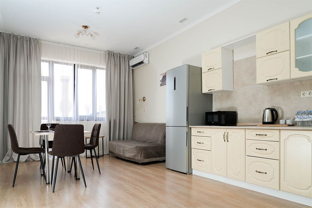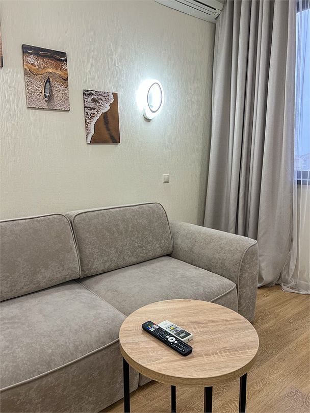 В номере: Гостиная — большой диван кровать, столик, телефон, телевизор, сплит-система, кухня, холодильник, чайник, микроволновая печь.