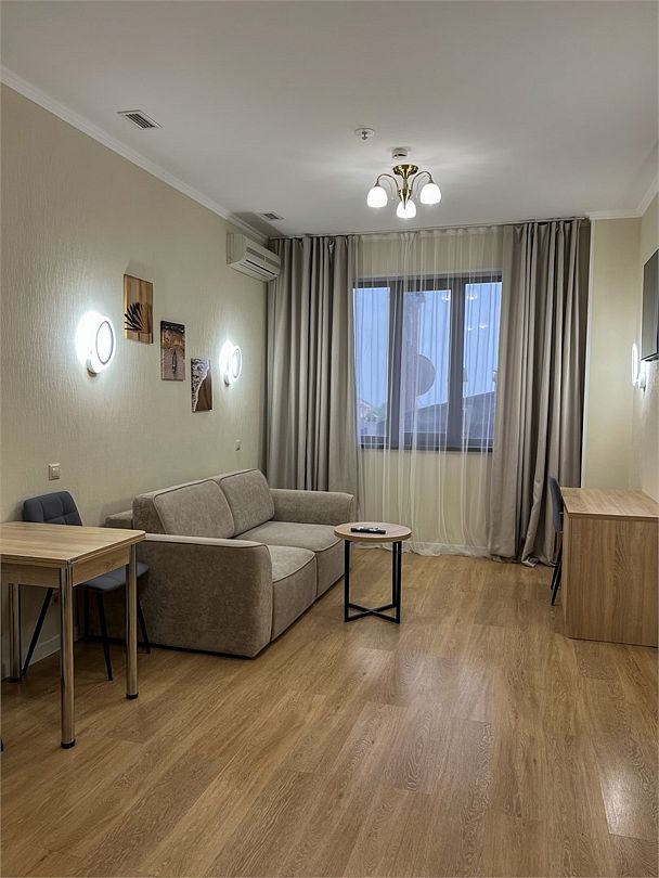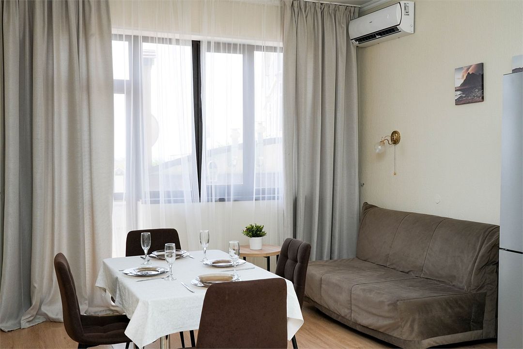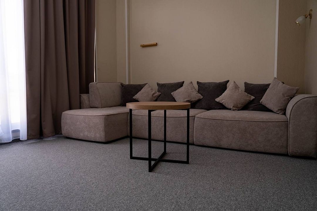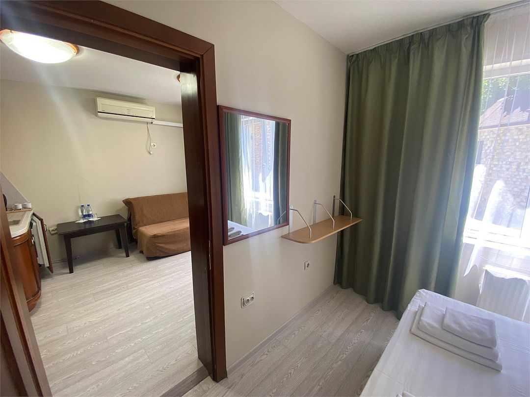 2-х местный 2-х комнатный номер «ЛЮКС» без балкона, вид на горы, 2-5 этаж. В номере: Гостиная с кухней - большой диван кровать, журнальный стол, телевизор, телефон, холодильник, микроволновая печь, кухонный гарнитур, чайник, стол, сплит-система, туалет.