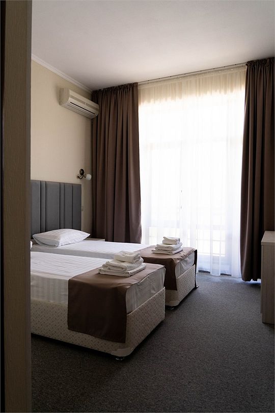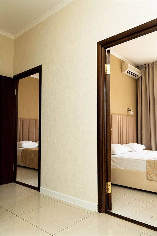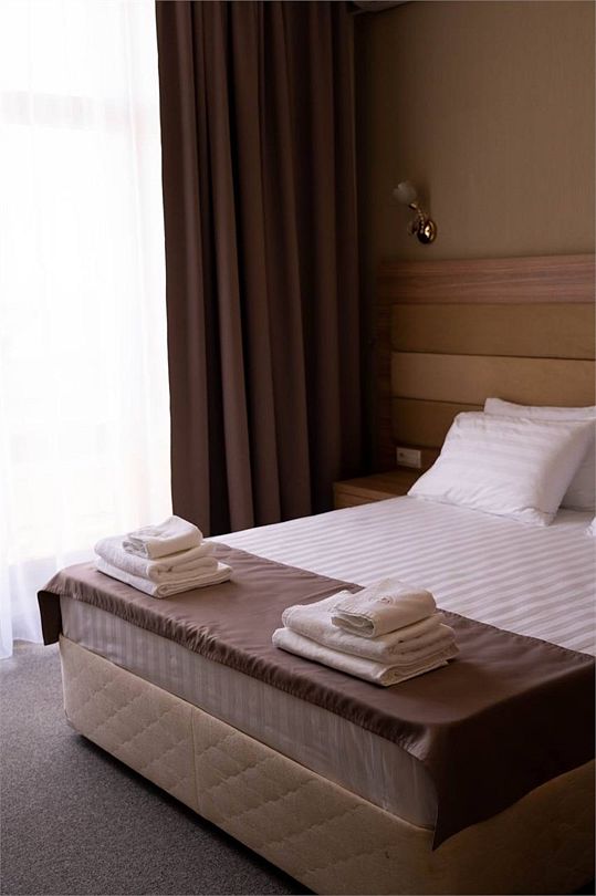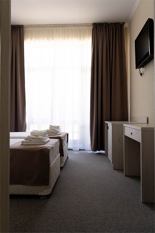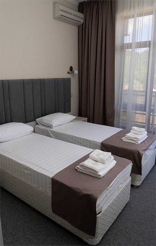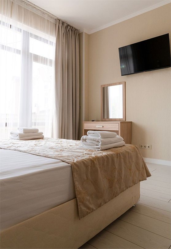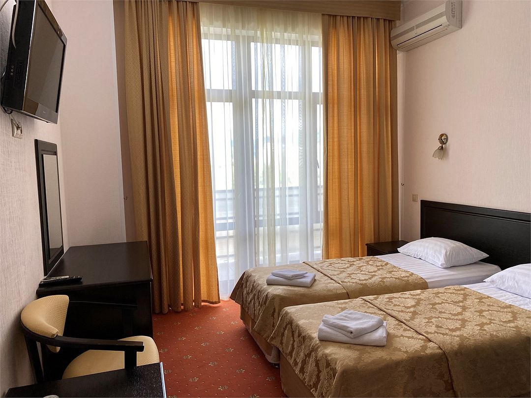 В номере — двуспальная или 2 раздельные кровати, 2 прикроватные тумбочки, столик с зеркалом, шкаф для одежды, сплит-система, телефон, телевизор, мини холодильник, фен, санузел, предусмотрено дополнительное место (одноместный диван), балкон, сушилка для белья, полотенце, мыло/шампунь.